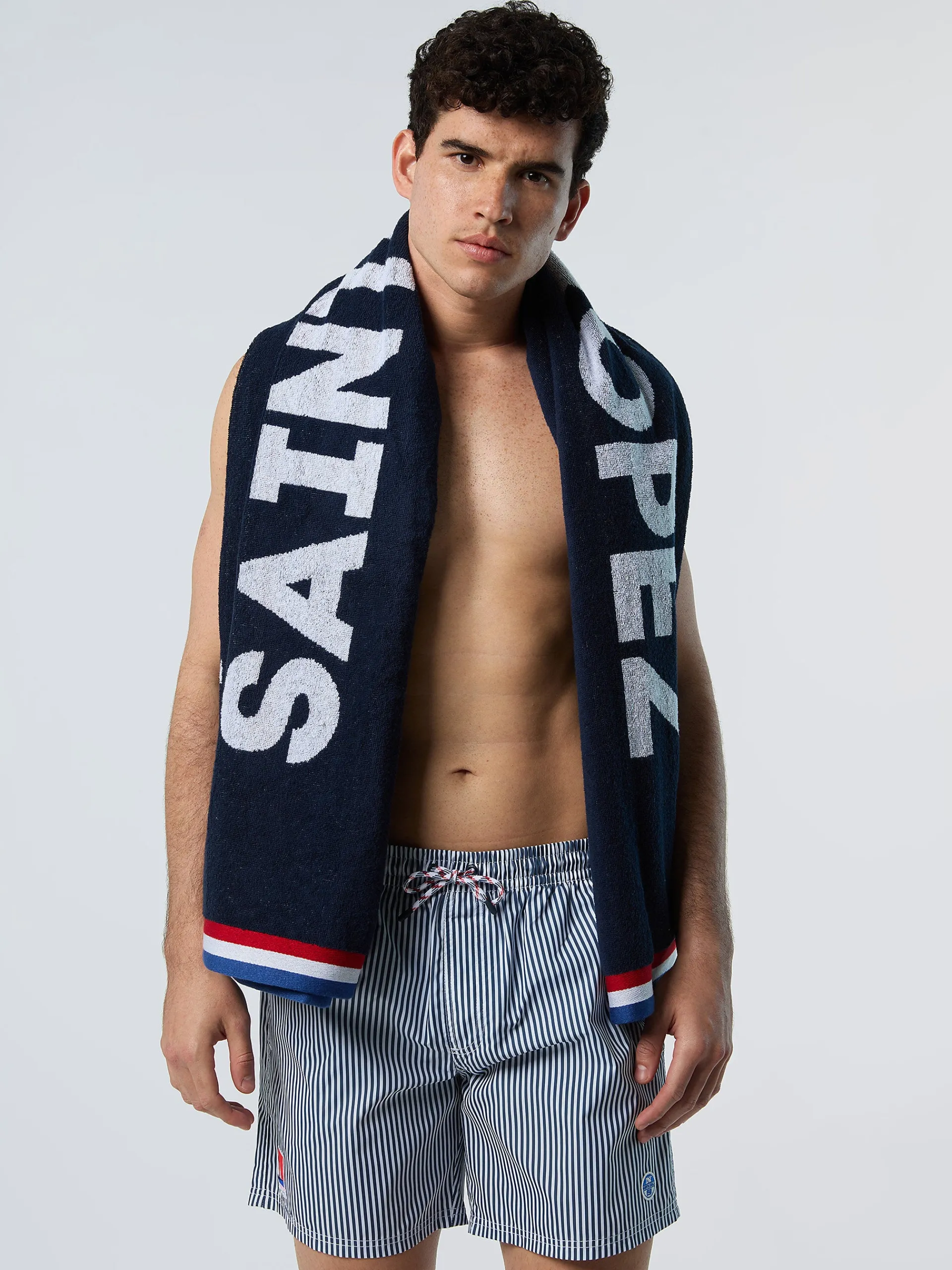 Boxer mare della capsule collection Les Voiles de Saint-Tropez, dedicata alla storica regata del Mediterraneo. Il modello coniuga stile e rispetto per l'ambiente perchè è realizzato in poliestere riciclato che riduce la quantità di rifiuti. Si caratterizza per la stampa del logo LVDST 2023 sulla tasca posteriore e la label ufficiale dell'evento sulla gamba destra per un tocco ultra esclusivo.