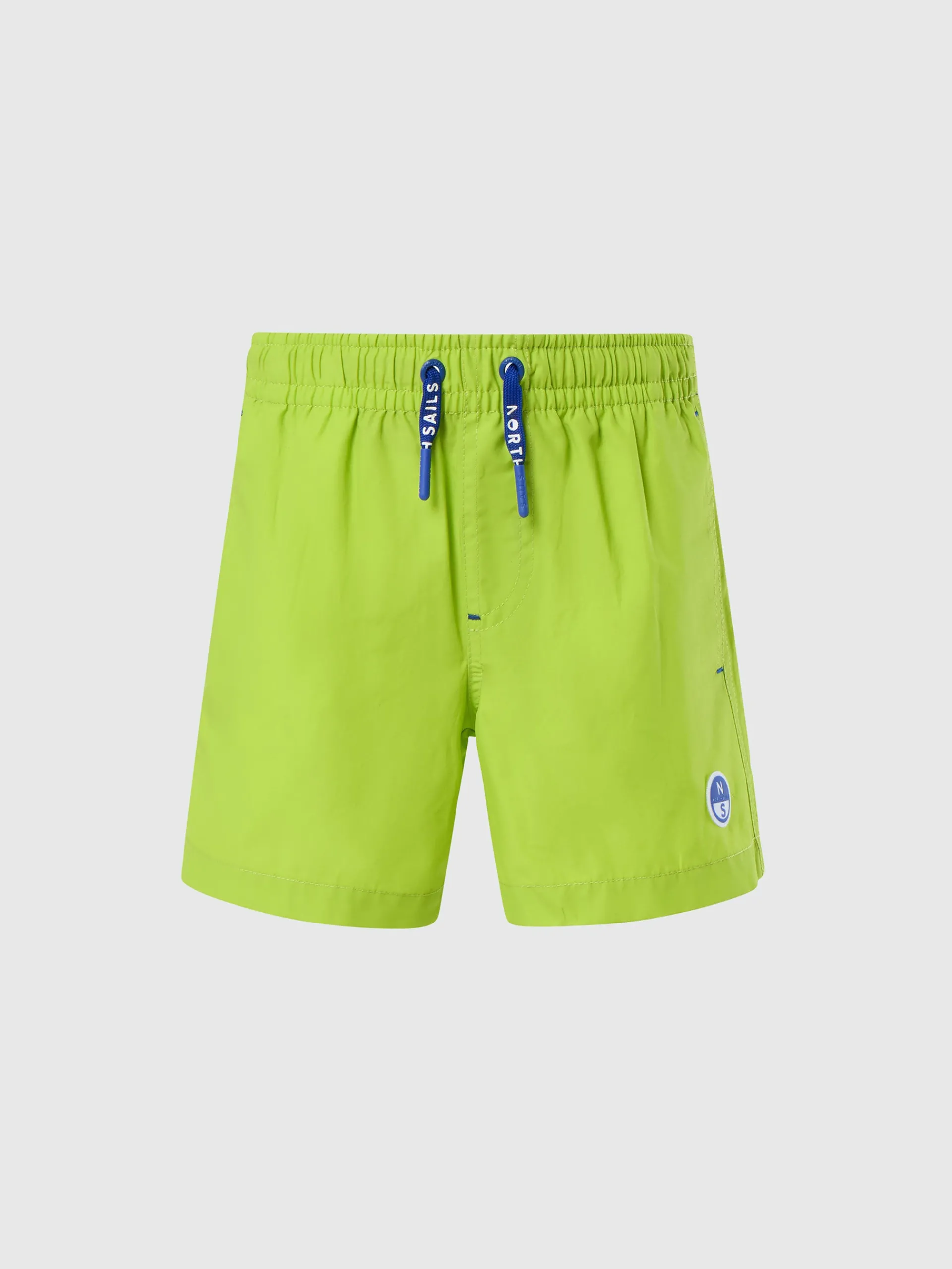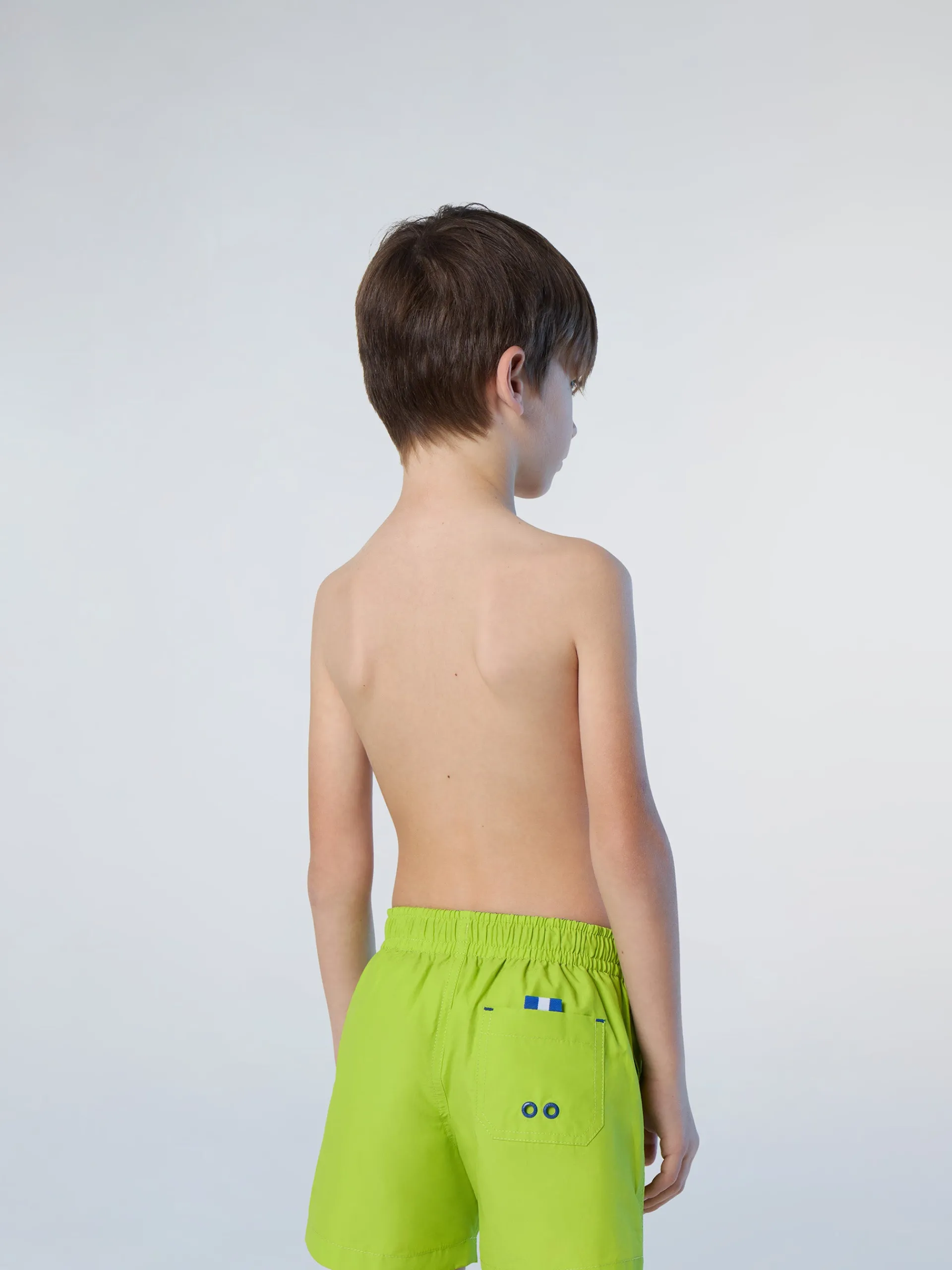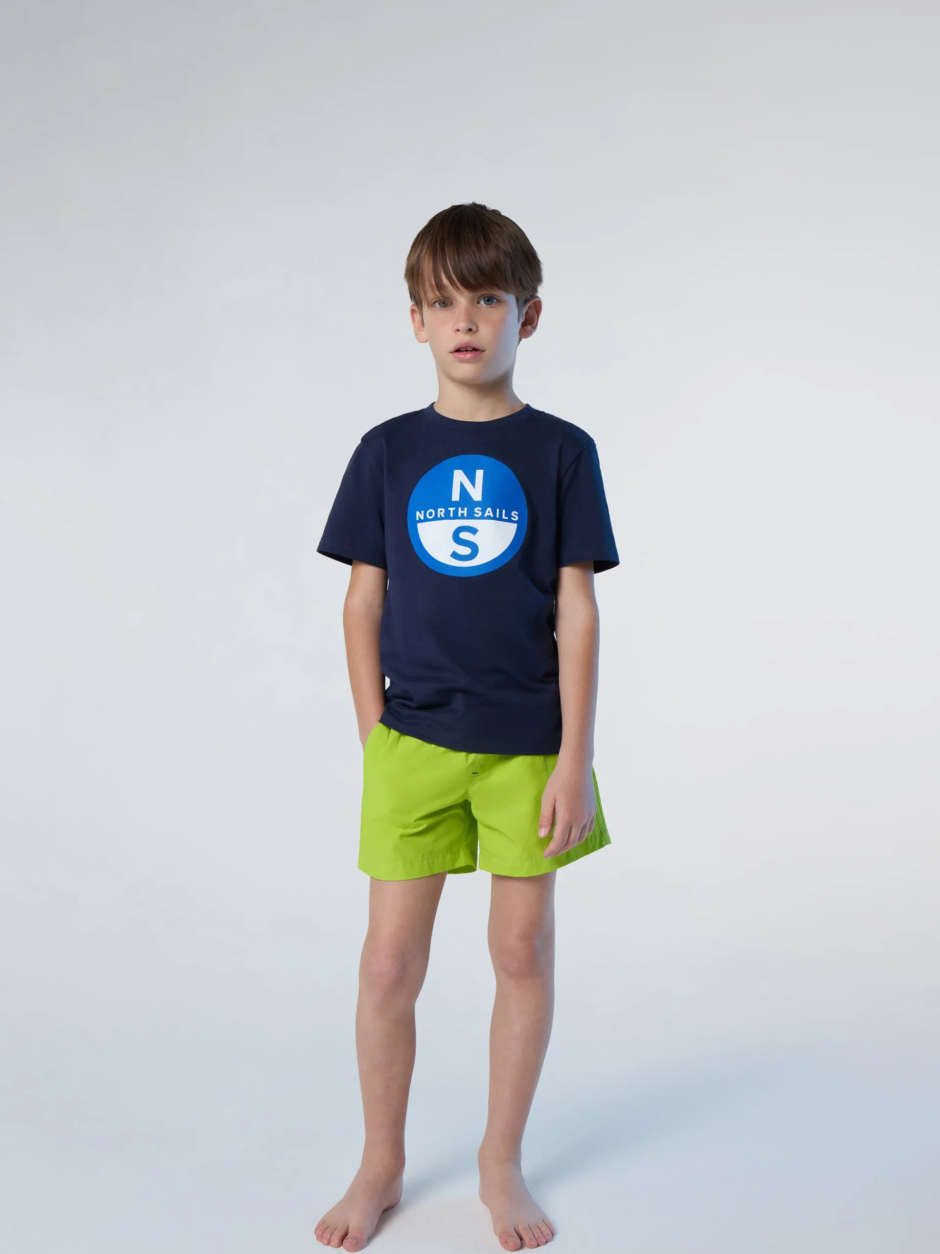 Questi boxer mare in stile volley sono i protagonisti dei look da spiaggia dei bambini. Il modello è realizzato in cotone e nylon riciclato che rispetta il pianeta perchè riduce la quantità di rifiuti dispersi nell'ambiente. Si caratterizza per l'interno del punto vita dal colore a contrasto con lettering North Sails. Rifinito con coulisse logata e patch classica sulla gamba.