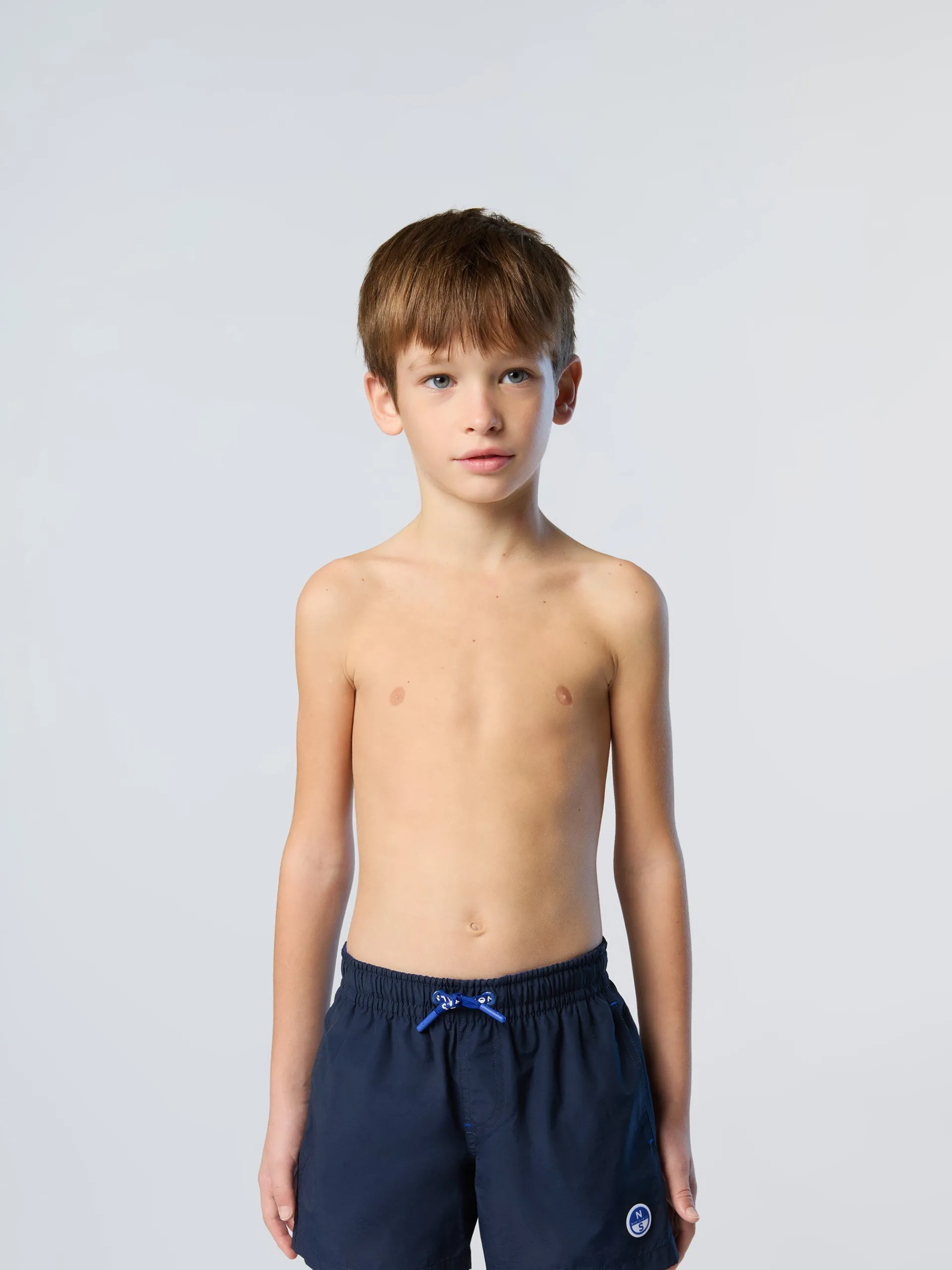 Questi boxer mare in stile volley sono i protagonisti dei look da spiaggia dei bambini. Il modello è realizzato in cotone e nylon riciclato che rispetta il pianeta perchè riduce la quantità di rifiuti dispersi nell'ambiente. Si caratterizza per l'interno del punto vita dal colore a contrasto con lettering North Sails. Rifinito con coulisse logata e patch classica sulla gamba.