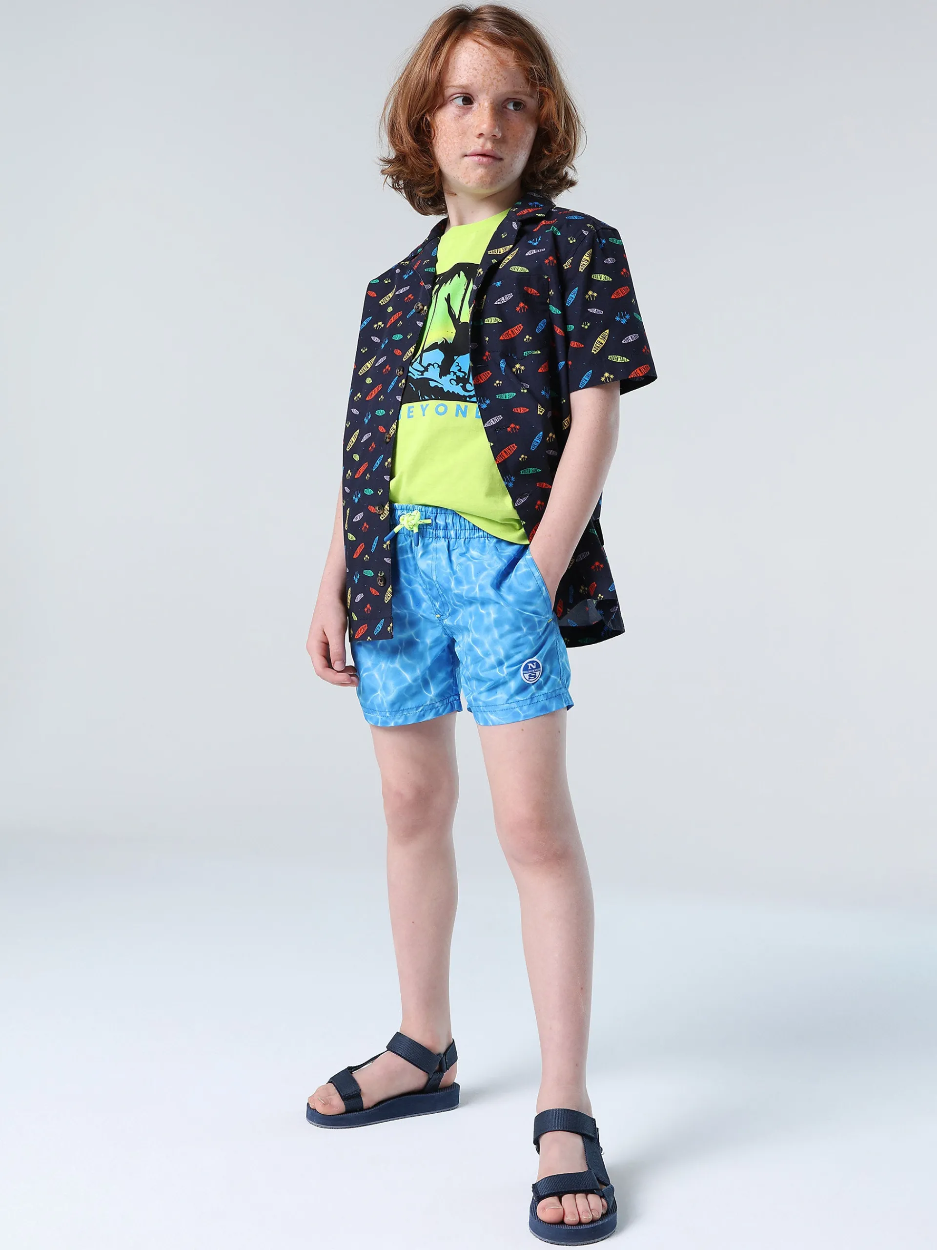Questi boxer mare con stampa vivace all over aggiungeranno un tocco giocoso al guardaroba mini me delle vacanze. Il modello è realizzato in poliestere riciclato a basso impatto ambientale, trattato con un finish ad asciugatura rapida. L'interno della vita dal colore a contrasto e la coulisse aggiungono un tocco grafico deciso.