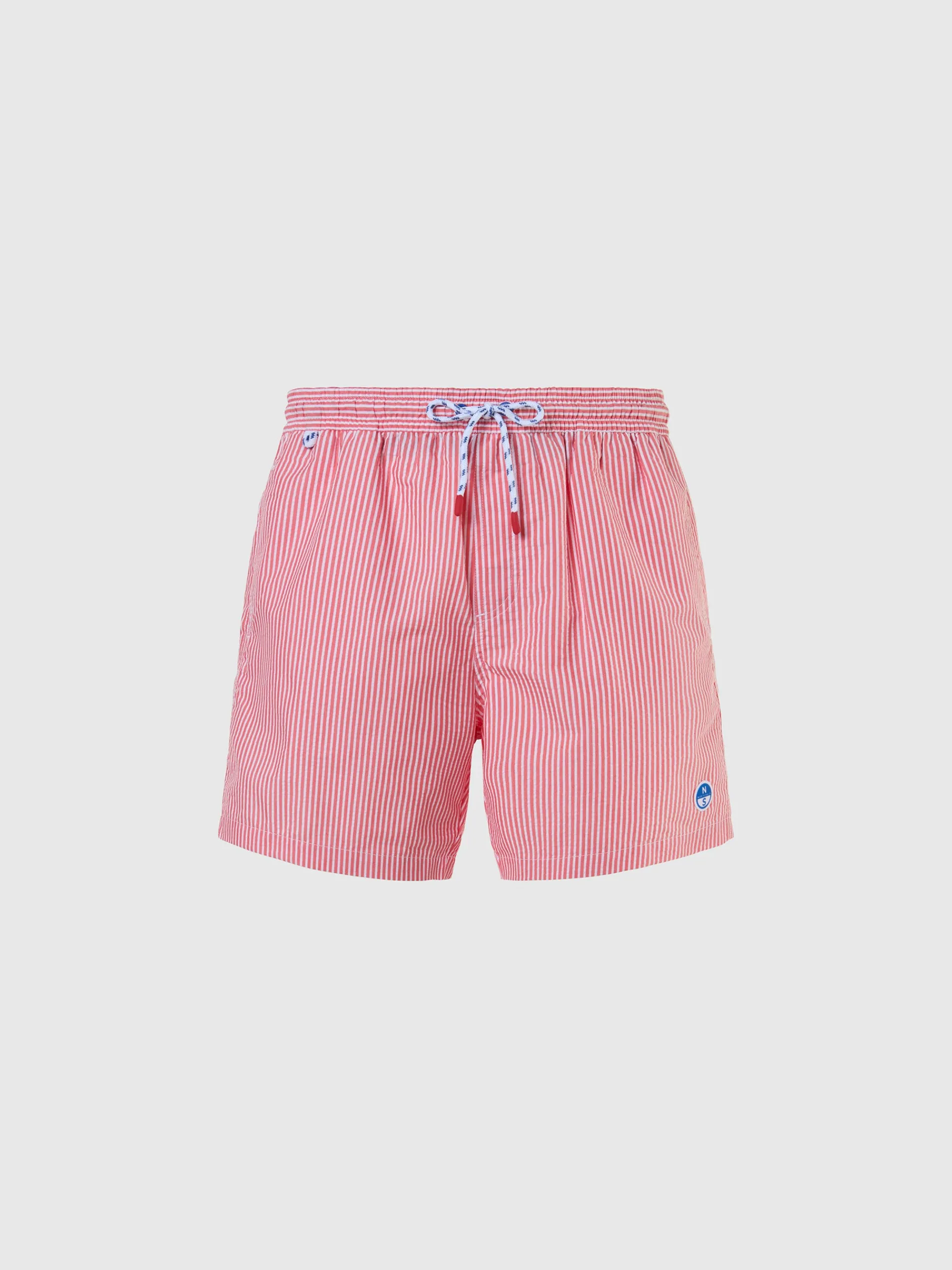 Questi boxer mare sono ideali per le uscire in barca, il relax in spiaggia e in piscina. Il modello è realizzato in seersucker con la classica stampa a righe che richiama il nostro heritage legato alla vela. La texture unisce cotone e poliestere riciclato per un effetto morbido, leggero e traspirante. Rifinito con la tasca sul retro e il logo North Sails sulla gamba.