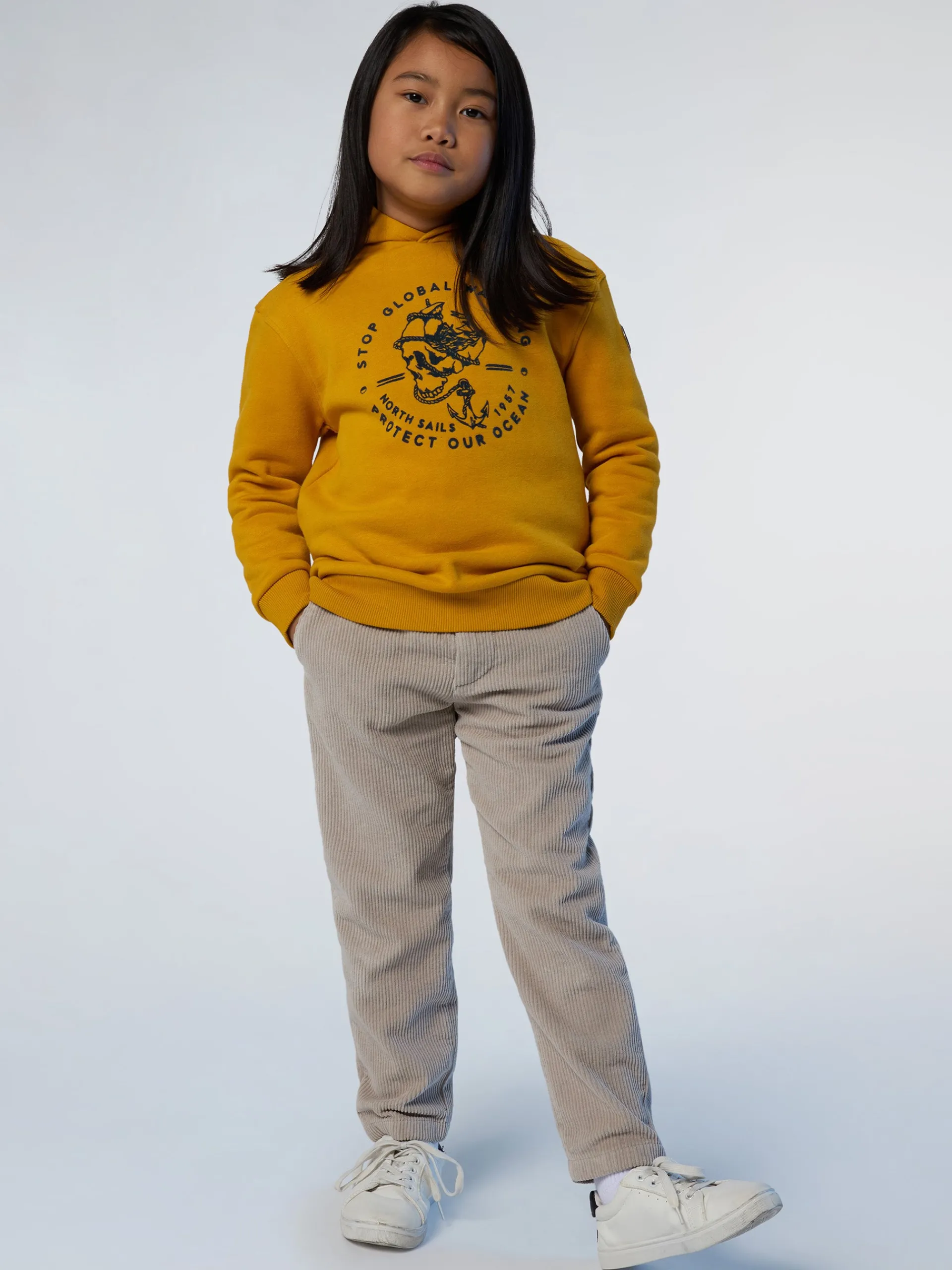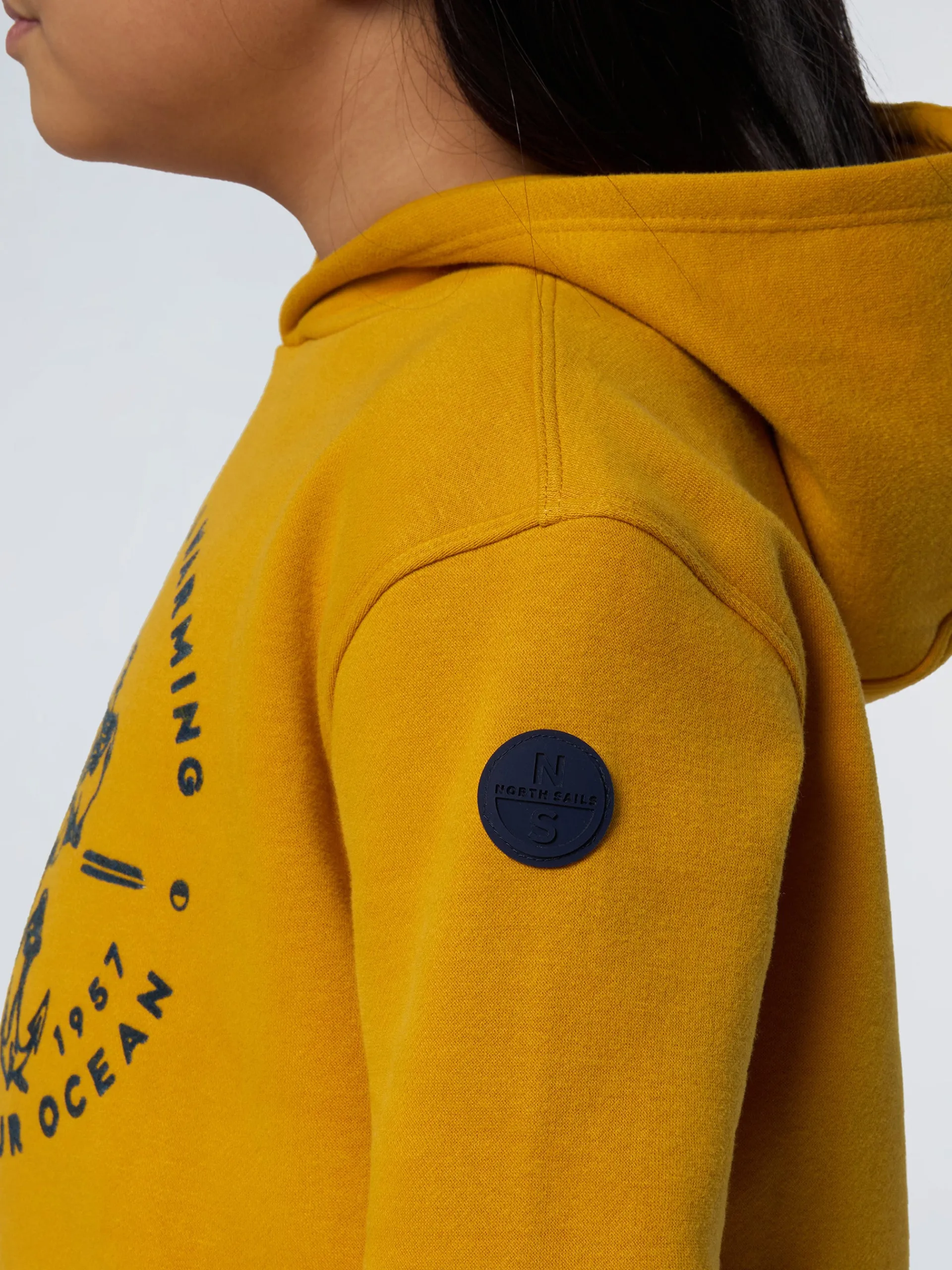 Questa felpa con cappuccio rende omaggio alla storia e alla mission North Sails. Il modello è realizzato in cotone organico mano pesca, morbido sulla pelle e attento al pianeta perché riduce le emissioni e il consumo d'acqua rispetto alle fibre tradizionali. La maxi stampa dà un imprinting deciso al look.