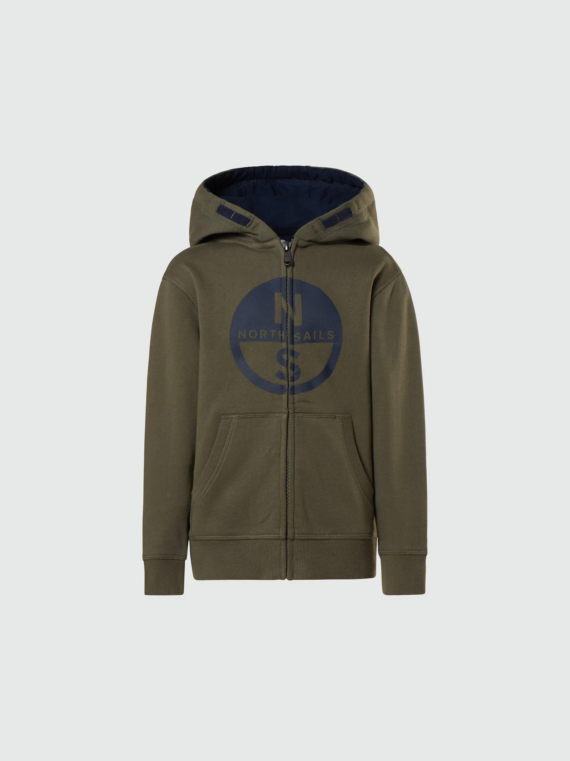 Perfetta per i look a strati e per passare rapidamente dall'indoor all'outdoor, questa felpa con zip è progettata per il dinamismo dei bambini. Il modello è realizzato in cotone organico, morbido sulla pelle e gentile con il pianeta. Il cappuccio e la chiusura con zip offrono massima funzionalità, mentre il maxi logo North Sails è una vera dichiarazione di stile.