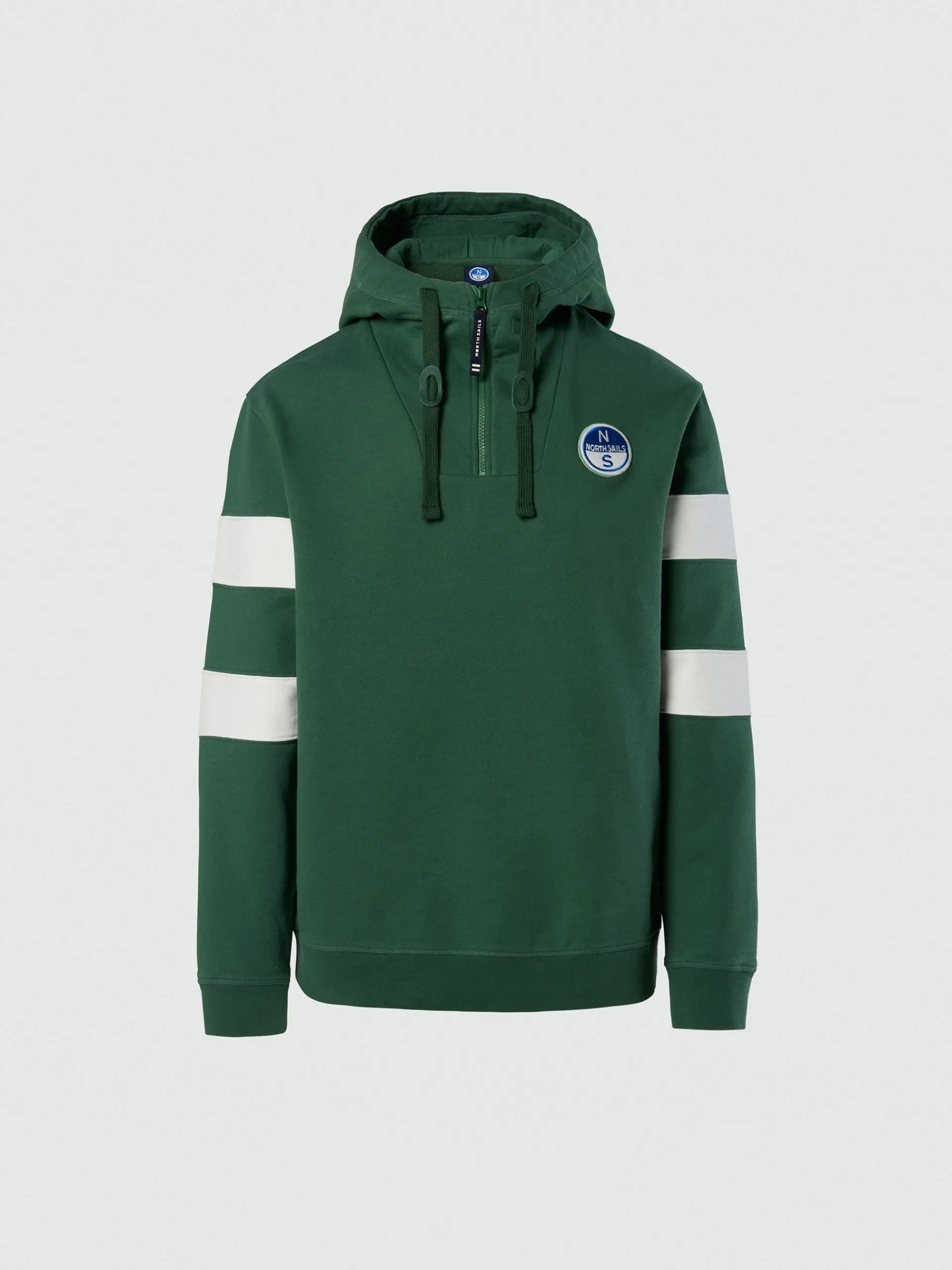 North Sails rende speciale un basic del guardaroba quotidiano. Questa felpa con cappuccio è realizzata in cotone organico estremamente morbido sulla pelle e gentile con il pianeta perché riduce le emissioni e il consumo di acqua rispetto alle fibre tradizionali. Si caratterizza per la mezza zip logata, l'intarsio a righe sulle maniche e la maxi patch sul petto.