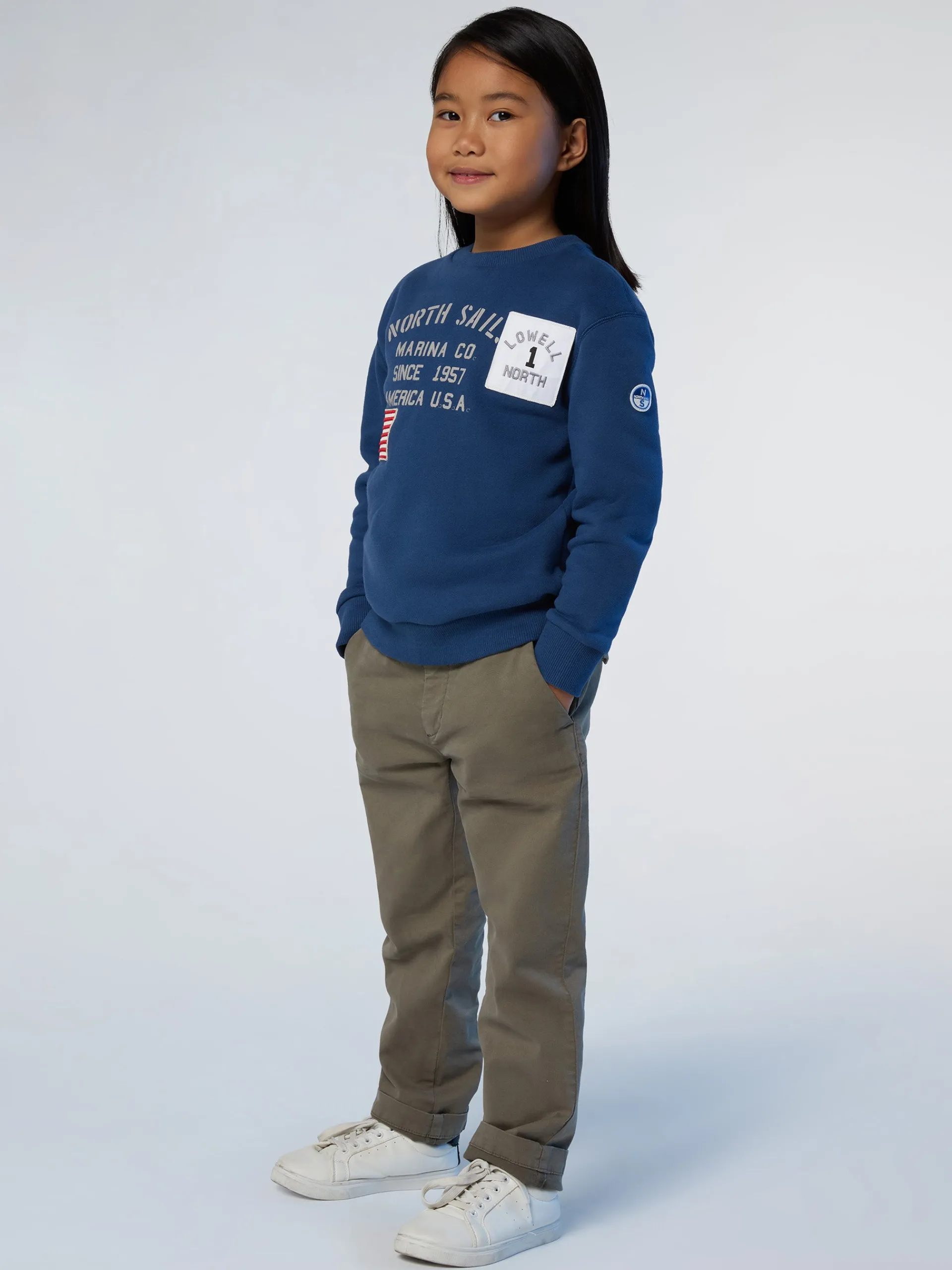 Questa felpa girocollo da bambino unisce richiami vintage e spirito eco conscious. Il modello è realizzato in cotone organico ed è impreziosito con patch vintage in tessuto riciclato che conferma il nostro impegno per il consumo circolare. La stampa North Sails sul davanti è un omaggio al mondo della vela.