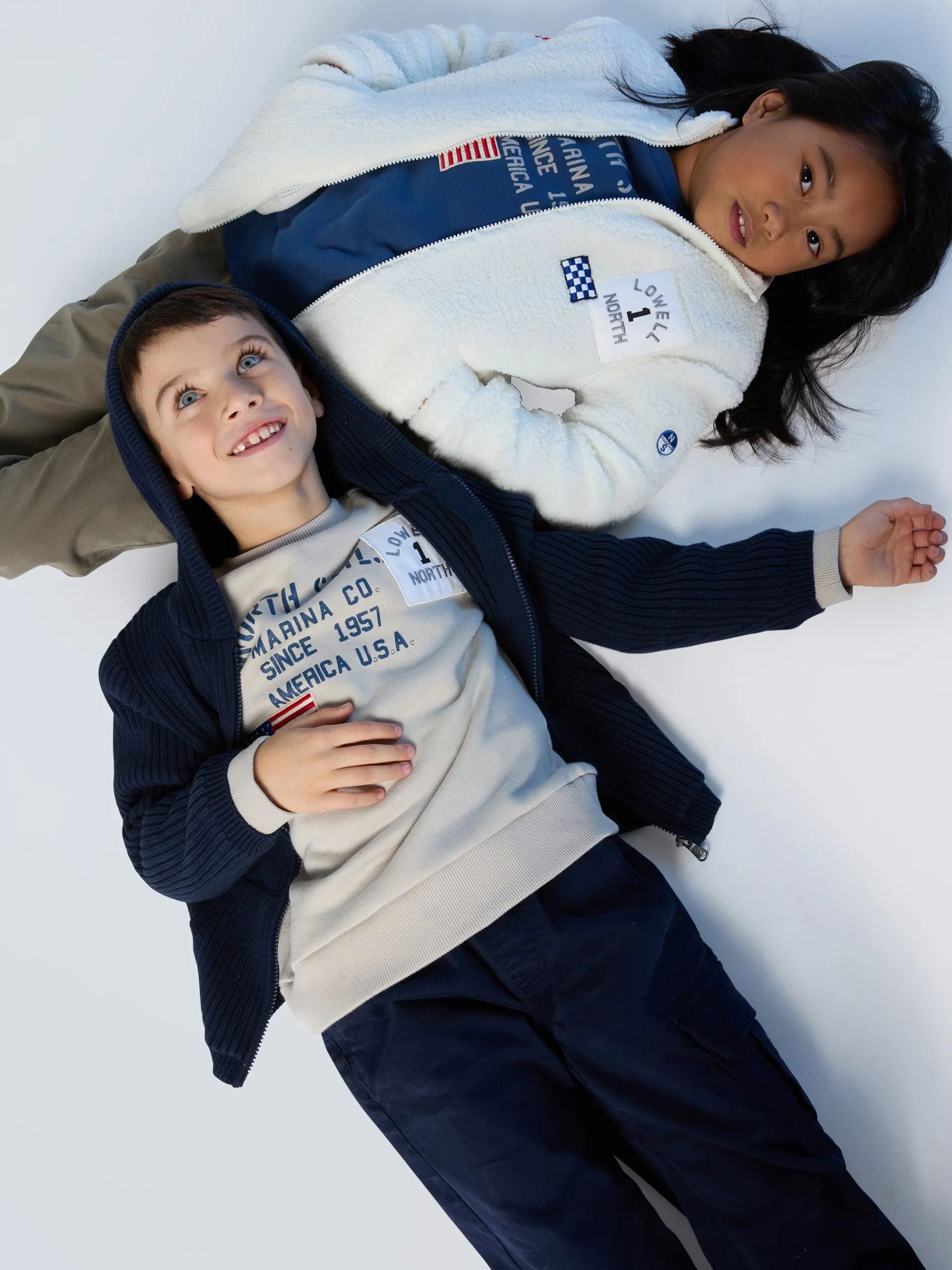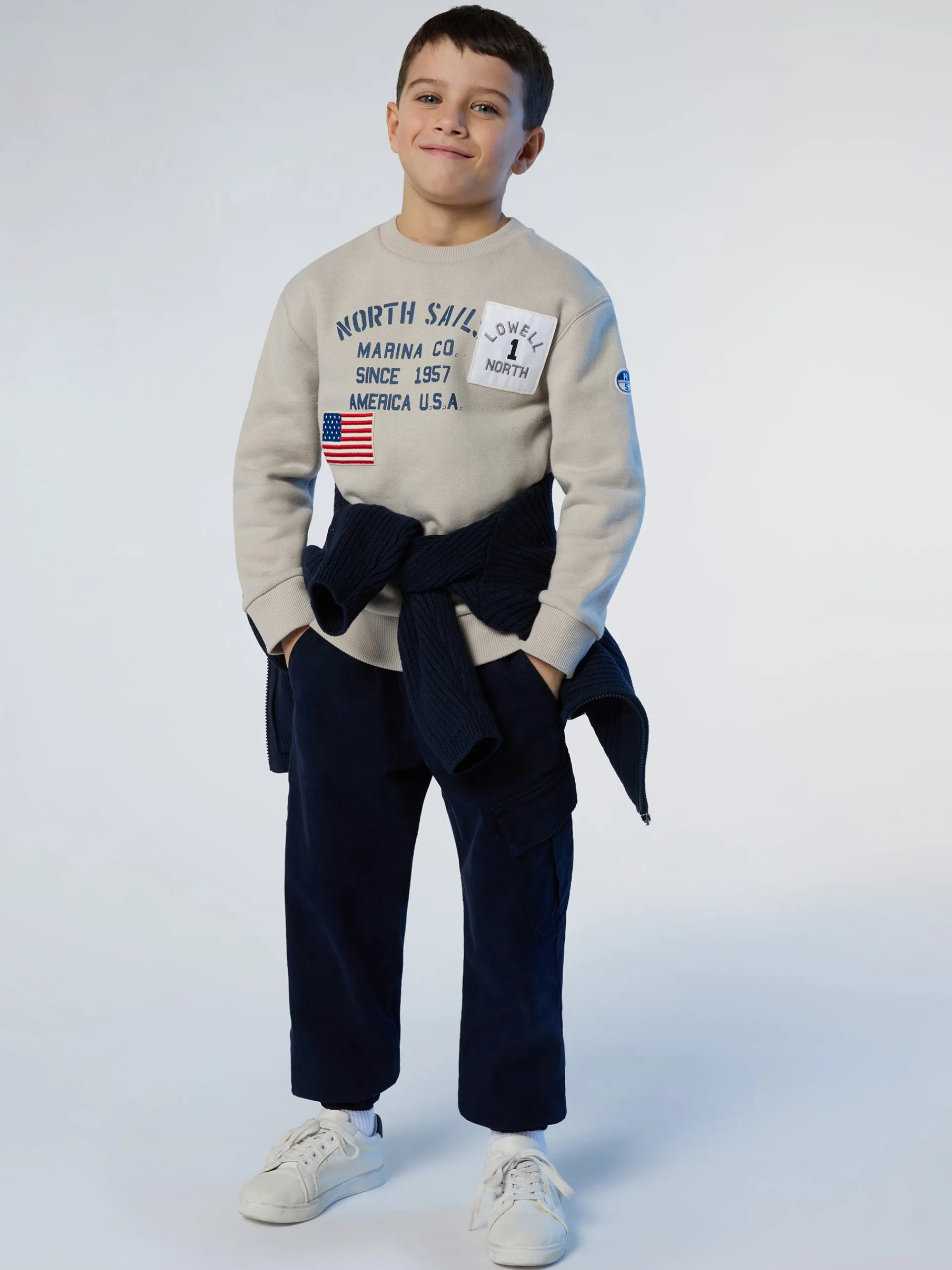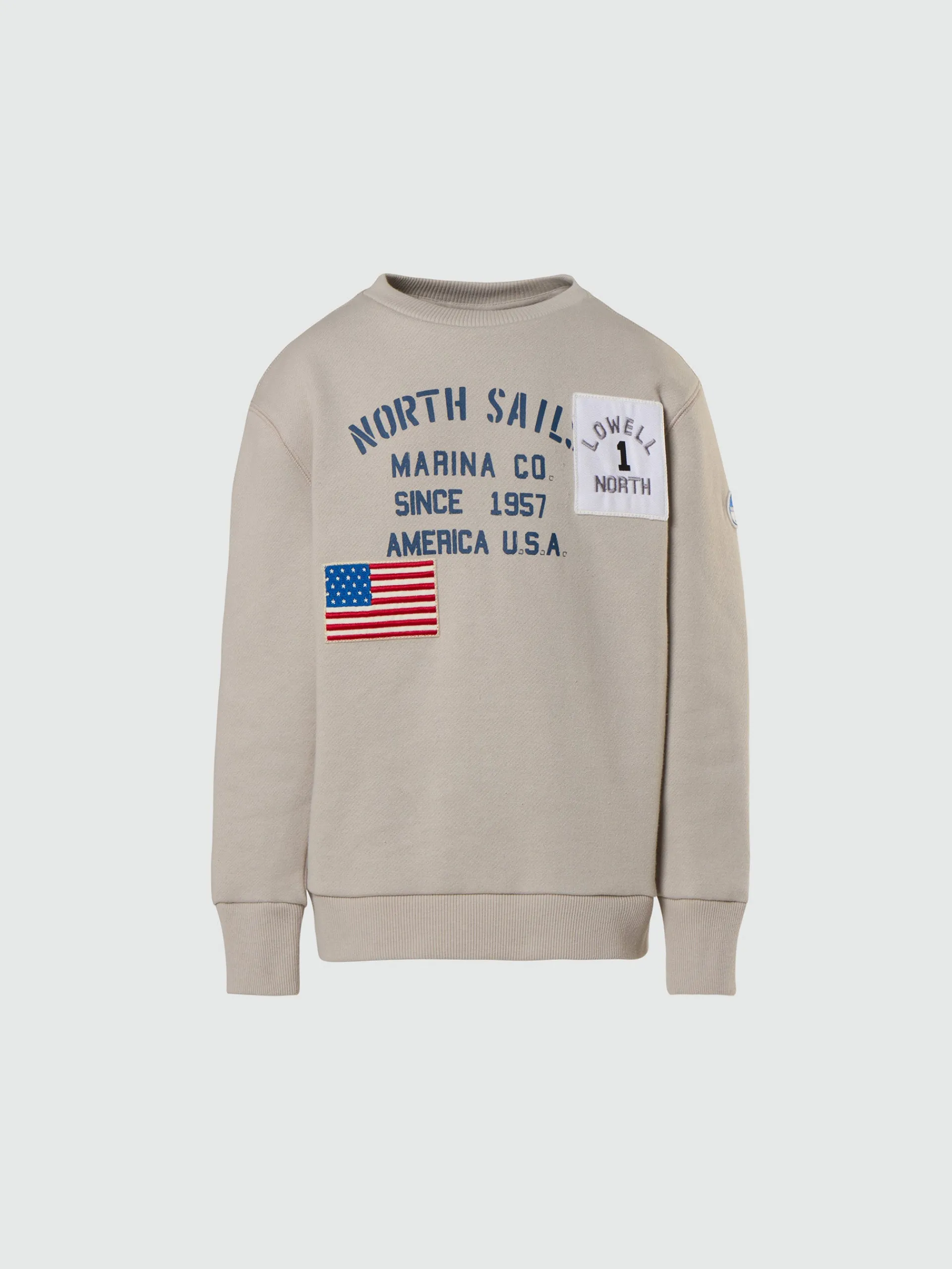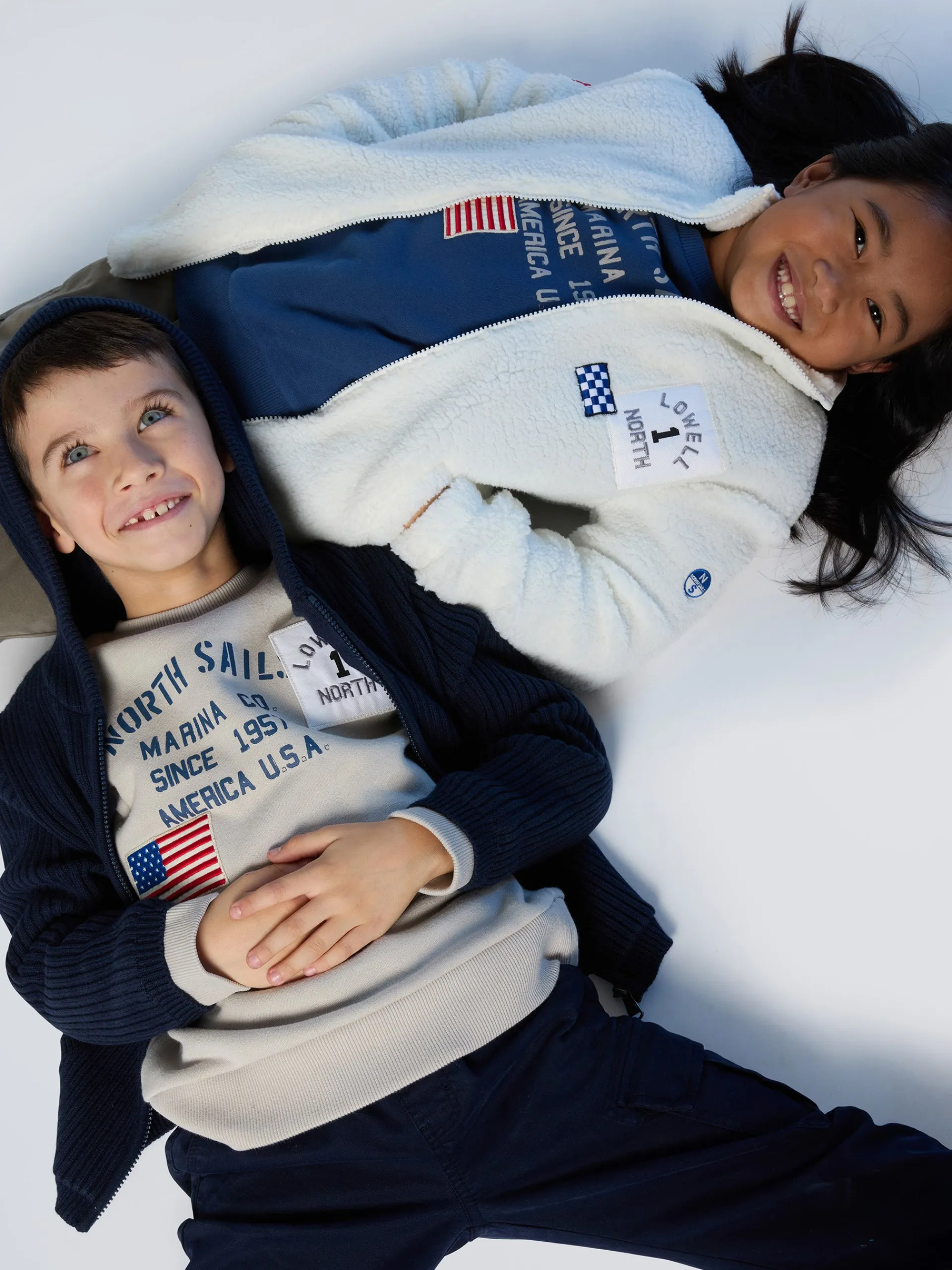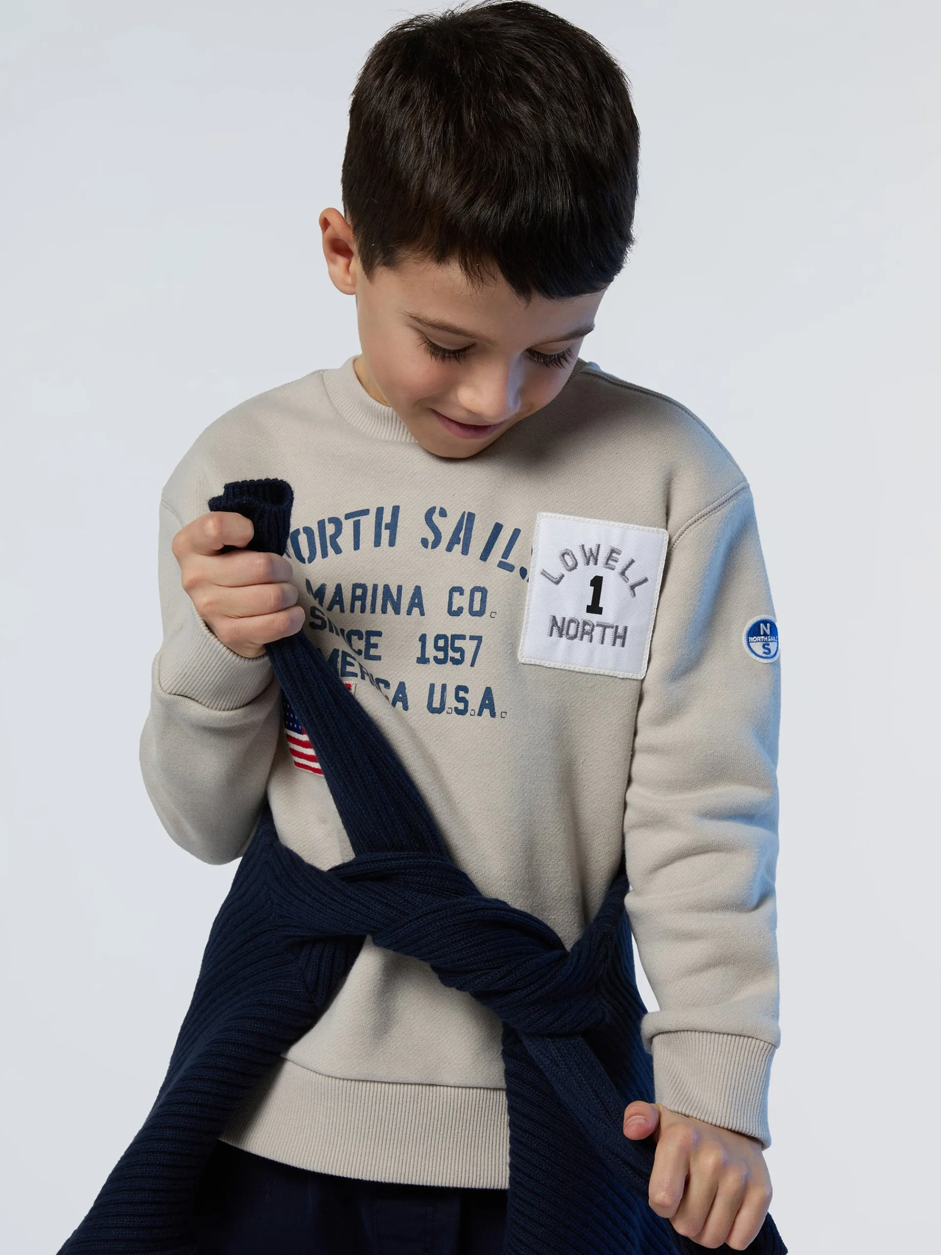 Questa felpa girocollo da bambino unisce richiami vintage e spirito eco conscious. Il modello è realizzato in cotone organico ed è impreziosito con patch vintage in tessuto riciclato che conferma il nostro impegno per il consumo circolare. La stampa North Sails sul davanti è un omaggio al mondo della vela.