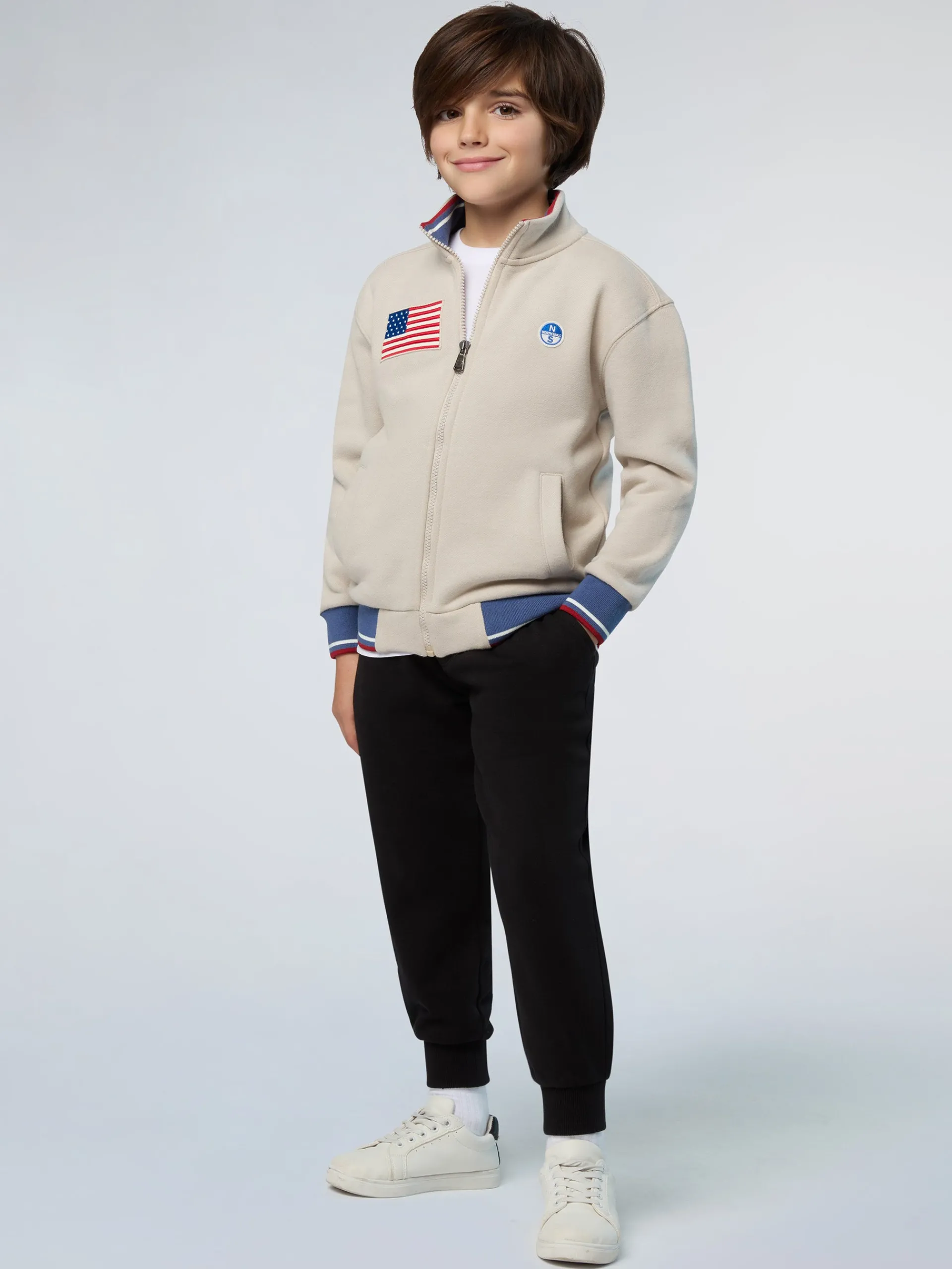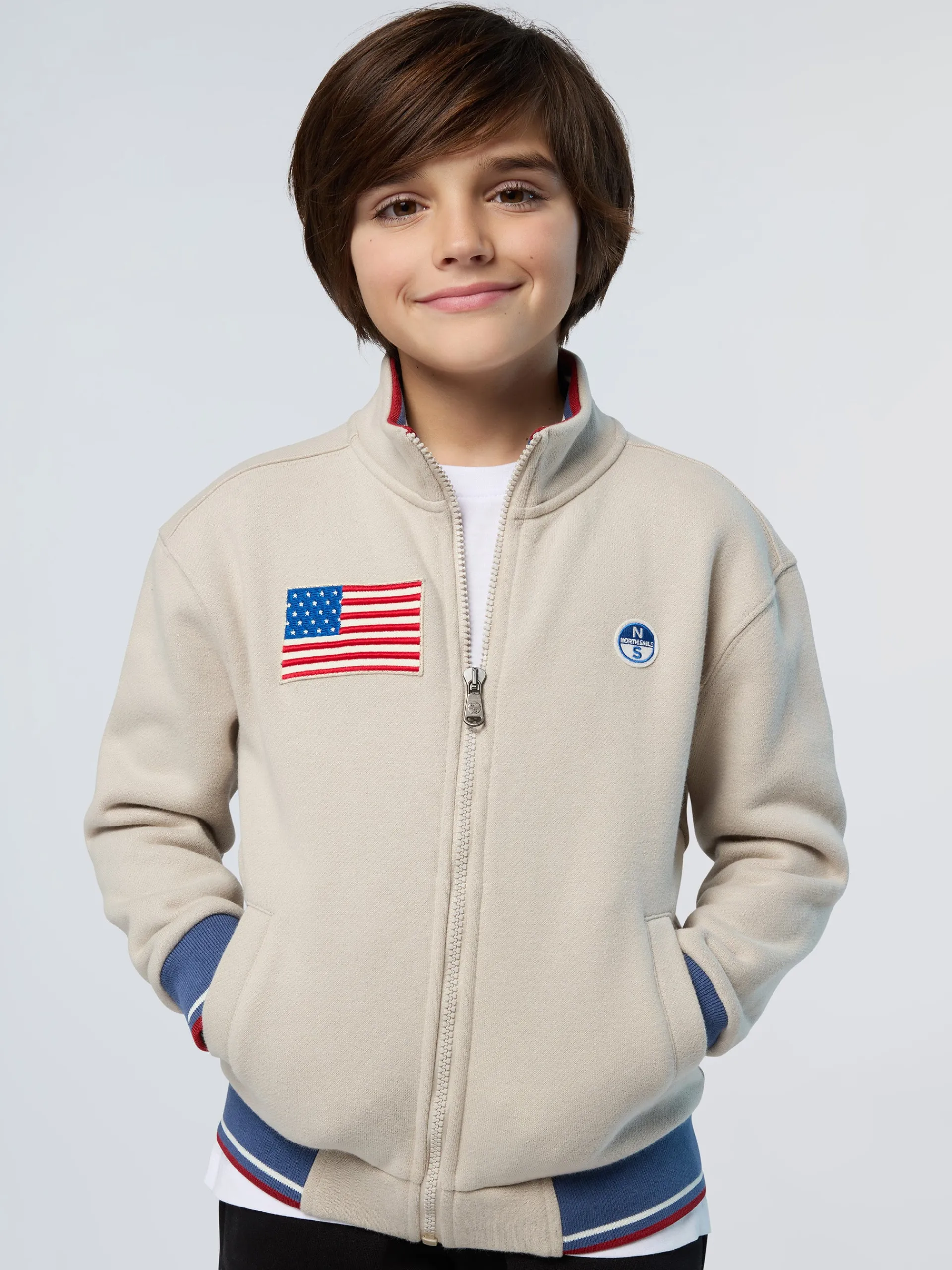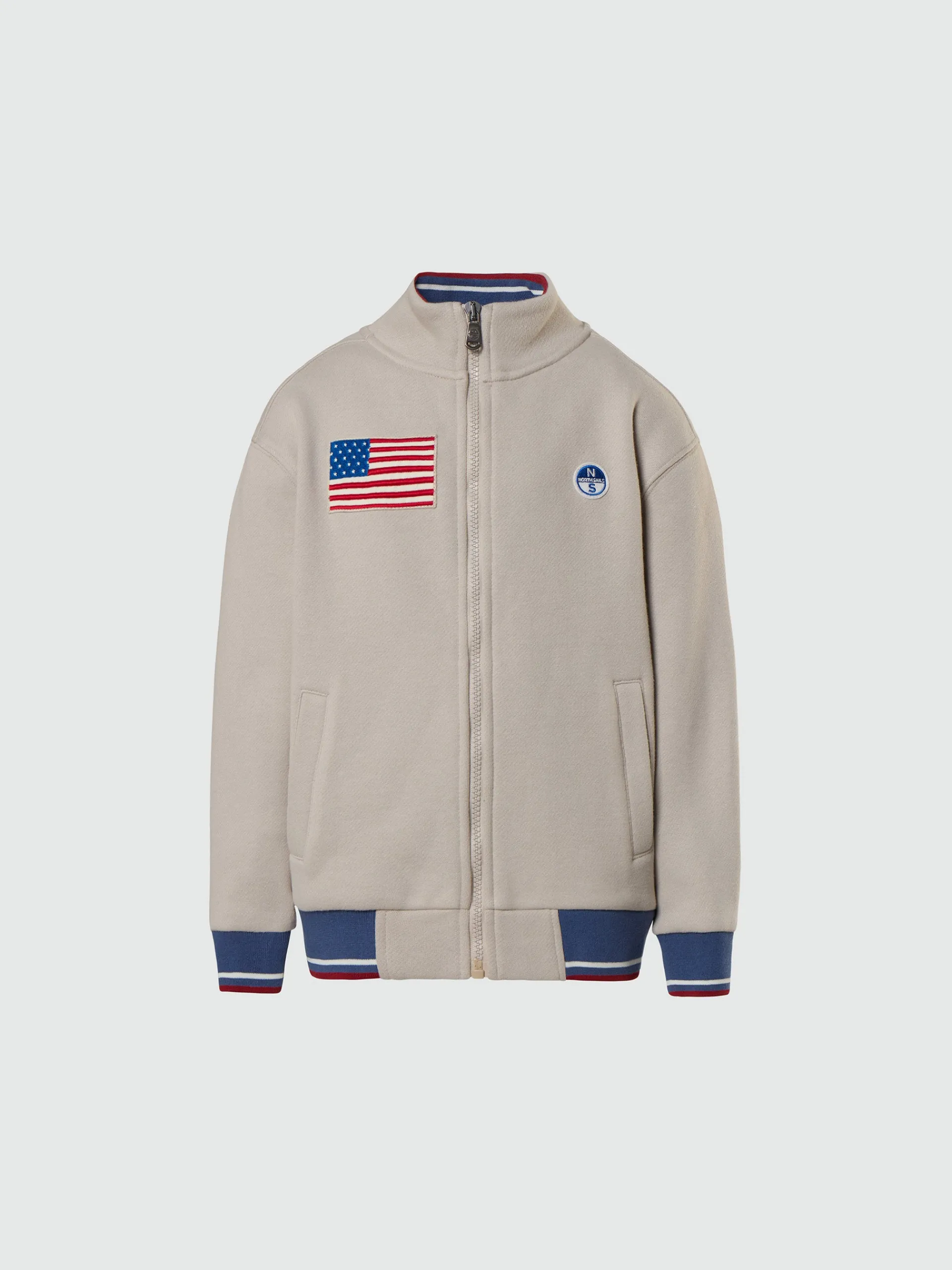 Questa felpa in cotone organico è perfetta per i giorni di scuola e il tempo libero. Il modello è impreziosito con la patch della bandiera americana in tessuto riciclato che conferma il nostro impegno per il consumo circolare. Il collo alto e la chiusura con zip rendono il capo comodo da indossare e abbinare a t-shirt o camicie per costruire look a strati.
