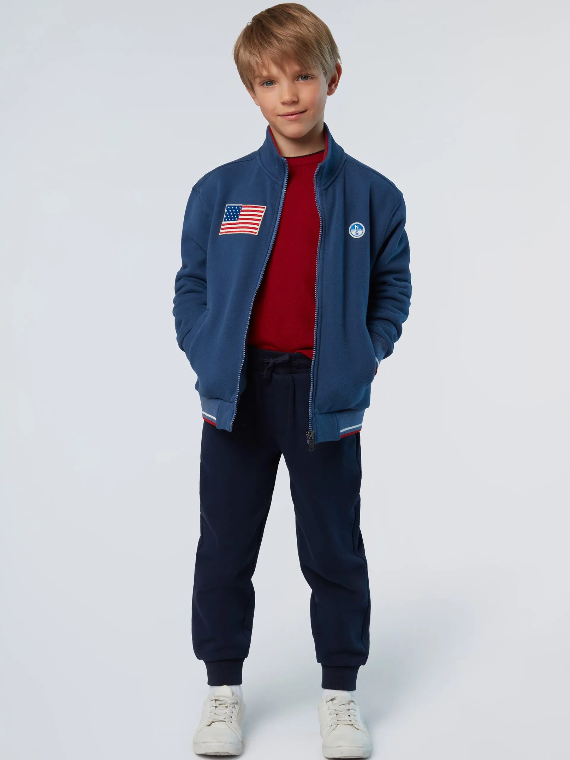 Questa felpa in cotone organico è perfetta per i giorni di scuola e il tempo libero. Il modello è impreziosito con la patch della bandiera americana in tessuto riciclato che conferma il nostro impegno per il consumo circolare. Il collo alto e la chiusura con zip rendono il capo comodo da indossare e abbinare a t-shirt o camicie per costruire look a strati.