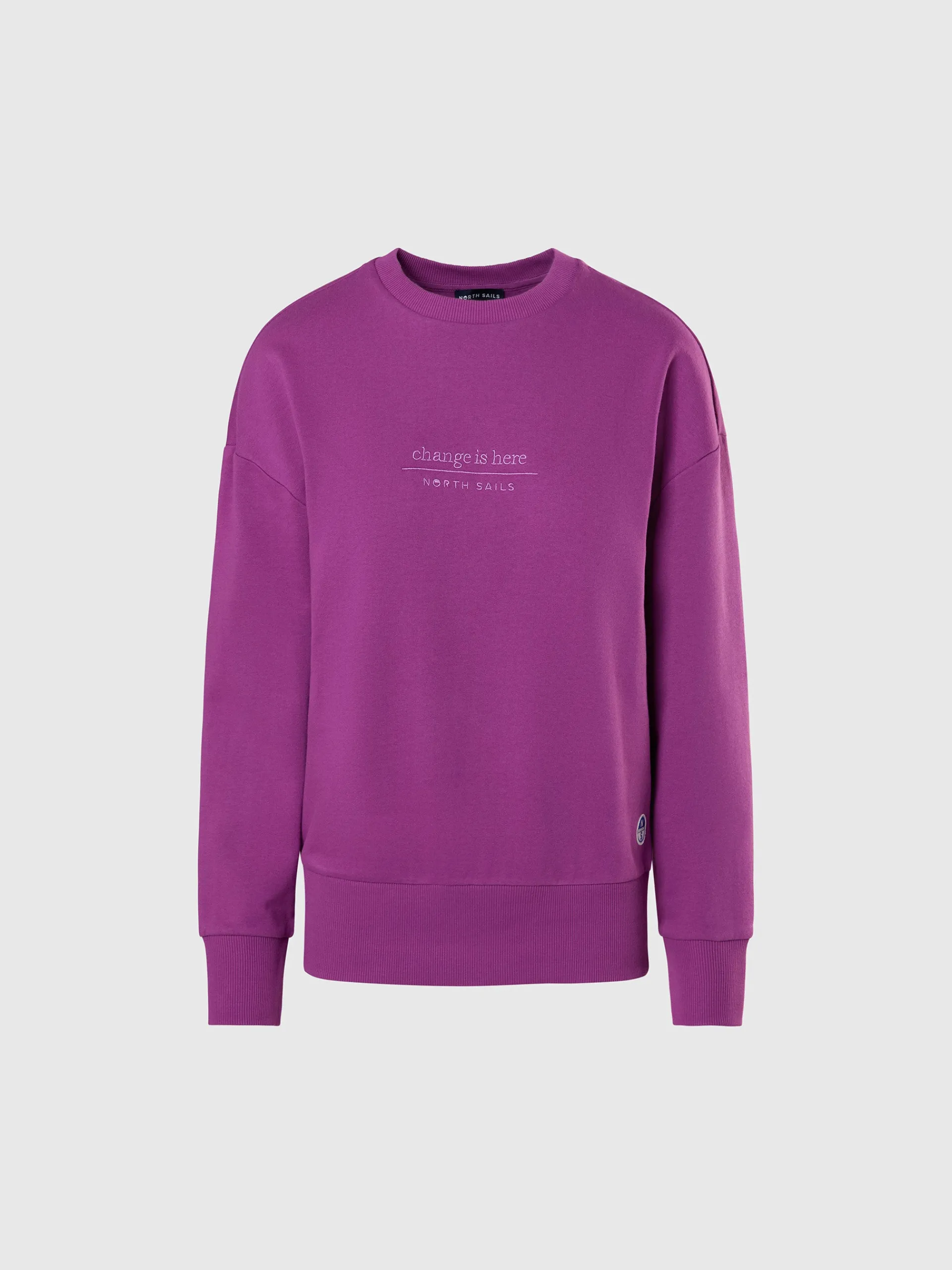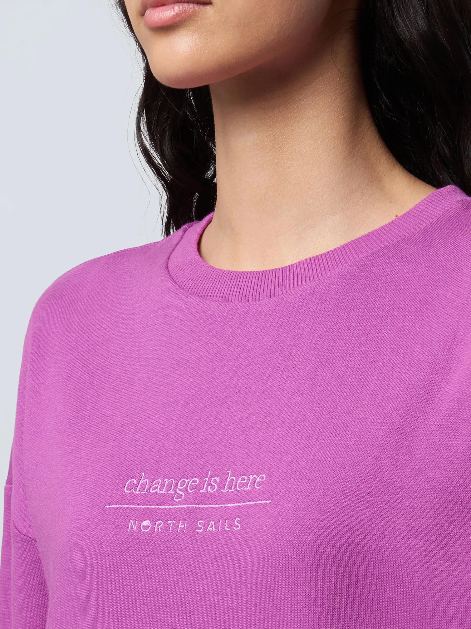 Change is here! Partecipa al cambiamento e dichiara il tuo impegno per il pianeta con questa felpa in cotone. Il modello è un'aggiunta chic del guardaroba quotidiano e si caratterizza per la vestibilità boxy con fondo alto a costine e maniche a giro basso. Slogan ricamato sul davanti e patch iconica North Sails applicata al fondo.