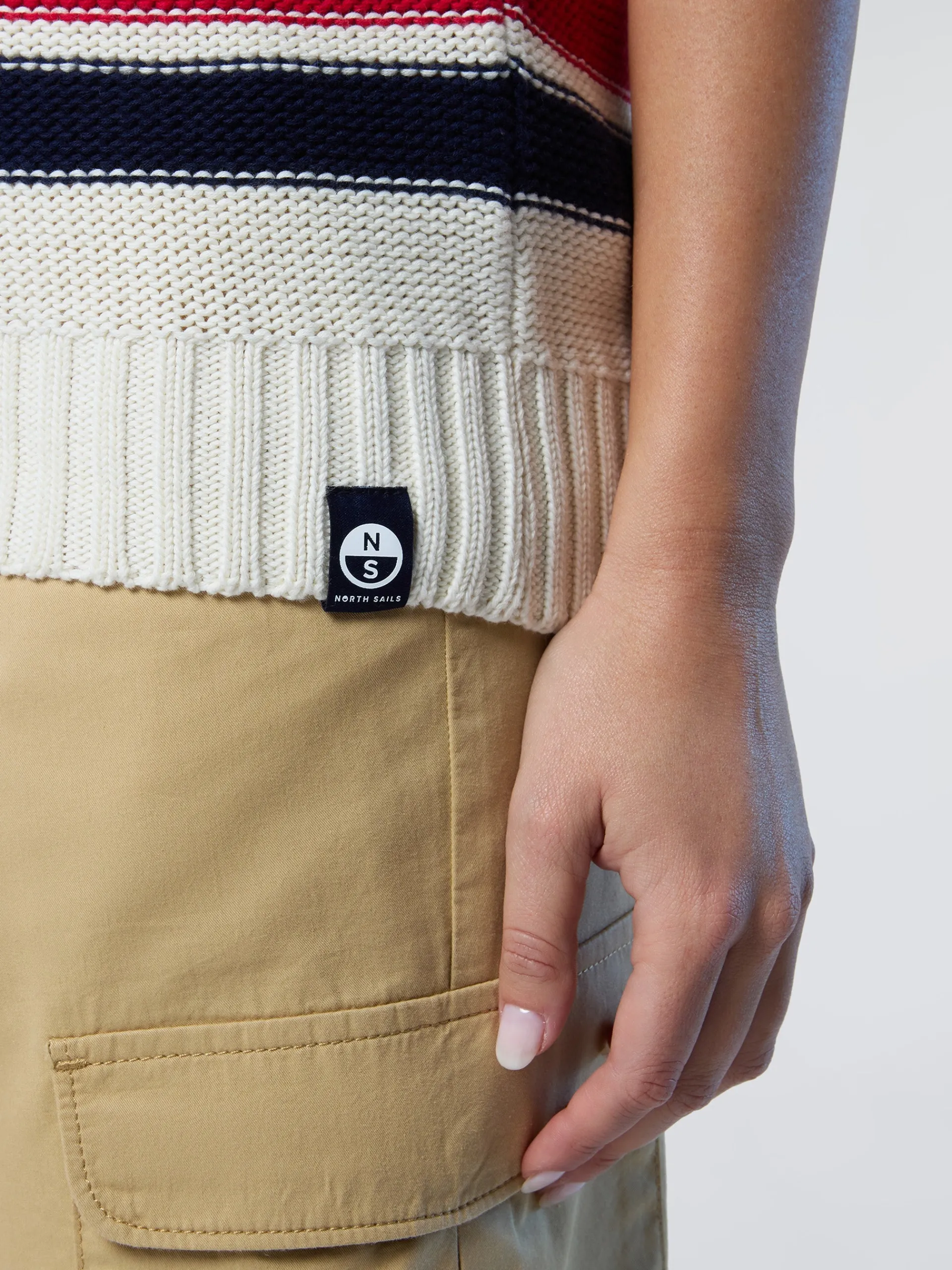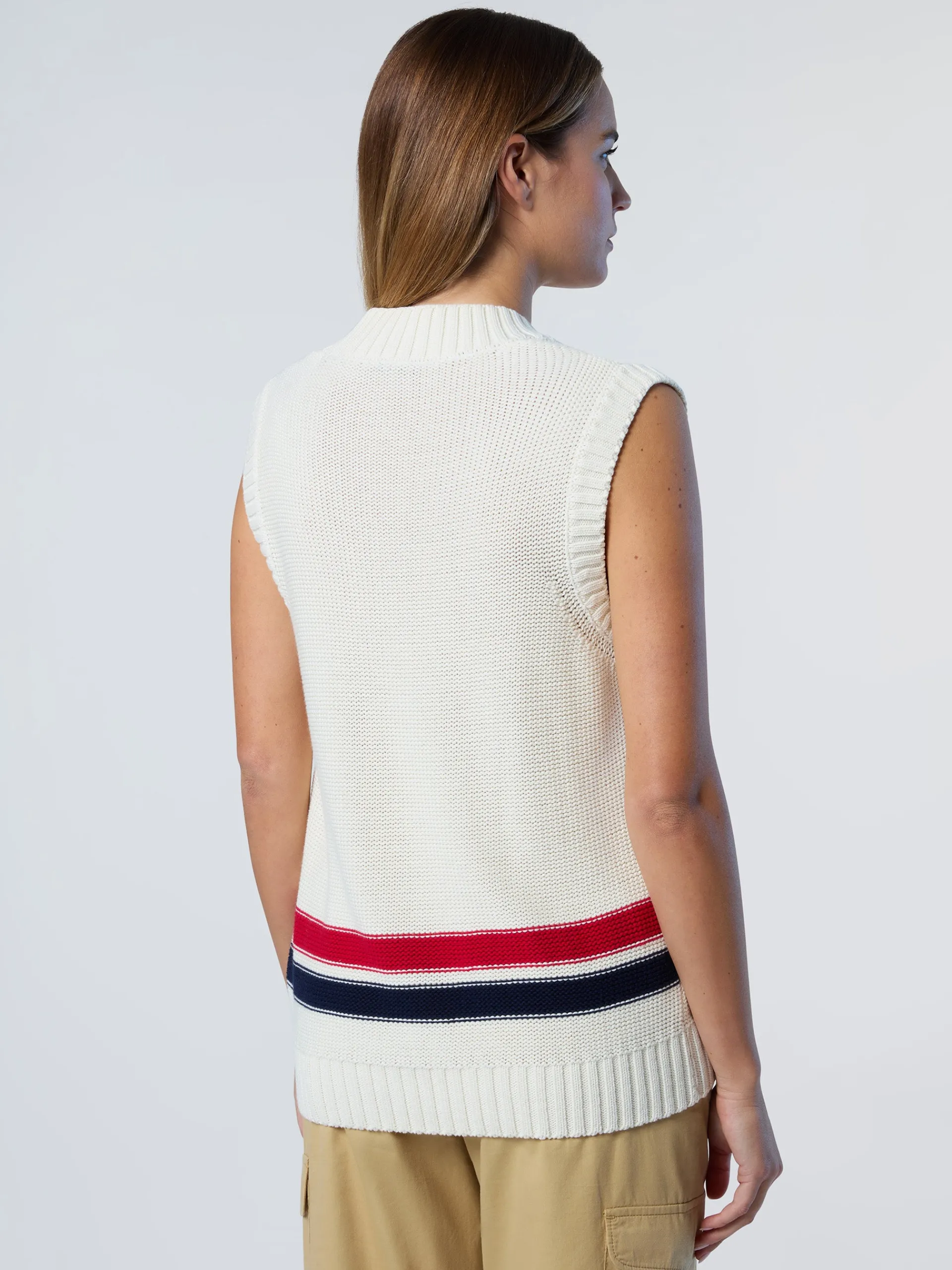 Chic e perfetto da indossare sopra una t-shirt o una camicia, questo gilet con scollo a V è l'aggiornamento North Sails per il guardaroba transeasonal. Il modello è realizzato in cotone organico che dimostra il nostro impegno per il pianeta e si caratterizza per l'intarsio a righe in stile preppy. La label logata firma il design con un inconfondibile tocco North Sails.