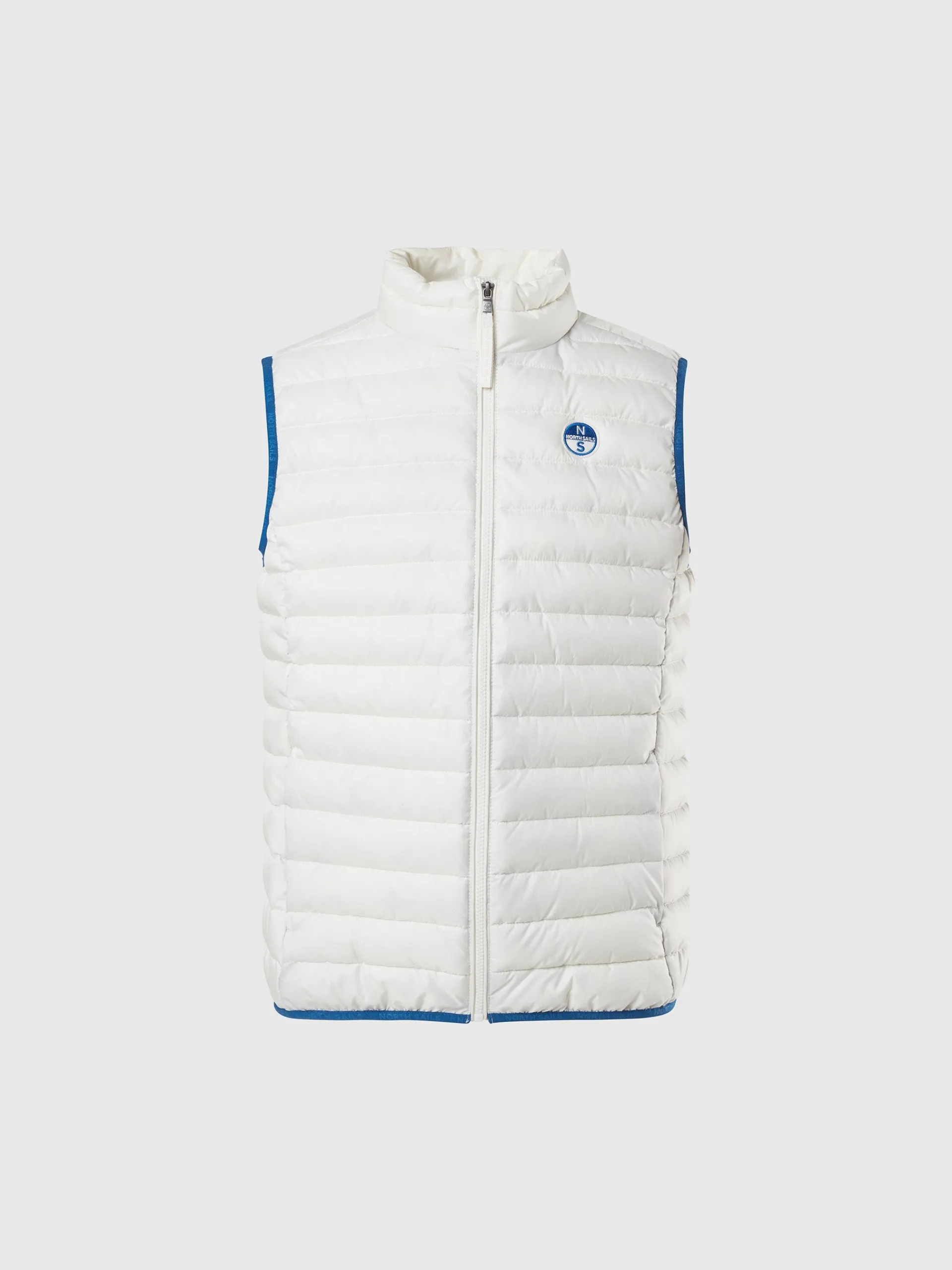 Il capo chiave del guardaroba transeasonal. Questa versione del nostro iconico gilet Crozet è realizzata in micro ripstop riciclato con imbottitura in Repreve, una fibra ottenuta dal riciclo delle bottiglie di plastica che contribuisce a mantenere il mare libero dai rifiuti. Rifinito con finish idrorepellente e trapuntatura a righe per trattenere il calore, il modello da uomo ha l'interno foderato a contrasto con il maxi logo North Sails.