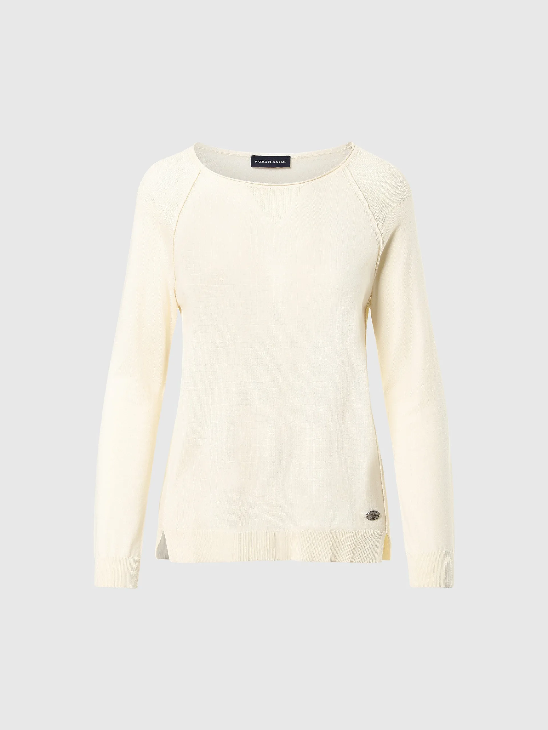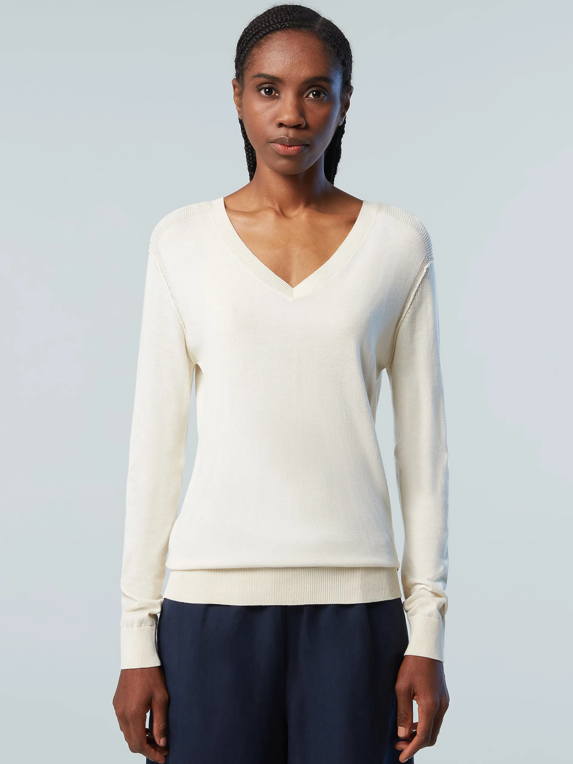 Questa maglia con scollo a V è un essenziale del guardaroba femminile aggiornato da North Sails per difendere il Pianeta. Il filato combina viscosa, cotone organico e aloe vera: una fibra naturale che è biodegradabile e riciclabile al 100%, offrendo al contempo una sensazione super morbida e un'eccellente traspirabilità. Rifinita con bordi a costine e logo in metallo per un tocco North Sails inconfondibile.