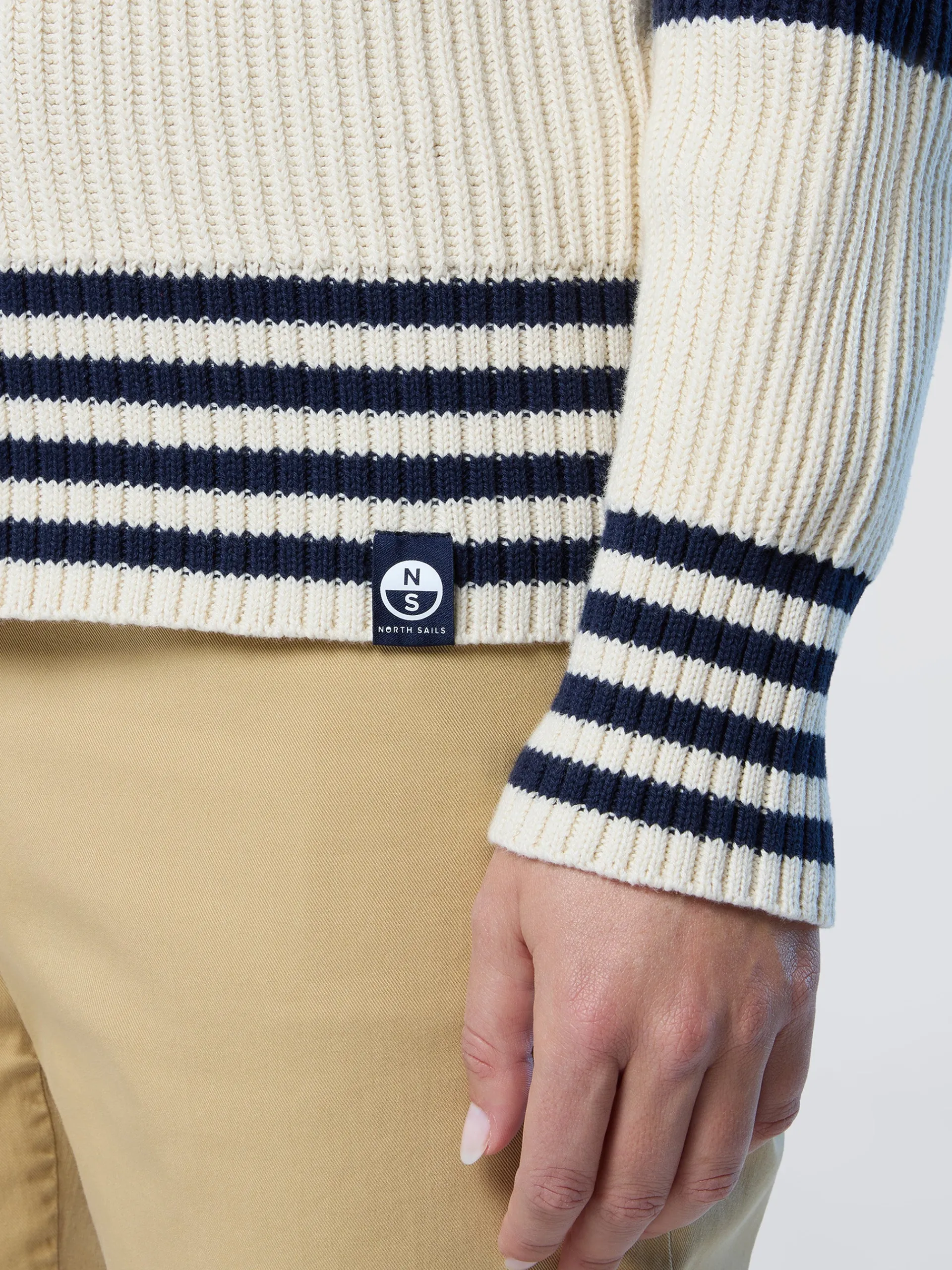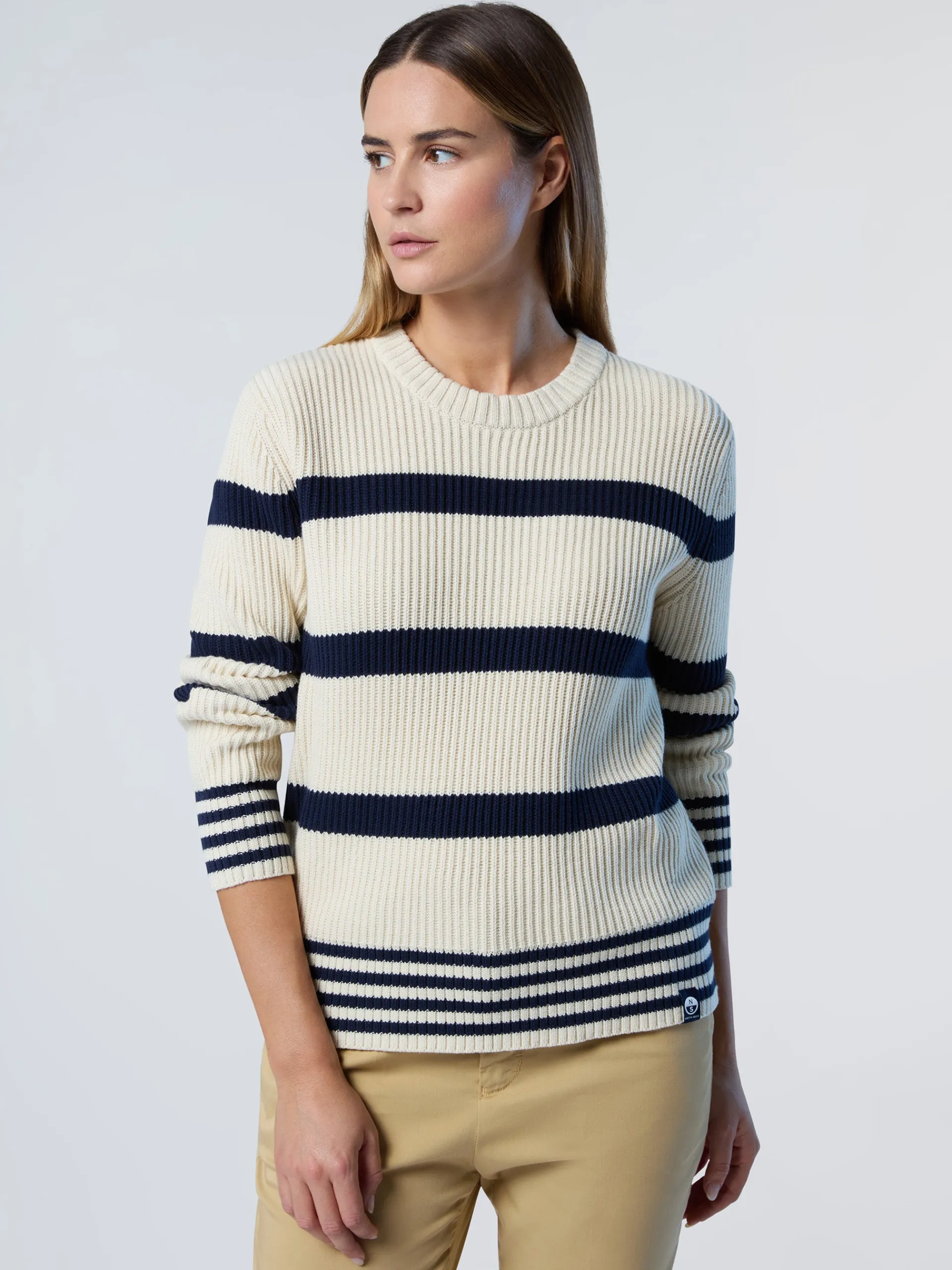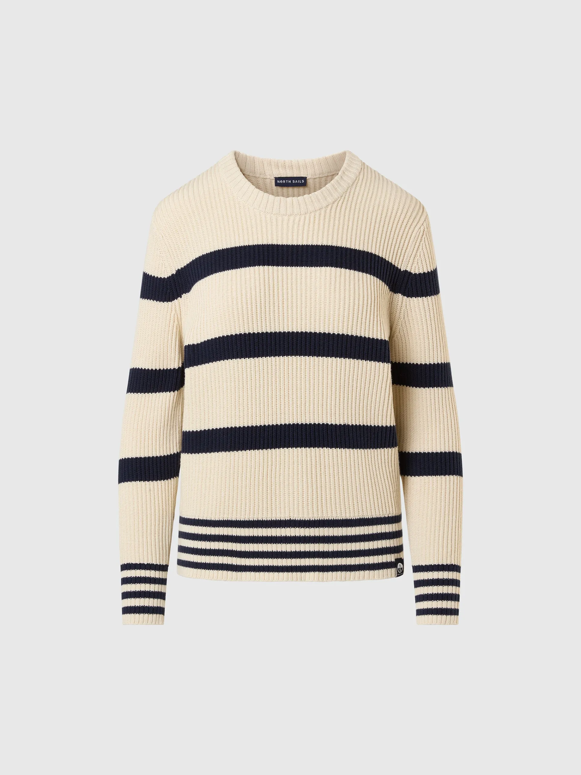 Il maglione da donna che combina design accogliente e ispirazione nautica. Il modello si caratterizza per l'intarsio a maxi righe bicolor che richiama le nostre origini legate alla vela ed è realizzato in cotone organico per ridurre il consumo di acqua e le emissioni nocive. Bordi rifinite a costine e label North Sails al fondo.