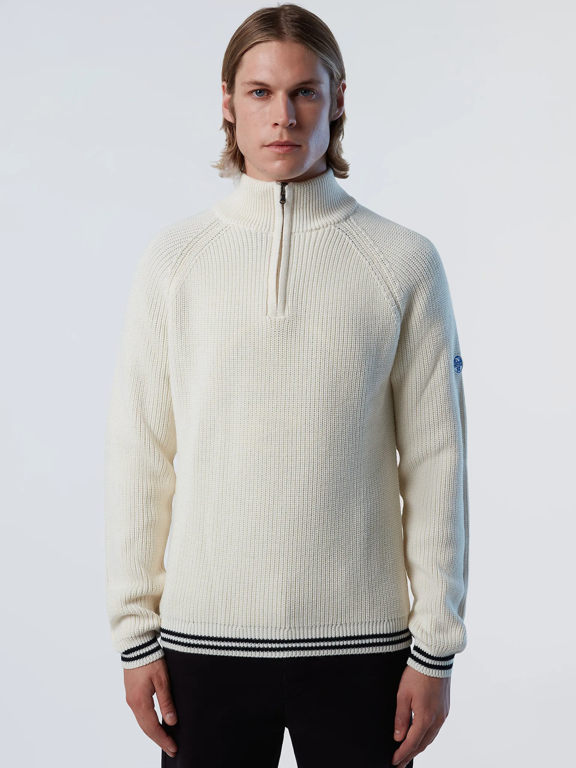 Maglione da uomo con mezza zip, versatile dai look da ufficio ai momenti leisure. Il modello è realizzato in misto lana proveniente da processi sostenibili, in linea con il nostro impegno per il pianeta. Si caratterizza per il design accogliente con lavorazione a costine, maniche raglan e colletto alto. I bordi a righe danno un tocco sportivo, mentre il logo in feltro sulla manica è un dettaglio iconico North Sails.
