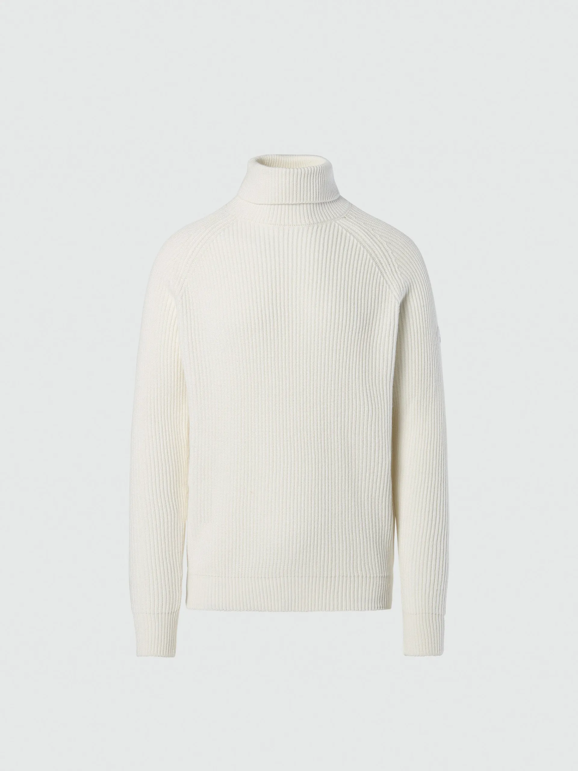 Il maglione dolcevita pensato per la stagione più fredda e progettato per limitare l'impatto sul pianeta. Il modello è realizzato in un morbido filato di lana e cotone organico che contribuisce a ridurre le emissioni nocive e il consumo di acqua rispetto alle fibre tradizionali. Si caratterizza per la lavorazione a costa inglese che richiama i classici capi da marinaio e le maniche raglan per la massima libertà di movimento.