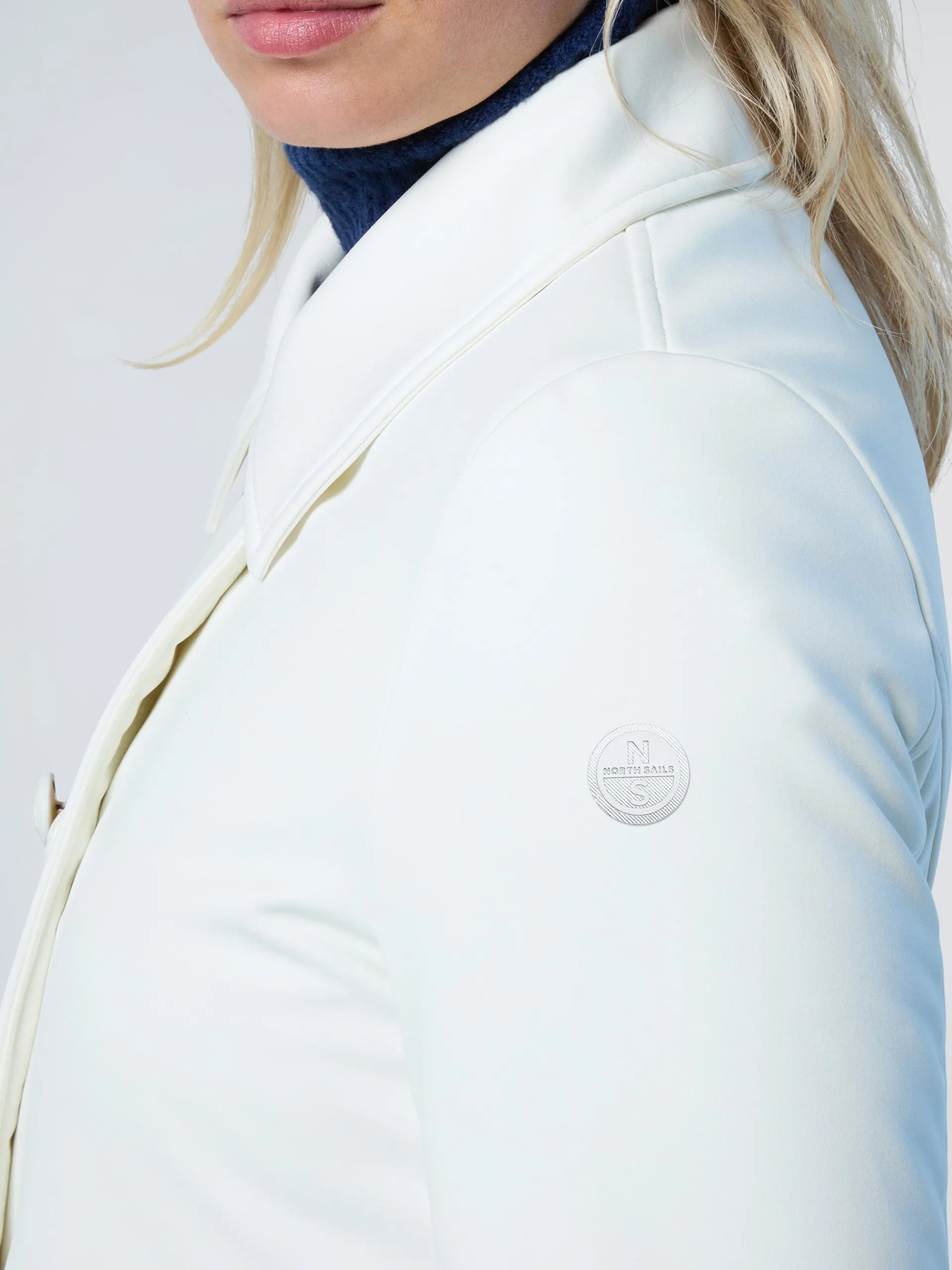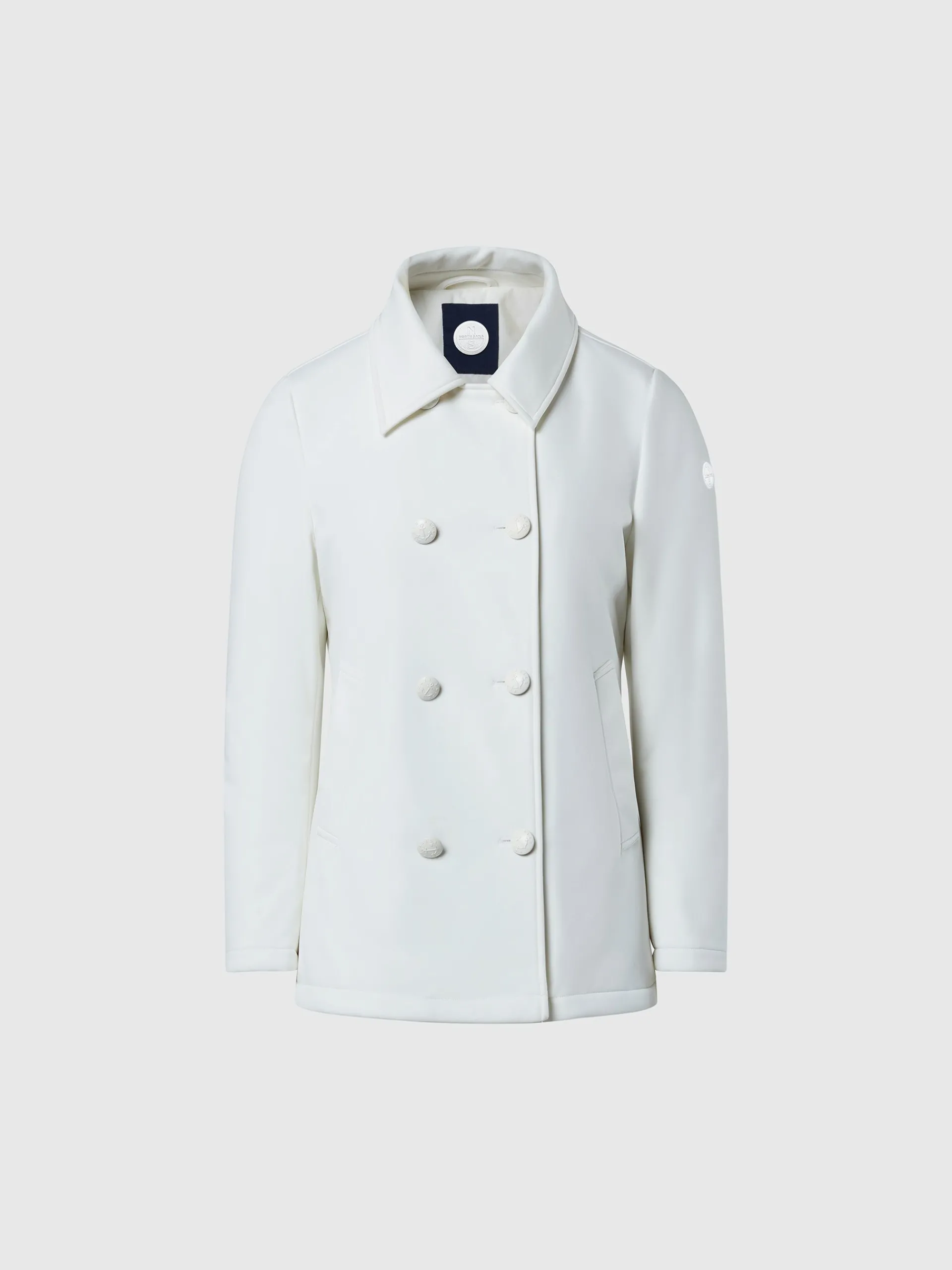 Il peacoat Jessica è l'icona d'ispirazione sailing reinterpretata con un allure femminile e ricercato. Perfetto per il tempo libero e gli appuntamenti cittadini, il modello si caratterizza per il design ad A ed è realizzato in softshell riciclato con un finish laminato resistente all'acqua e in linea con il nostro impegno per il consumo consapevole. La chiusura doppiopetto con bottoni logati e il colletto a camicia danno un tocco raffinato.