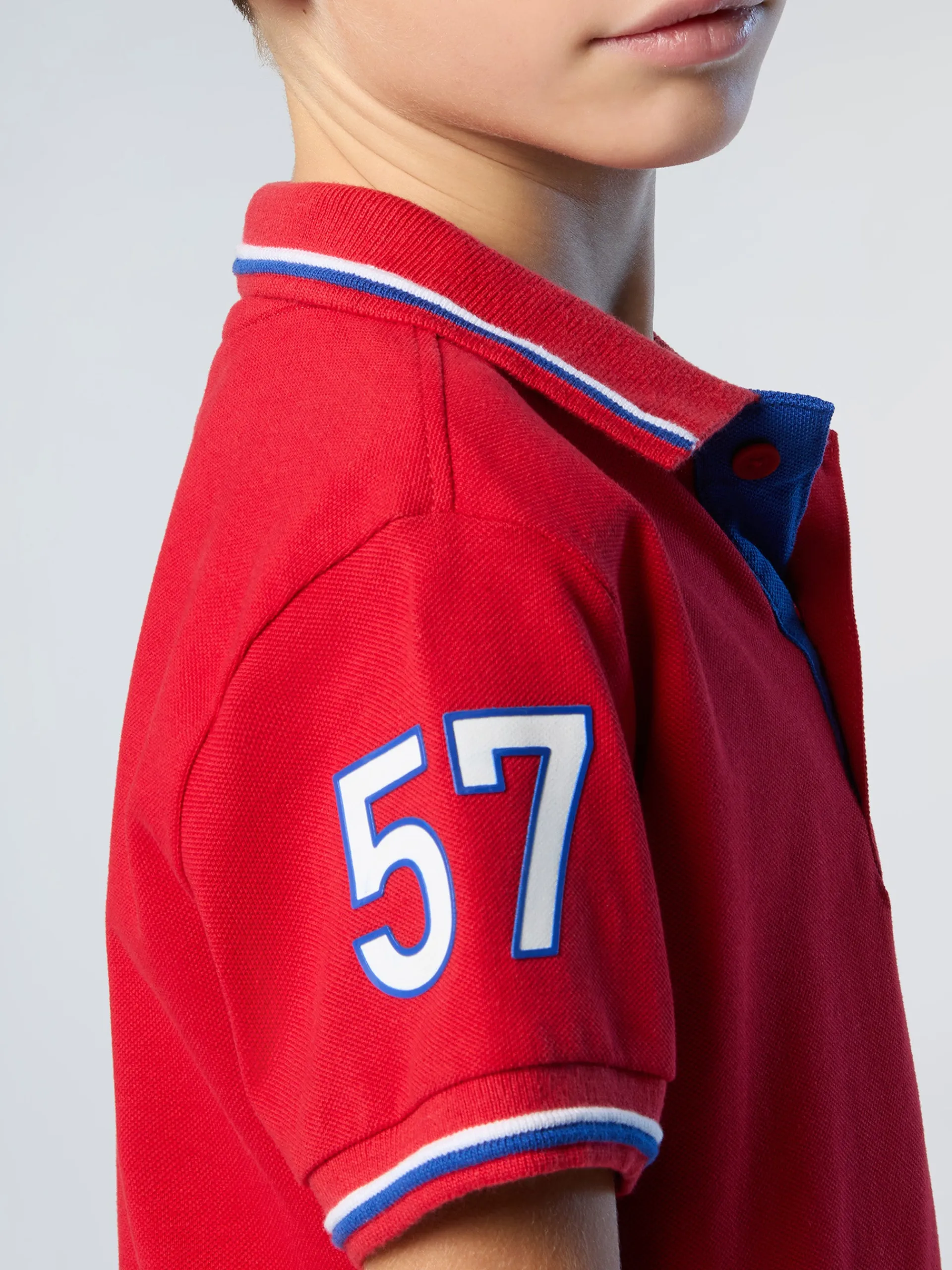 La polo da bambino che combina stile college e spirito North Sails. Il modello è realizzato in piquet di cotone organico che riduce le emissioni e il consumo di acqua rispetto alle fibre tradizionali. Si caratterizza per i bordi delle maniche dal colore a contrasto e il logo a rilievo sul petto. La patch sulla manica con il numero "57" è un omaggio all'anno di fondazione del brand.