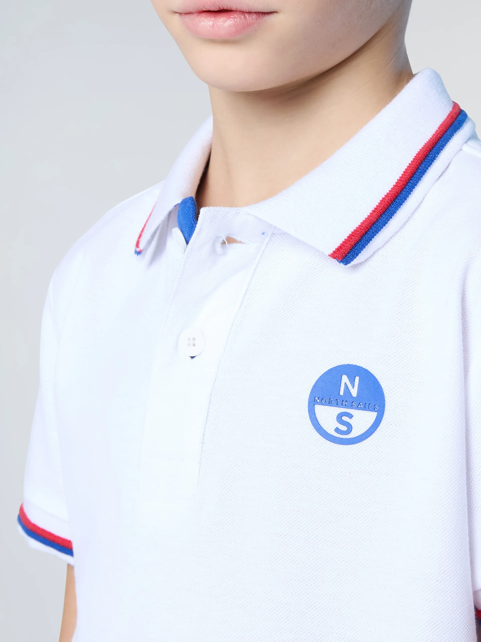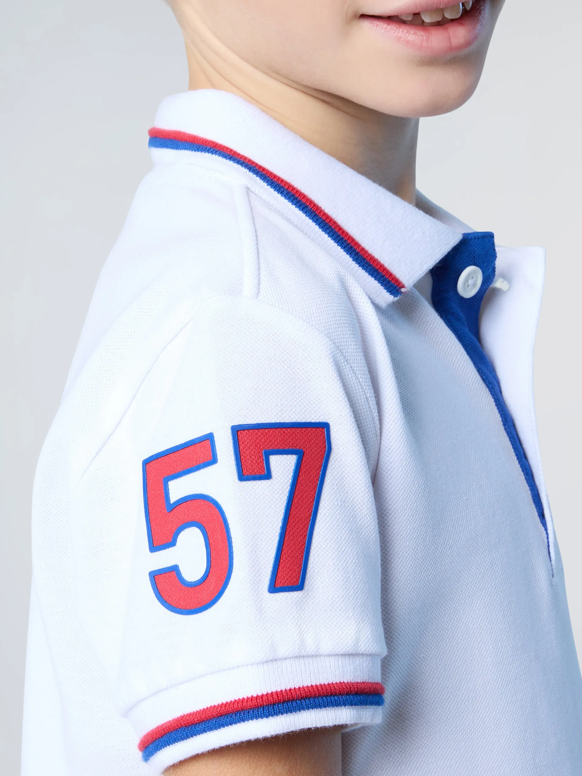 La polo da bambino che combina stile college e spirito North Sails. Il modello è realizzato in piquet di cotone organico che riduce le emissioni e il consumo di acqua rispetto alle fibre tradizionali. Si caratterizza per i bordi delle maniche dal colore a contrasto e il logo a rilievo sul petto. La patch sulla manica con il numero "57" è un omaggio all'anno di fondazione del brand.