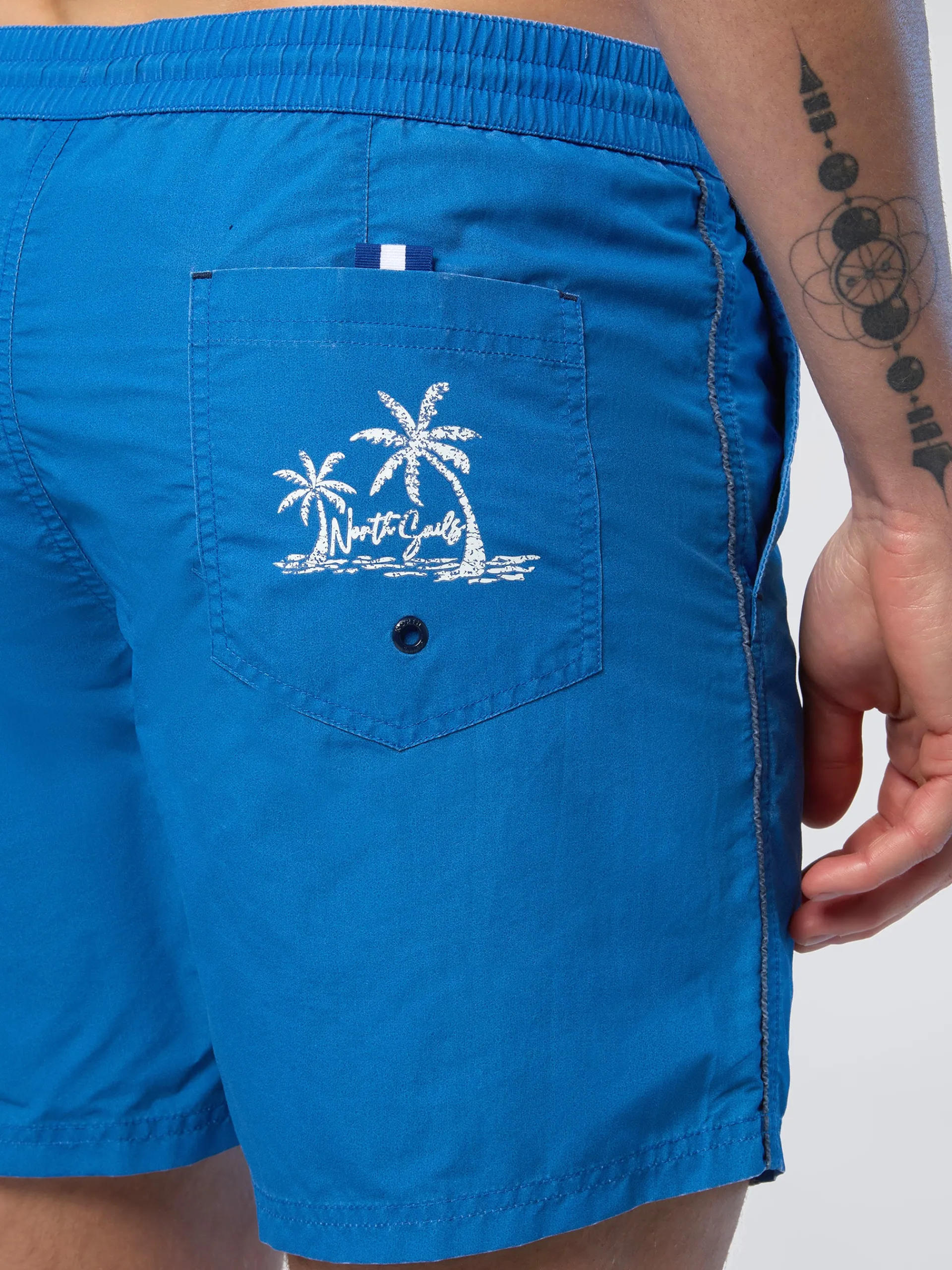 Immergiti nelle vibrazioni rilassate della bella stagione con questi boxer mare in stile volley. Il modello è realizzato in nylon riciclato che rispetta il pianeta ed è rifinito con un finish lavato dall'aspetto autentico. Il motivo palme stampato sulla tasca aggiunge una nota grafica super estiva.