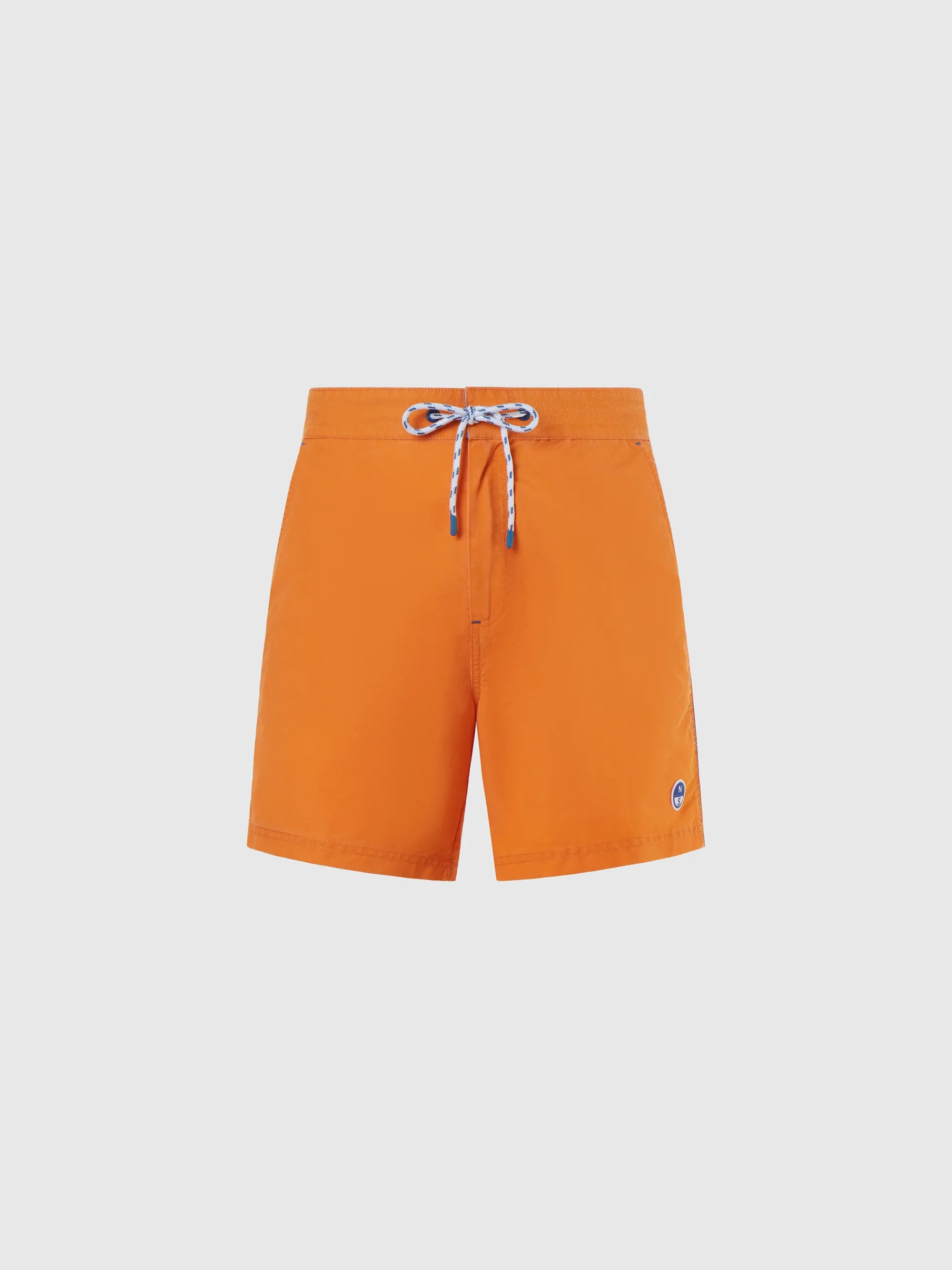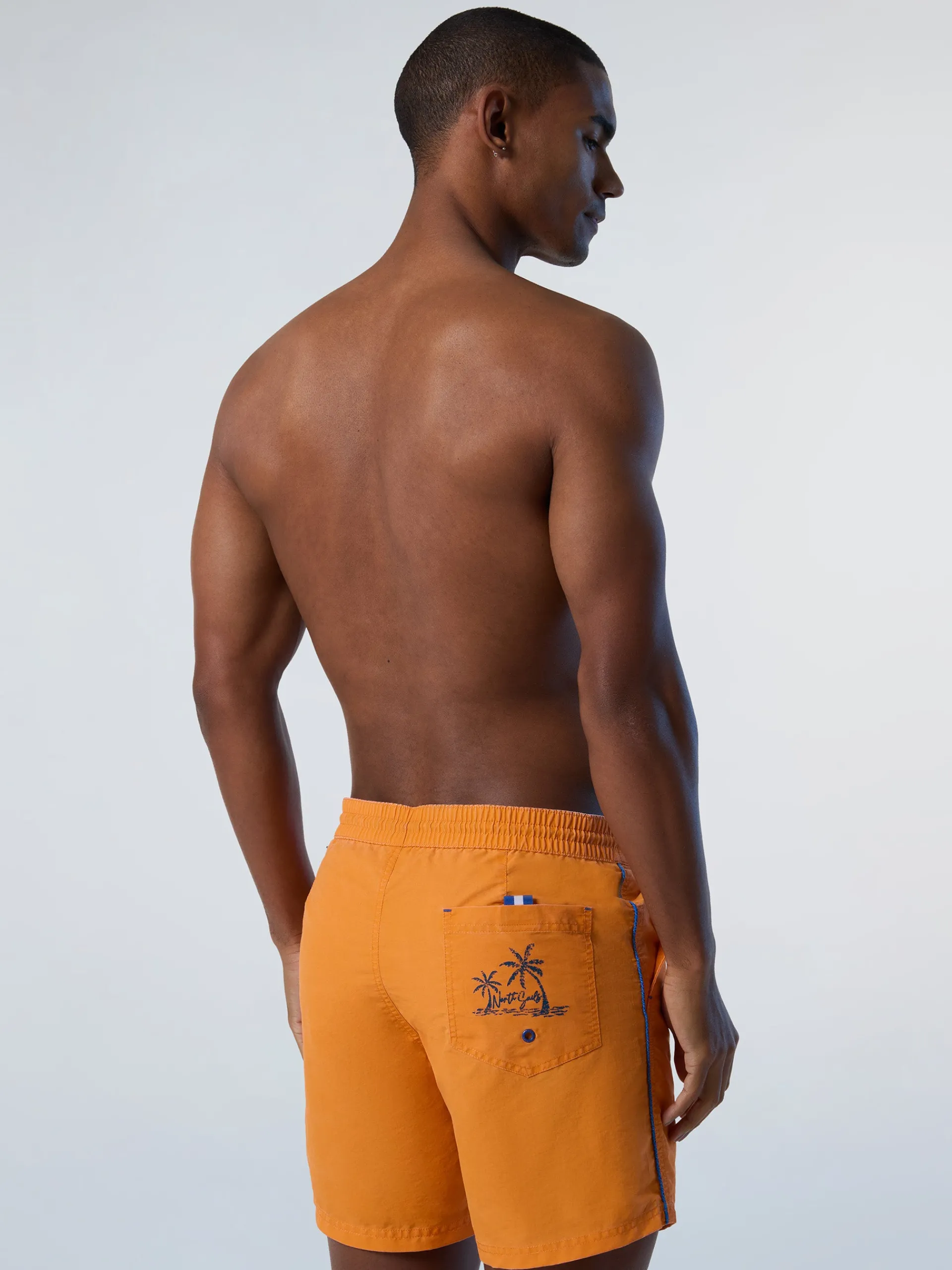 Immergiti nelle vibrazioni rilassate della bella stagione con questi boxer mare in stile volley. Il modello è realizzato in nylon riciclato che rispetta il pianeta ed è rifinito con un finish lavato dall'aspetto autentico. Il motivo palme stampato sulla tasca aggiunge una nota grafica super estiva.