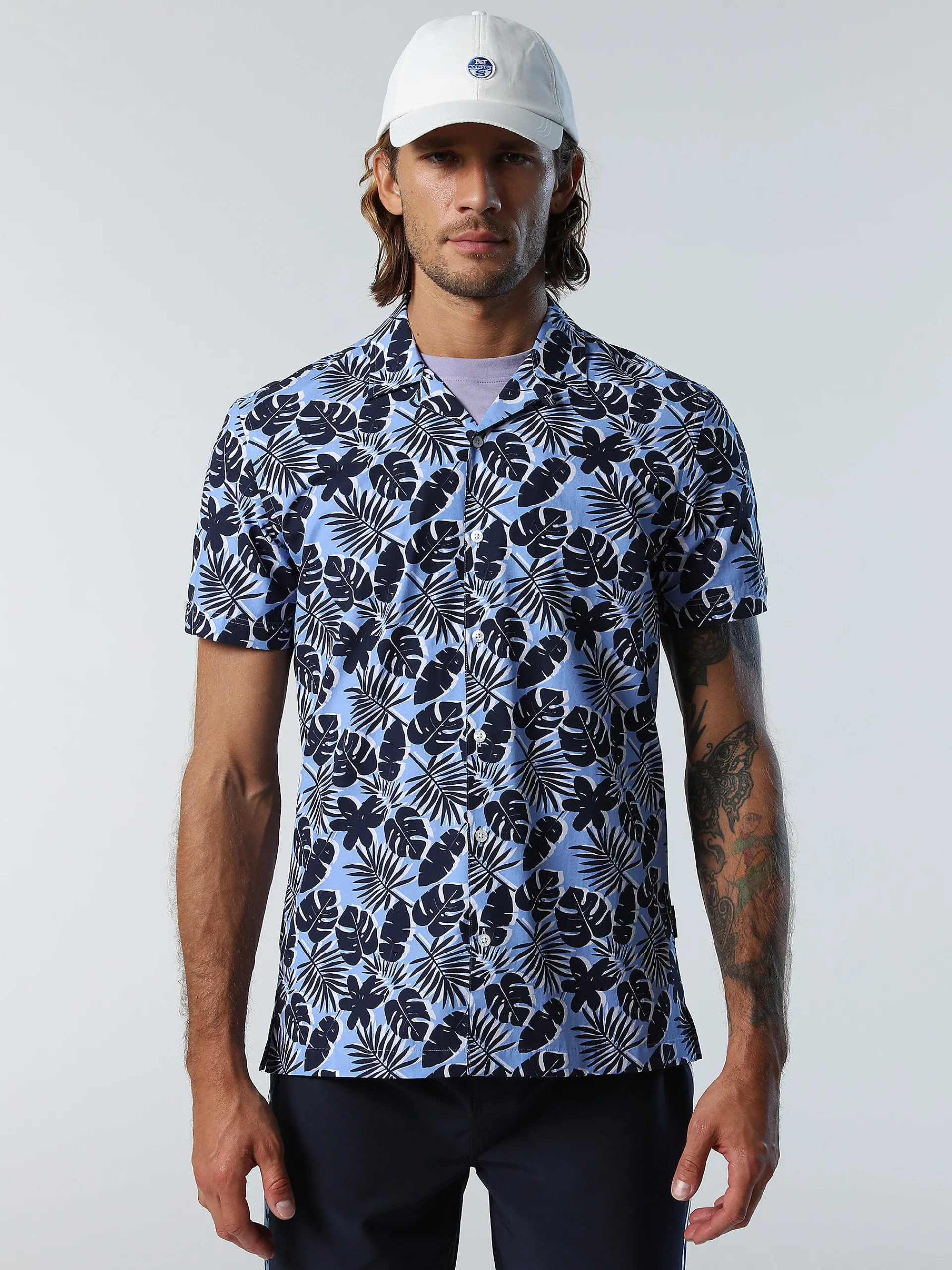 La camicia da uomo a maniche corte che aggiunge un twist ironico e vacanziero al guardaroba dell'estate. Il modello è realizzato in morbido popeline di cotone con stampa tropicale all over. Si caratterizza per il classico colletto bowling dal mood rilassato, la chiusura con bottoni e il carré sul retro.