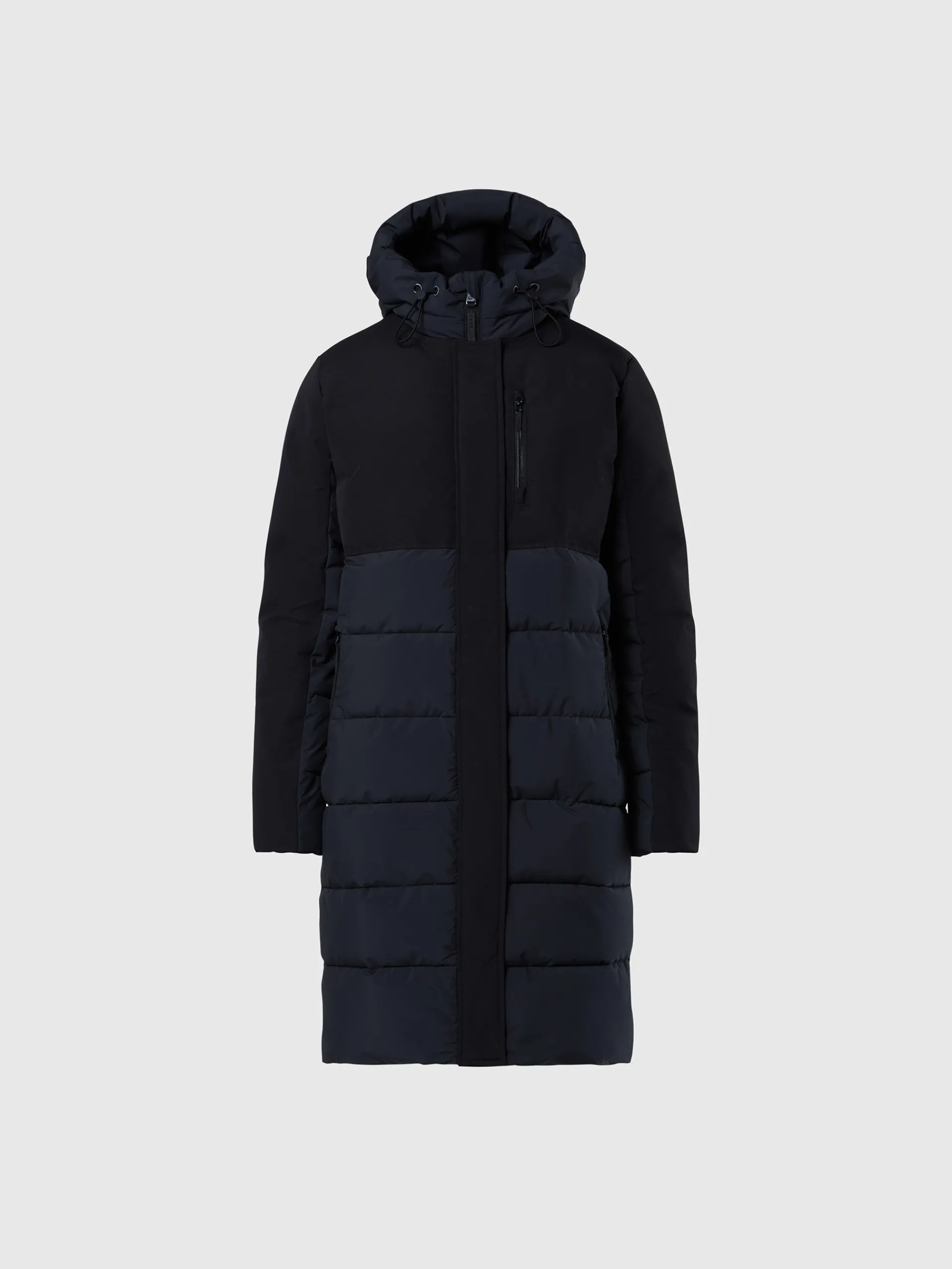 Sydney è il piumino lungo che unisce stile e comfort durante la stagione più fredda. In linea con il nostro impegno per il pianeta, il modello da donna è realizzato in poliestere riciclato con carré in nylon riciclato effetto cotone. Si caratterizza per l'imbottitura in piuma sintetica, la trapuntatura con maxi righe al fondo, le tre tasche con zip e il cappuccio che protegge da vento e pioggia. Logo North Sails sulla manica.