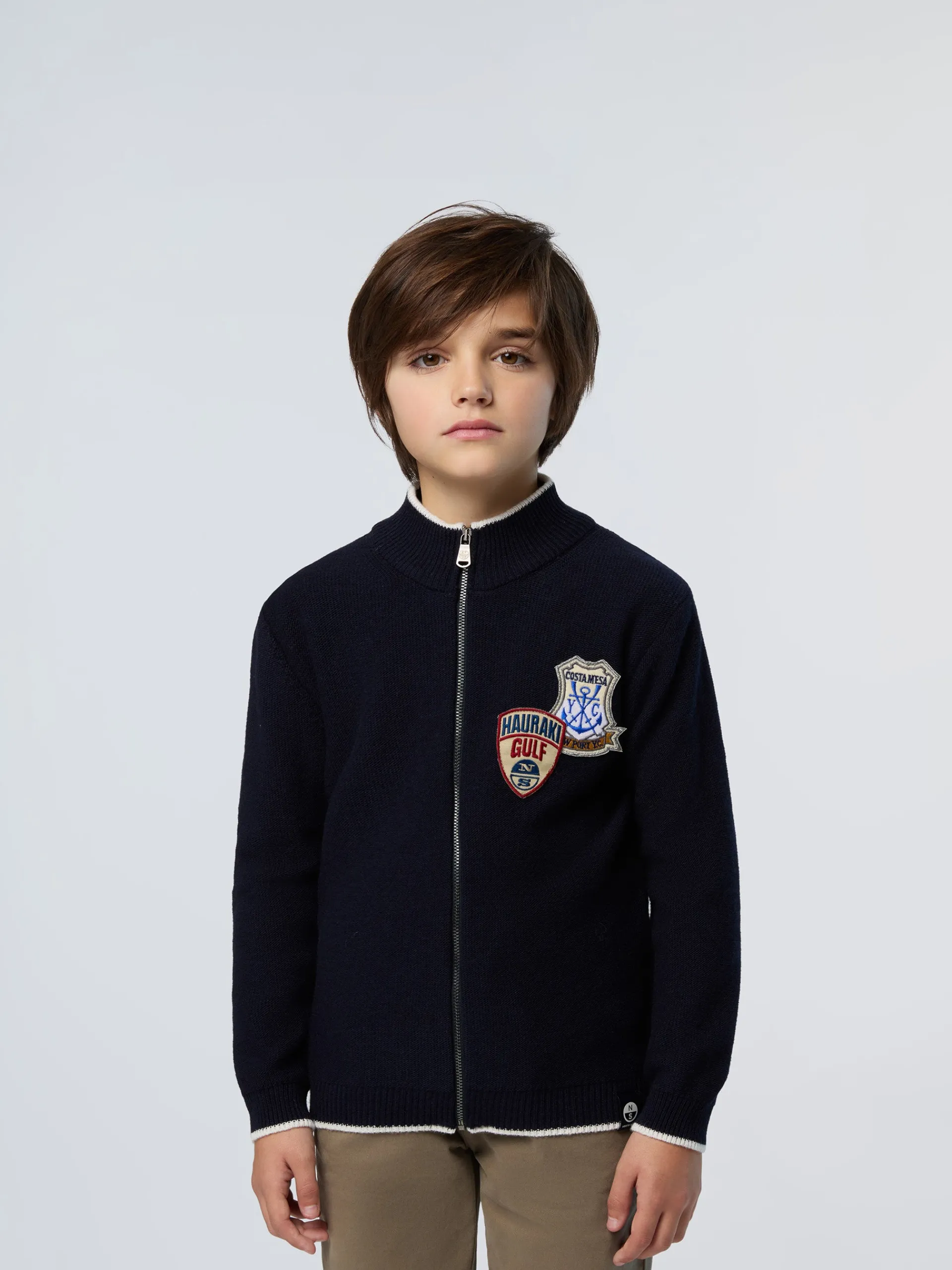 Retro attitude meets planet-conscious spirit: this full-zip sweater is embellished with upcycled vintage patches to help support circular consumption. Knitted from a soft cashmere blend containing recycled fibers too, it's styled with a high neck for easy layering. A North Sails label on the hem adds a signature touch.