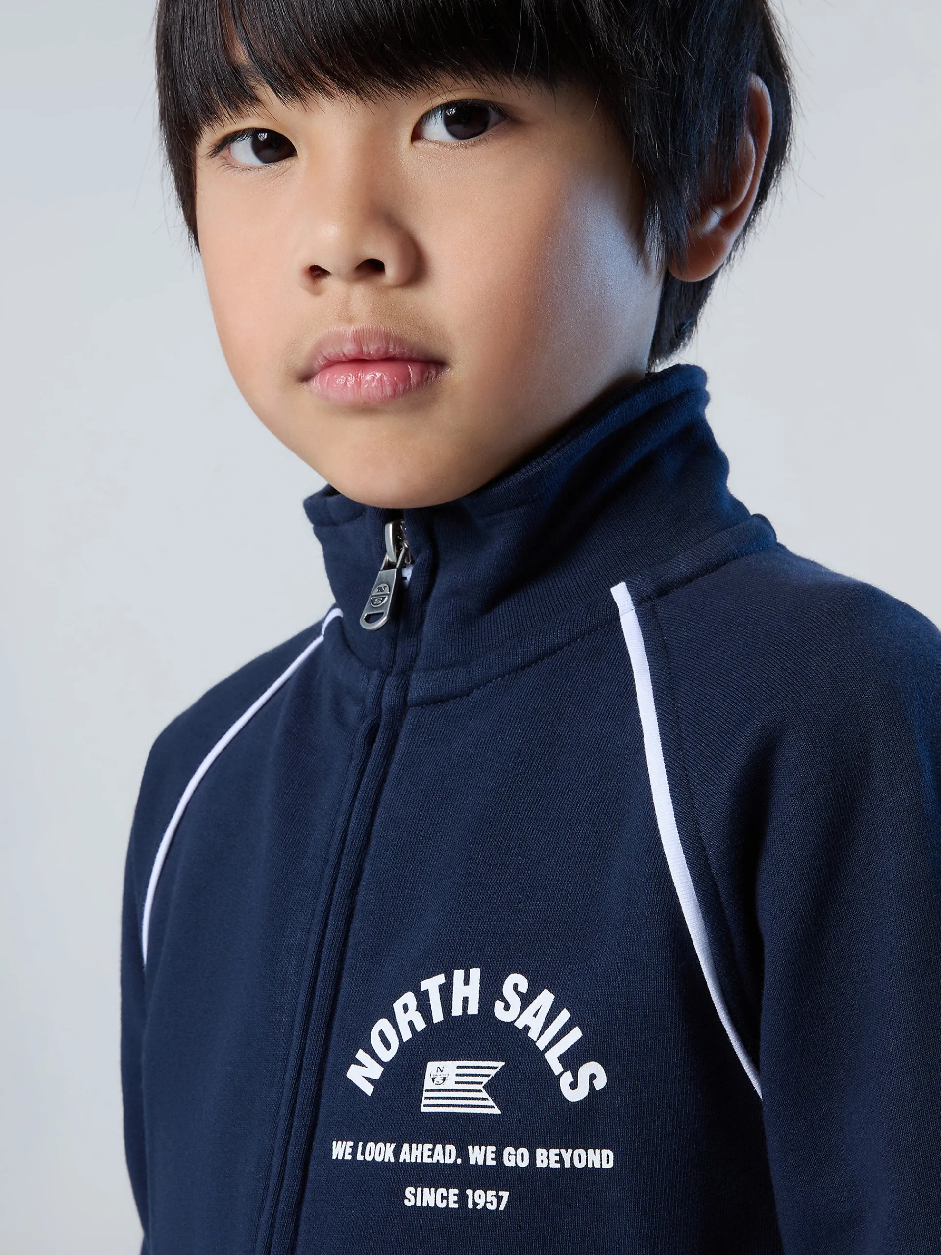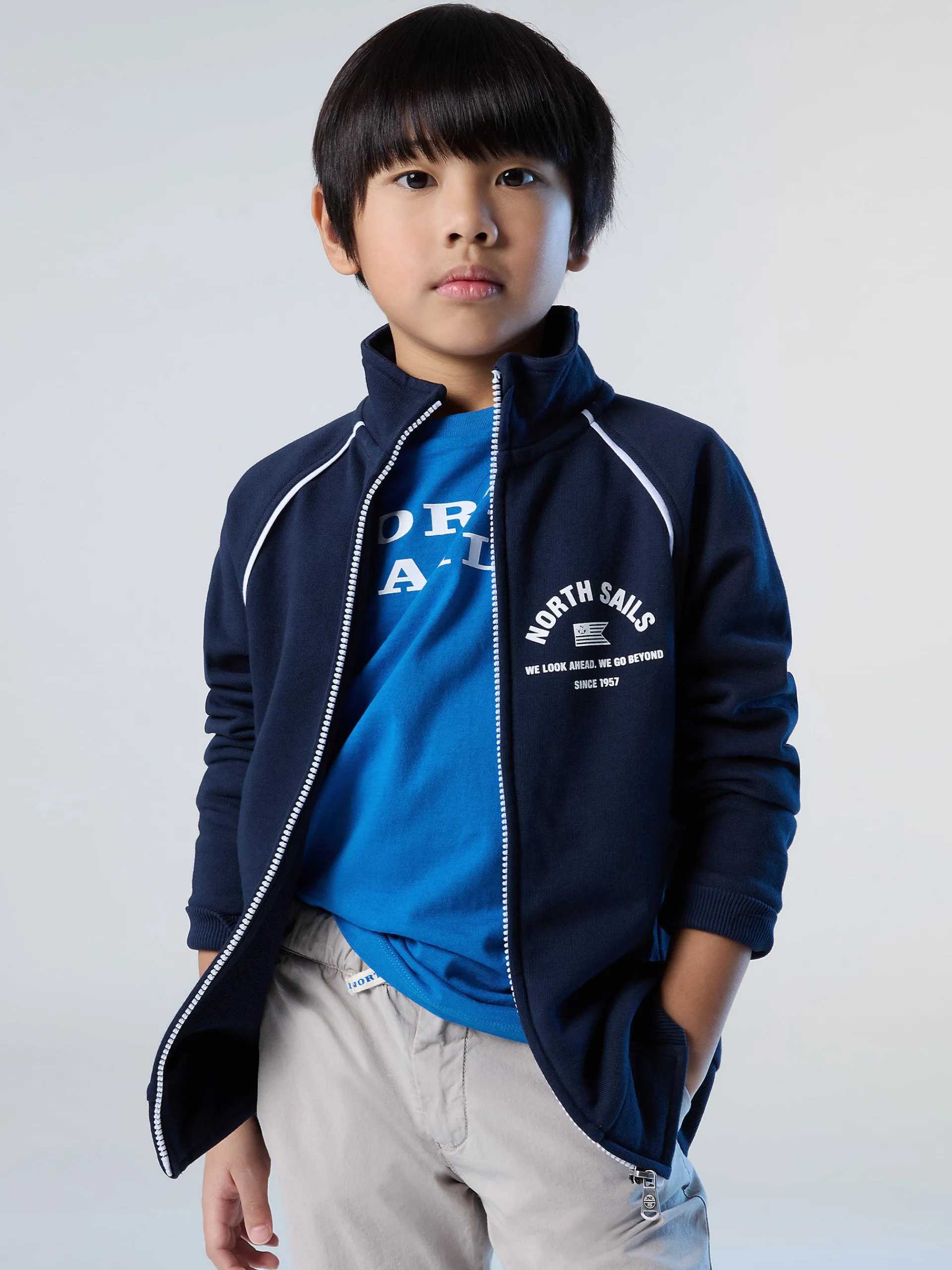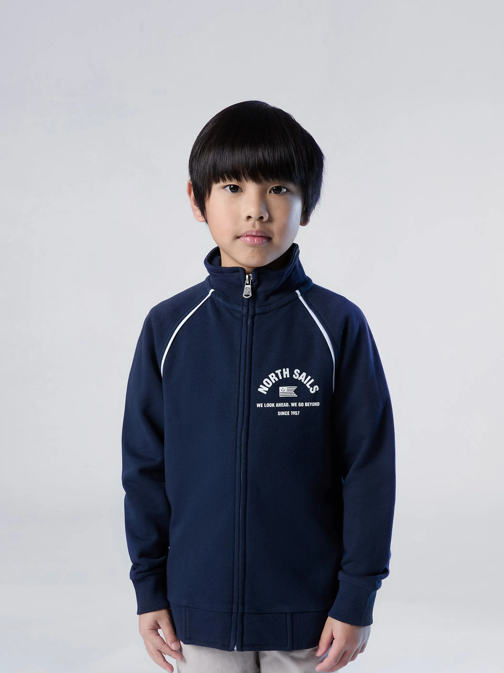 Versatile e facile da indossare, questa felpa è un essenziale del guardaroba casual dei bambini. Progettato pensando allo stile e al Pianeta, il modello con cappuccio e zip è realizzato in 100% cotone organico. Le maniche raglan con profilo a contrasto e il collo alto a costine danno un tocco sportivo, mentre la stampa sul petto celebra il nostro motto "Go Beyond".