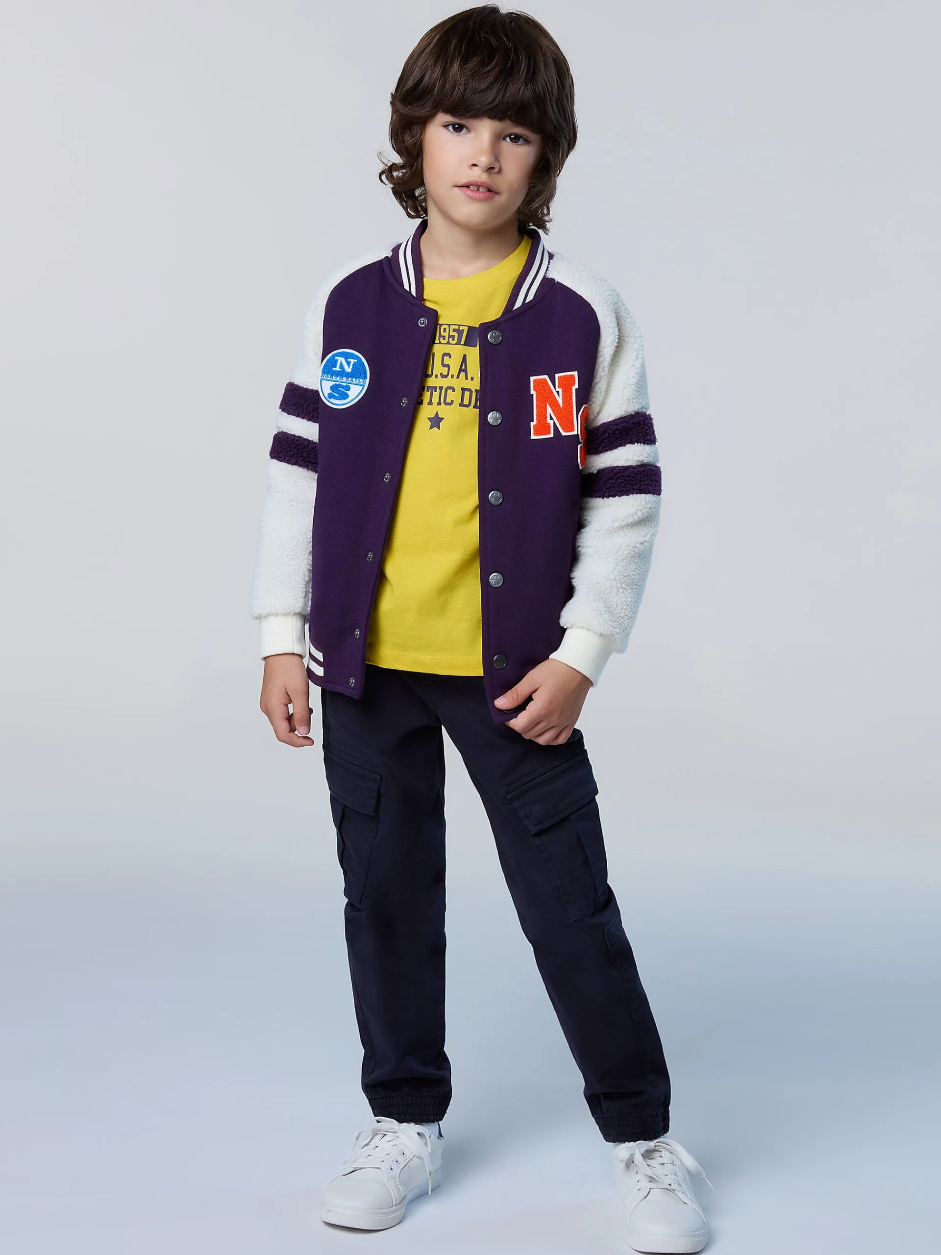 La felpa bomber in stile college che aggiorna il guardaroba dei bambini. Il modello è realizzato in felpa di cotone organico con maniche raglan in sherpa riciclato per un design all'avanguardia e gentile con il pianeta. Il logo e le iniziali NS in spugna enfatizzano l'ispirazione varsity del capo e danno un'impronta North Sails al look.