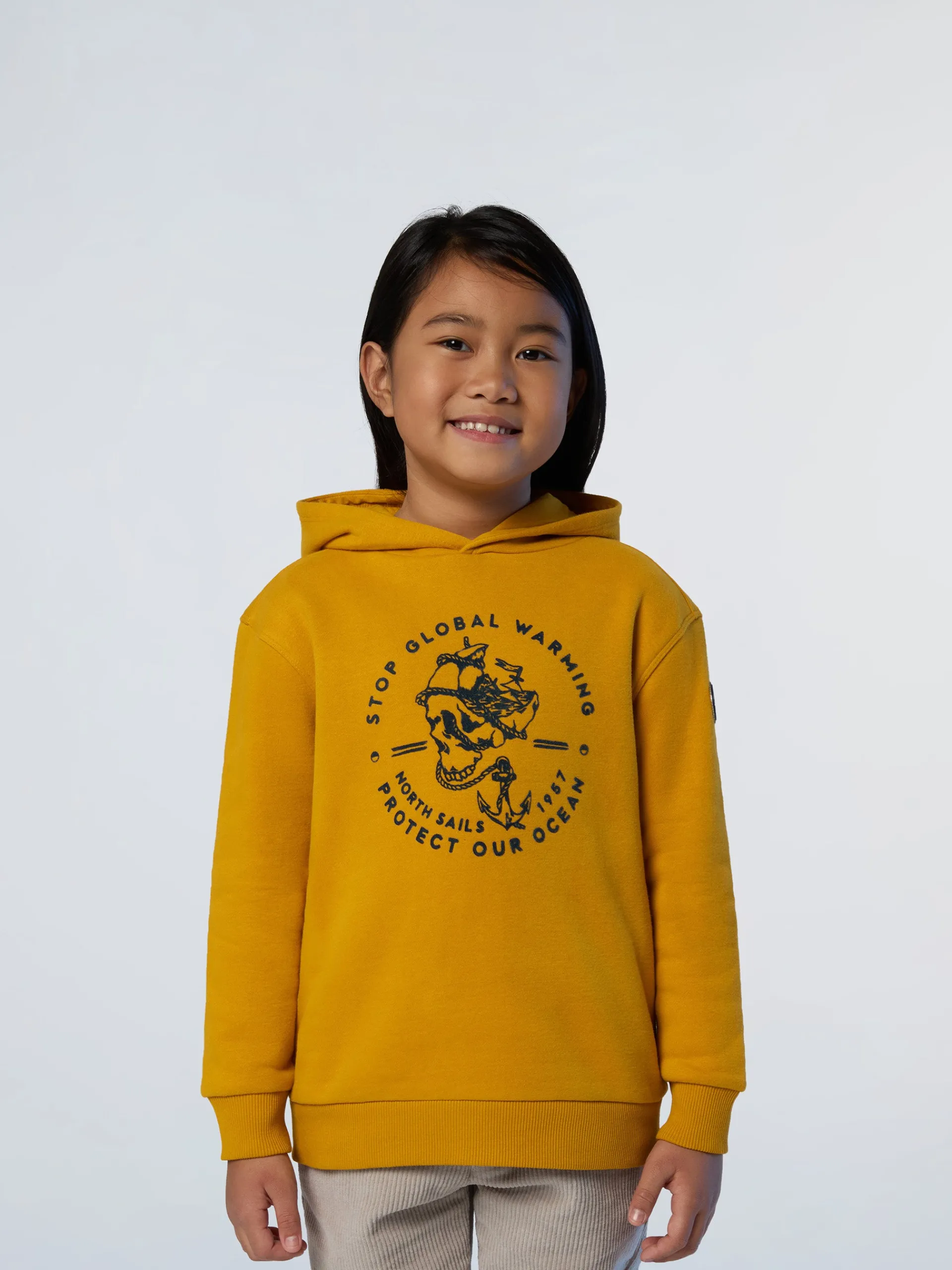 Questa felpa con cappuccio rende omaggio alla storia e alla mission North Sails. Il modello è realizzato in cotone organico mano pesca, morbido sulla pelle e attento al pianeta perché riduce le emissioni e il consumo d'acqua rispetto alle fibre tradizionali. La maxi stampa dà un imprinting deciso al look.
