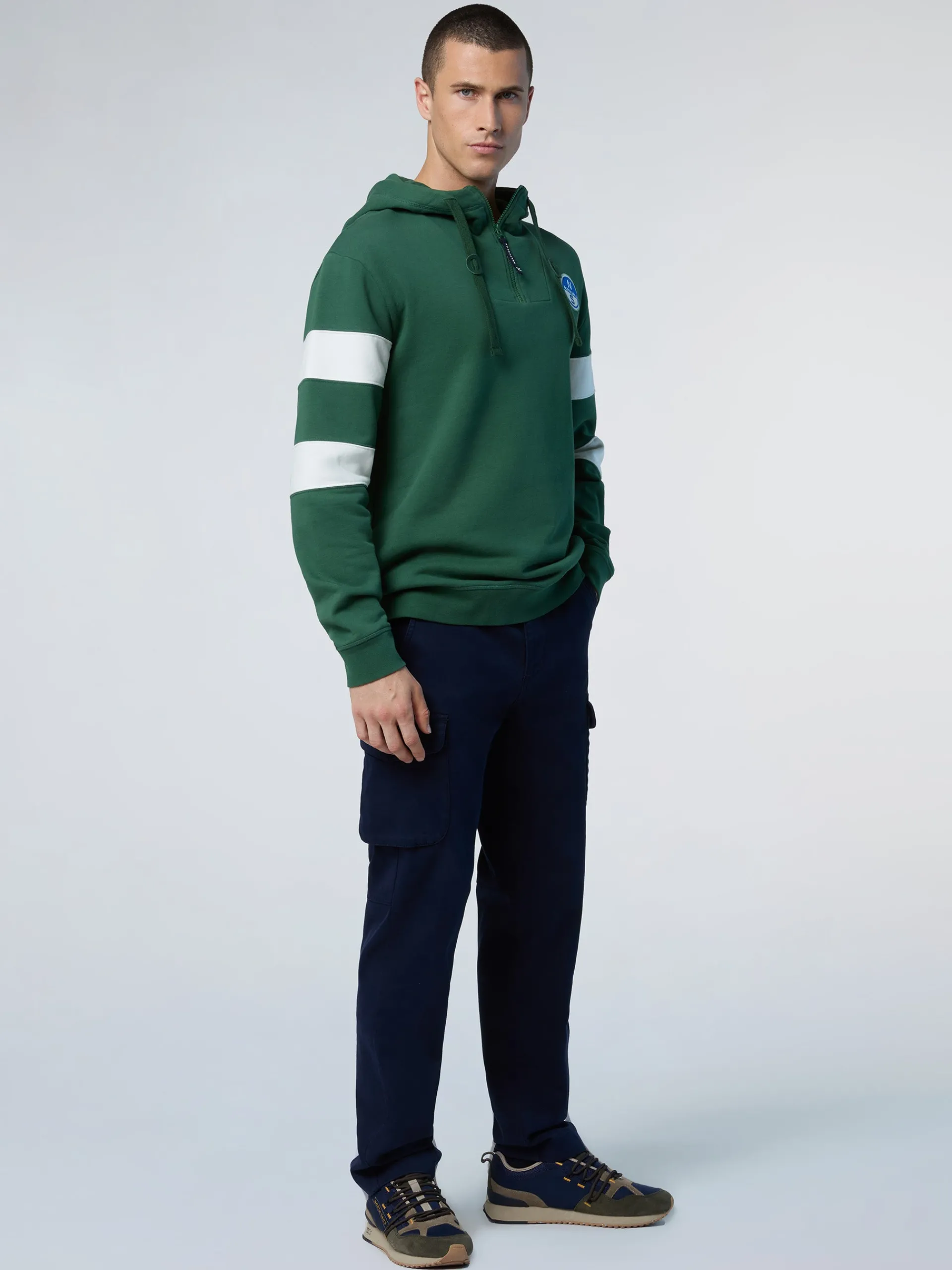 North Sails rende speciale un basic del guardaroba quotidiano. Questa felpa con cappuccio è realizzata in cotone organico estremamente morbido sulla pelle e gentile con il pianeta perché riduce le emissioni e il consumo di acqua rispetto alle fibre tradizionali. Si caratterizza per la mezza zip logata, l'intarsio a righe sulle maniche e la maxi patch sul petto.