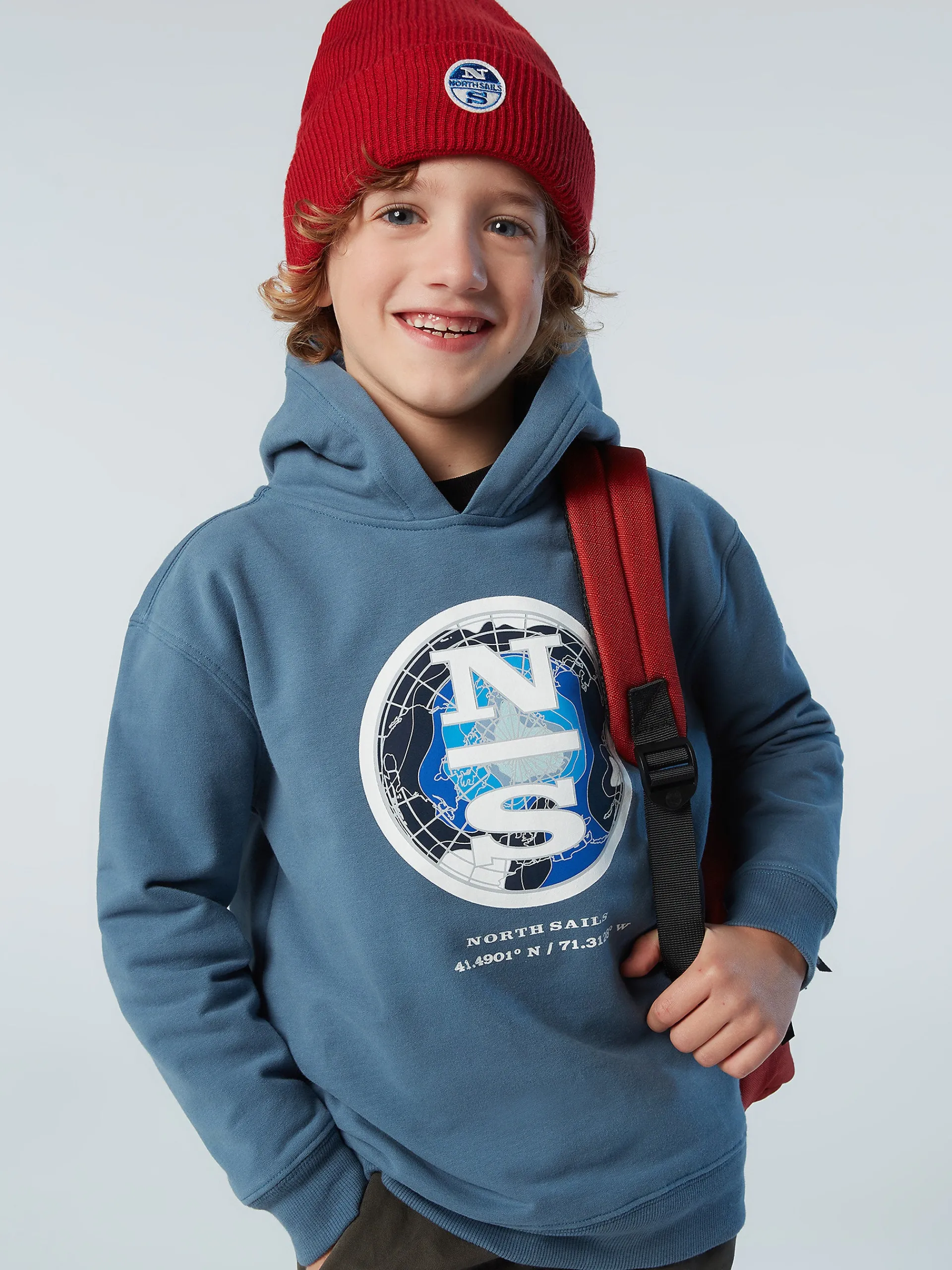 Questa felpa con cappuccio da bambino è realizzata in cotone organico stretch, trattato con un finish super soffice effetto pesca. La stampa grafica sul davanti richiama la nostra passione per l'avventura e la protezione dell'oceano: un'espressione orgogliosa del DNA North Sails.