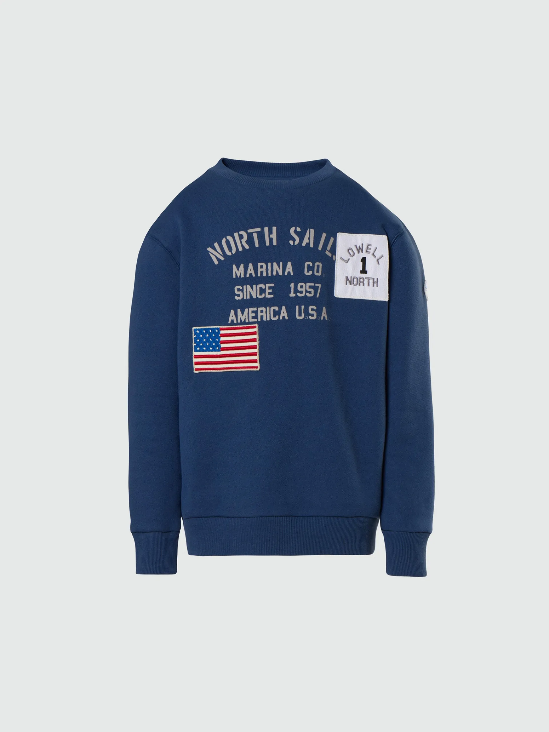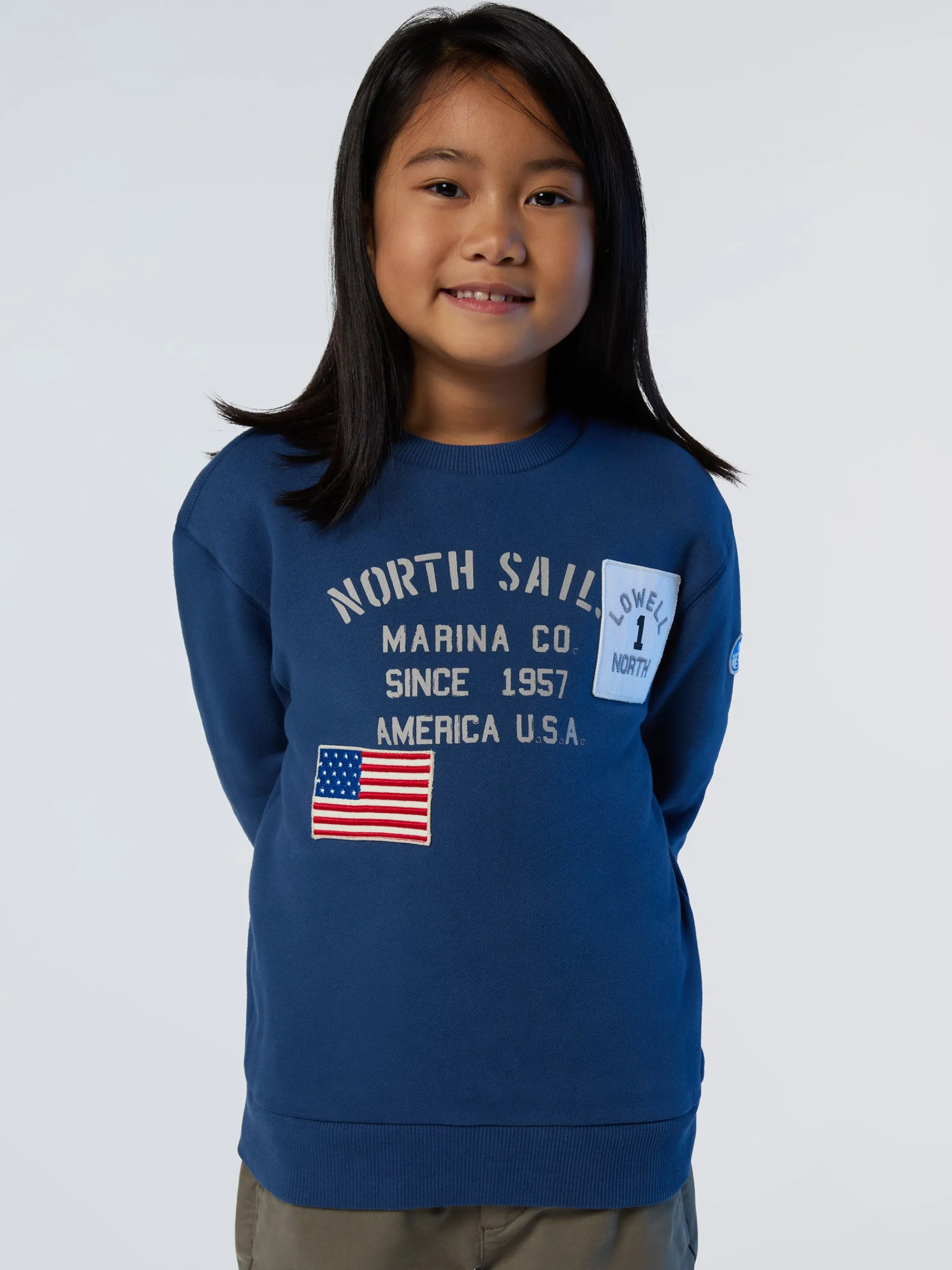 Questa felpa girocollo da bambino unisce richiami vintage e spirito eco conscious. Il modello è realizzato in cotone organico ed è impreziosito con patch vintage in tessuto riciclato che conferma il nostro impegno per il consumo circolare. La stampa North Sails sul davanti è un omaggio al mondo della vela.