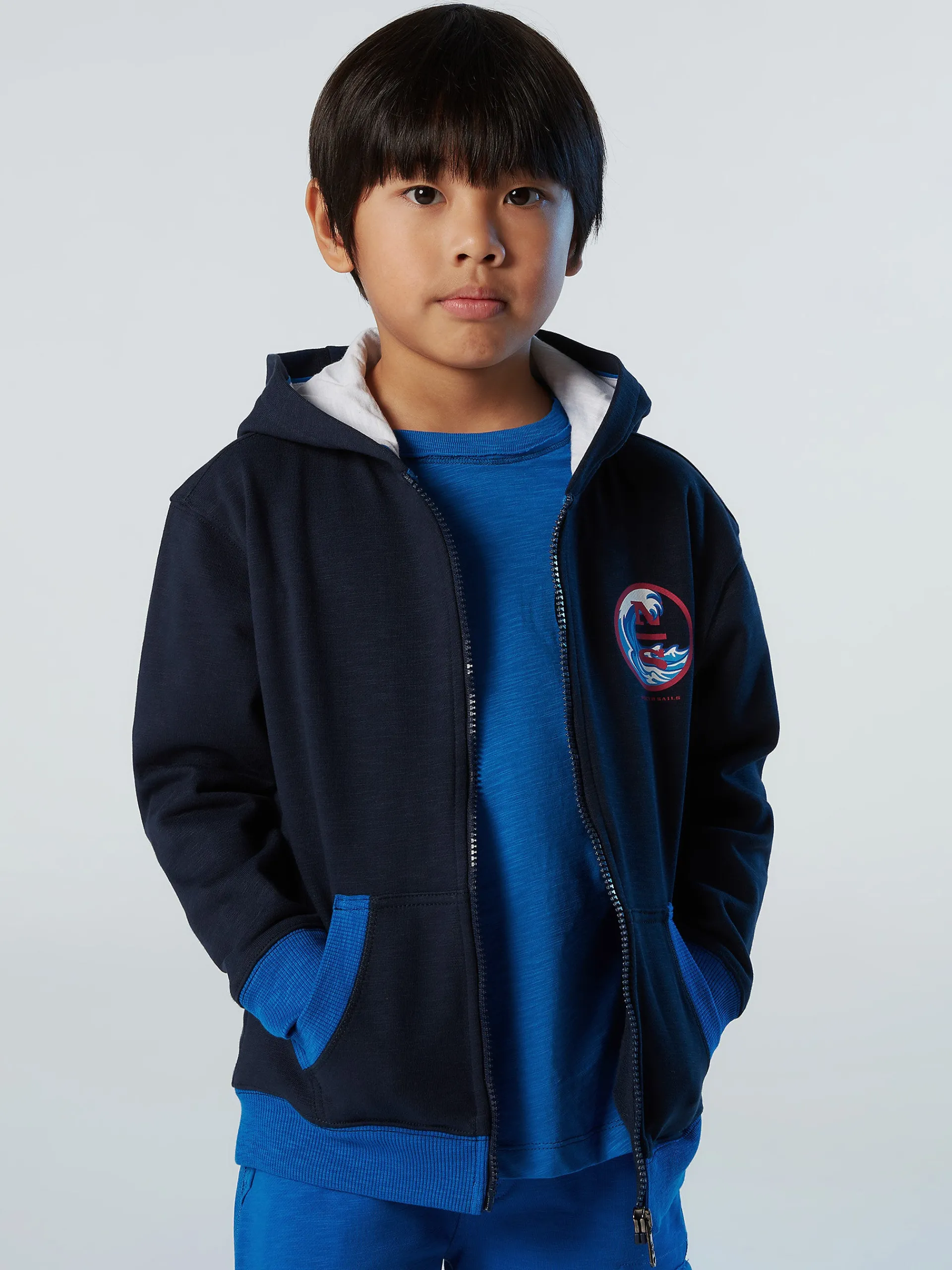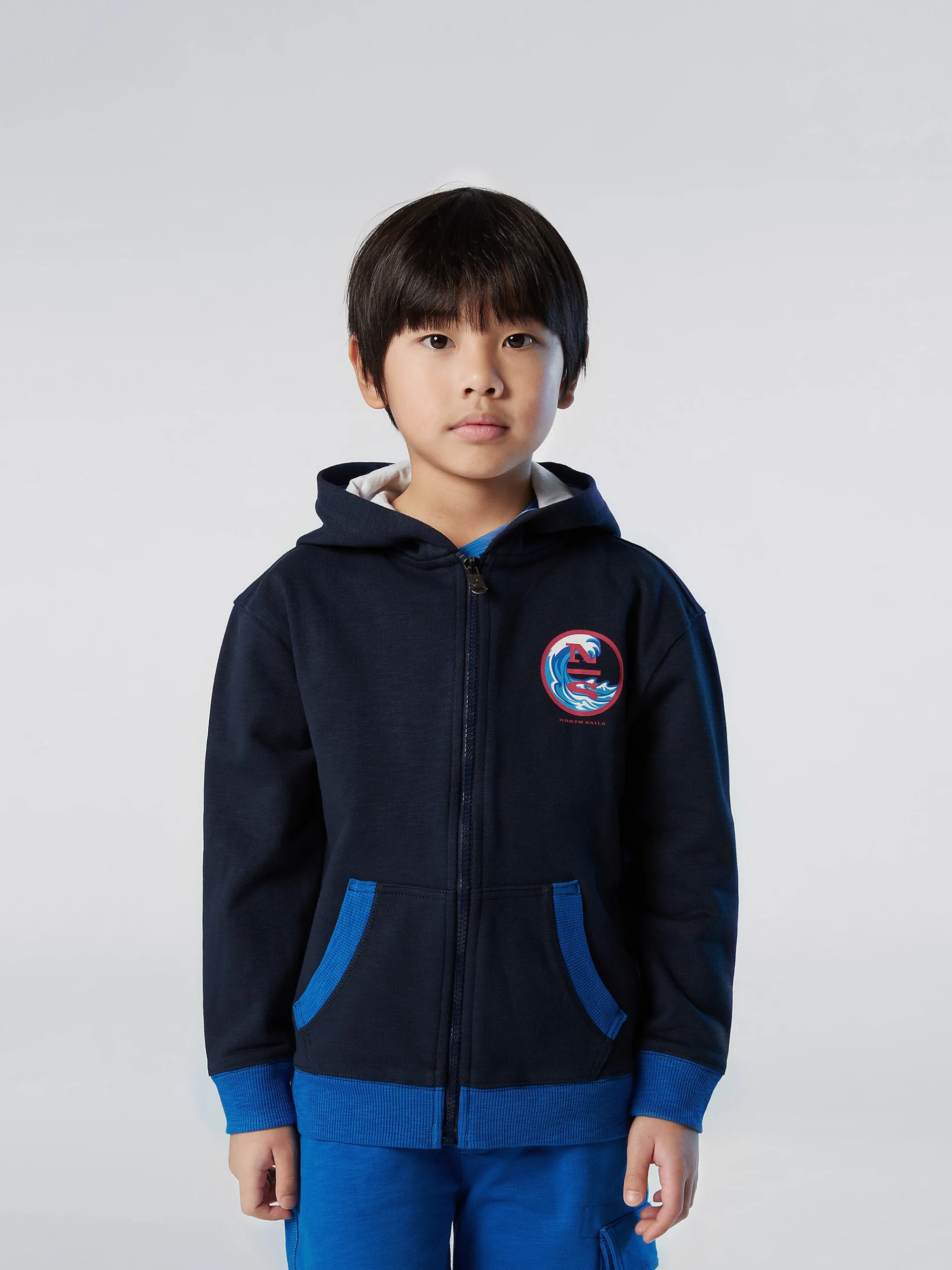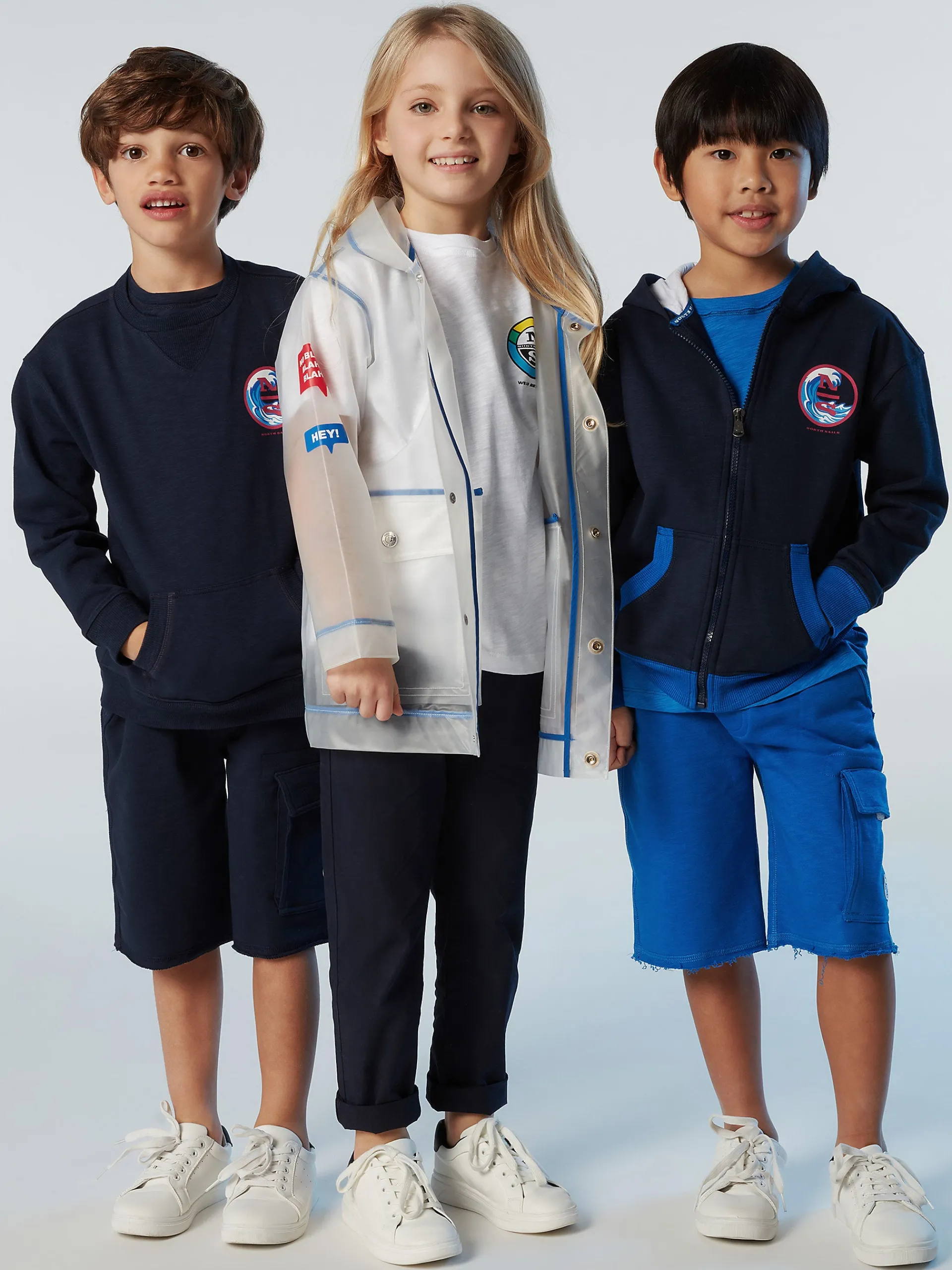 Questa felpa con cappuccio è l'elemento grafico ironico che aggiorna il guardaroba dei bambini. Realizzata in cotone organico fiammato che riduce le emissioni e il consumo d'acqua. La stampa grafica sul retro celebra la nostra passione per l'Oceano. I bordi a costine dal colore a contrasto e la chiusura con zip offrono massimo comfort.