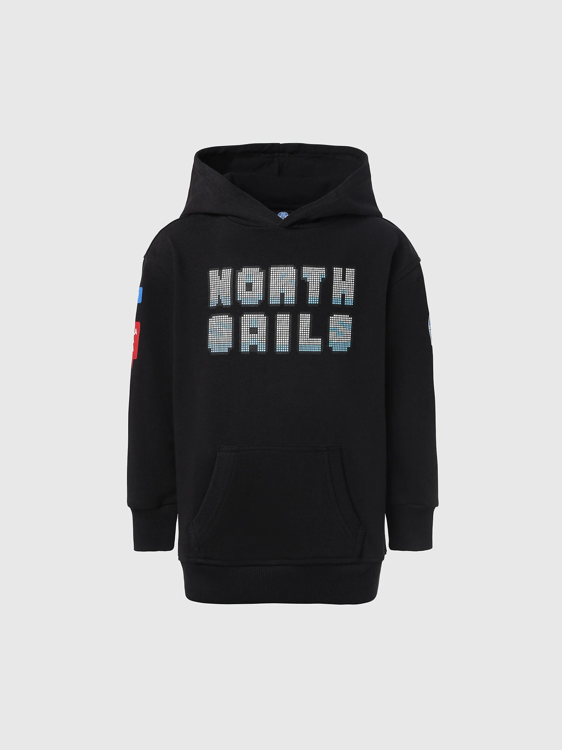 Questa felpa hoodie per bambini è realizzata in misto cotone organico e poliestere riciclato che riduce gli sprechi e limita le emissioni. Il modello ha una vestibilità comoda con cappuccio e tasche a marsupio, si caratterizza per il lettering North Sails pixelato sul davanti e la grafica in stile SMS sulla manica.