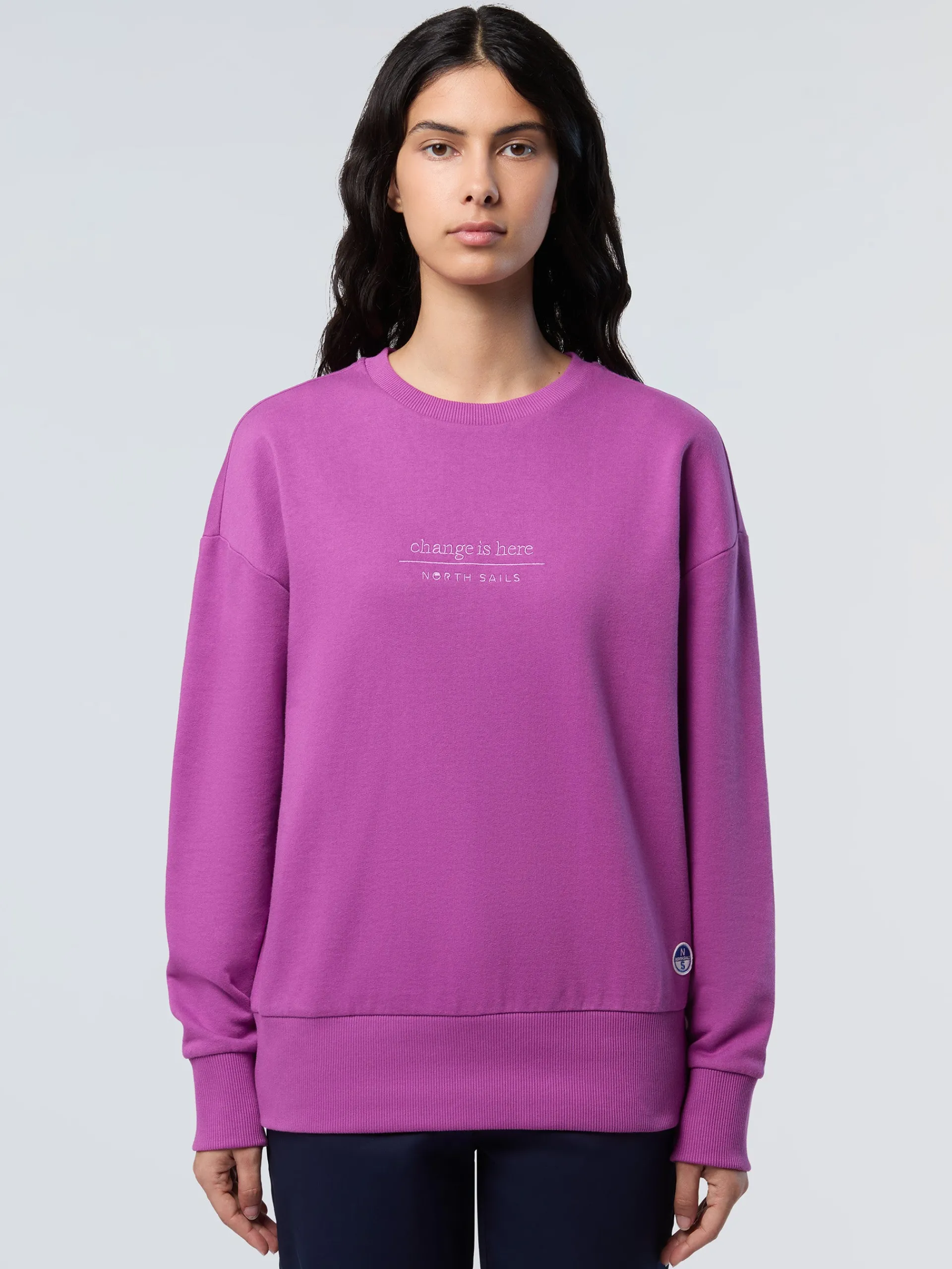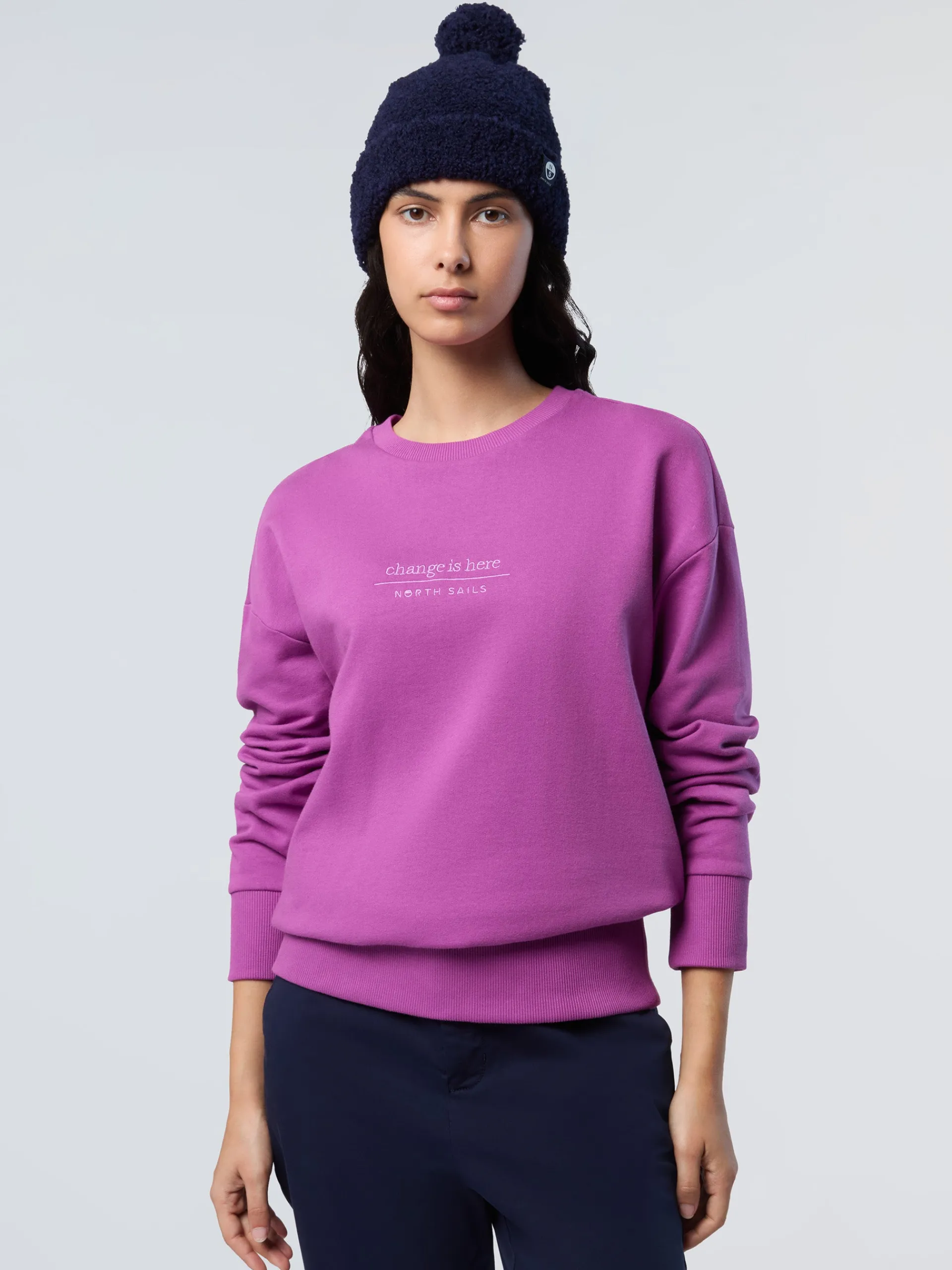 Change is here! Partecipa al cambiamento e dichiara il tuo impegno per il pianeta con questa felpa in cotone. Il modello è un'aggiunta chic del guardaroba quotidiano e si caratterizza per la vestibilità boxy con fondo alto a costine e maniche a giro basso. Slogan ricamato sul davanti e patch iconica North Sails applicata al fondo.