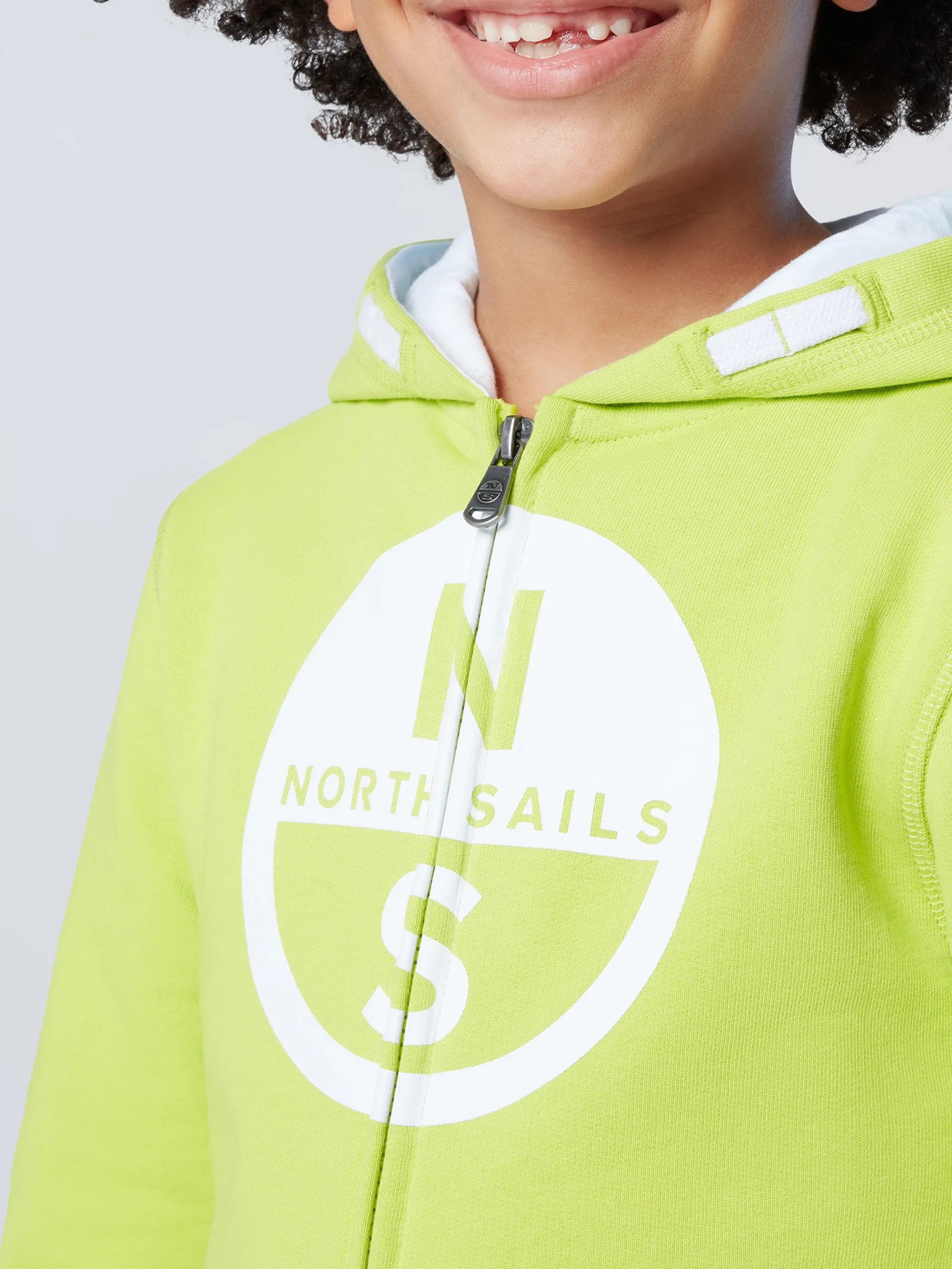 North Sails reinterpreta un classico casual dei bambini in chiave funzionale e sostenibile. Questa felpa hoodie è realizzata in cotone organico, morbido sulla pelle e attento al pianeta. Il cappuccio e la chiusura con zip rendono il modello perfetto per i look a strati della mezza stagione, mentre il maxi logo stampato è un'autentica dichiarazione di stile.