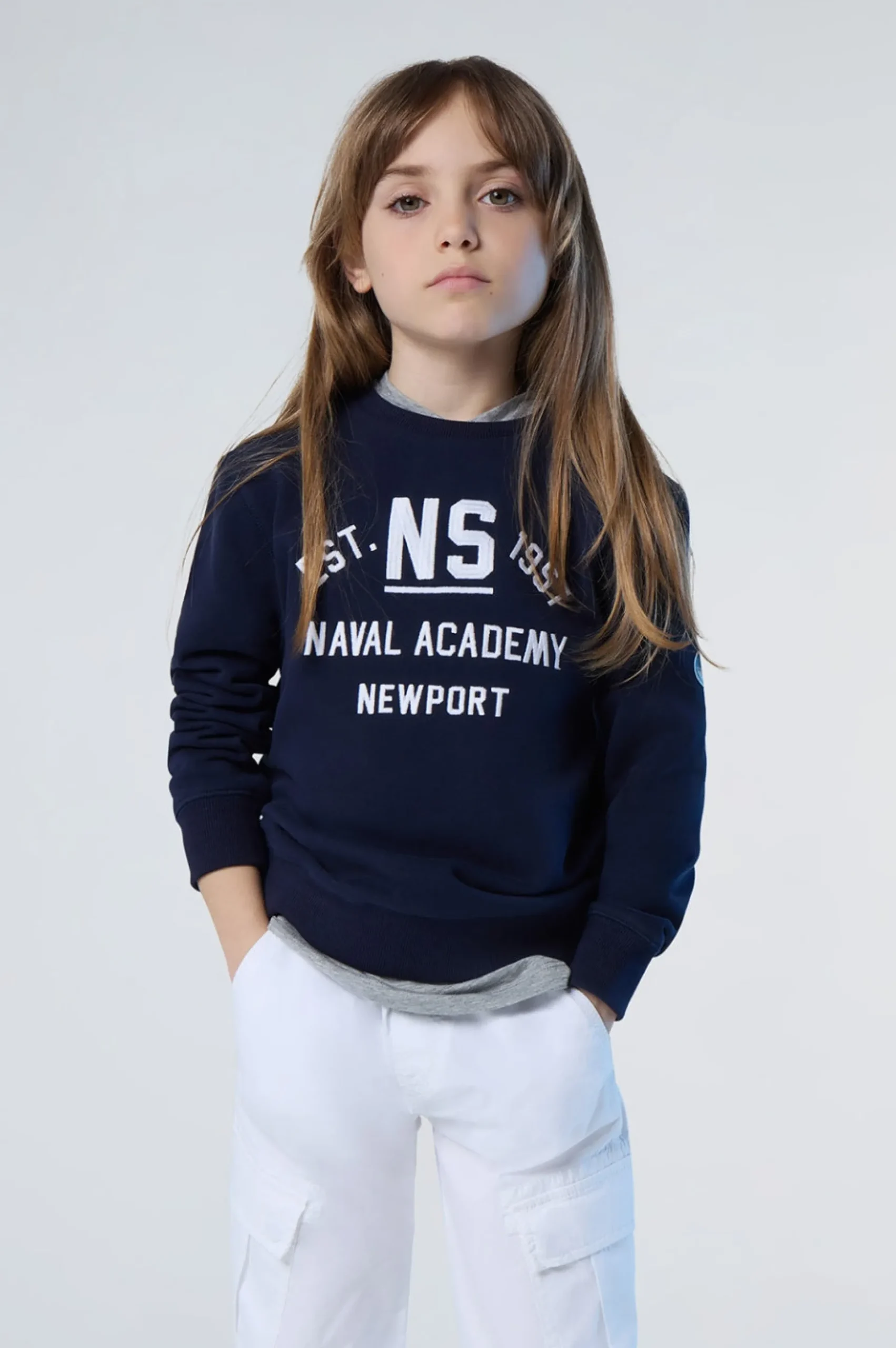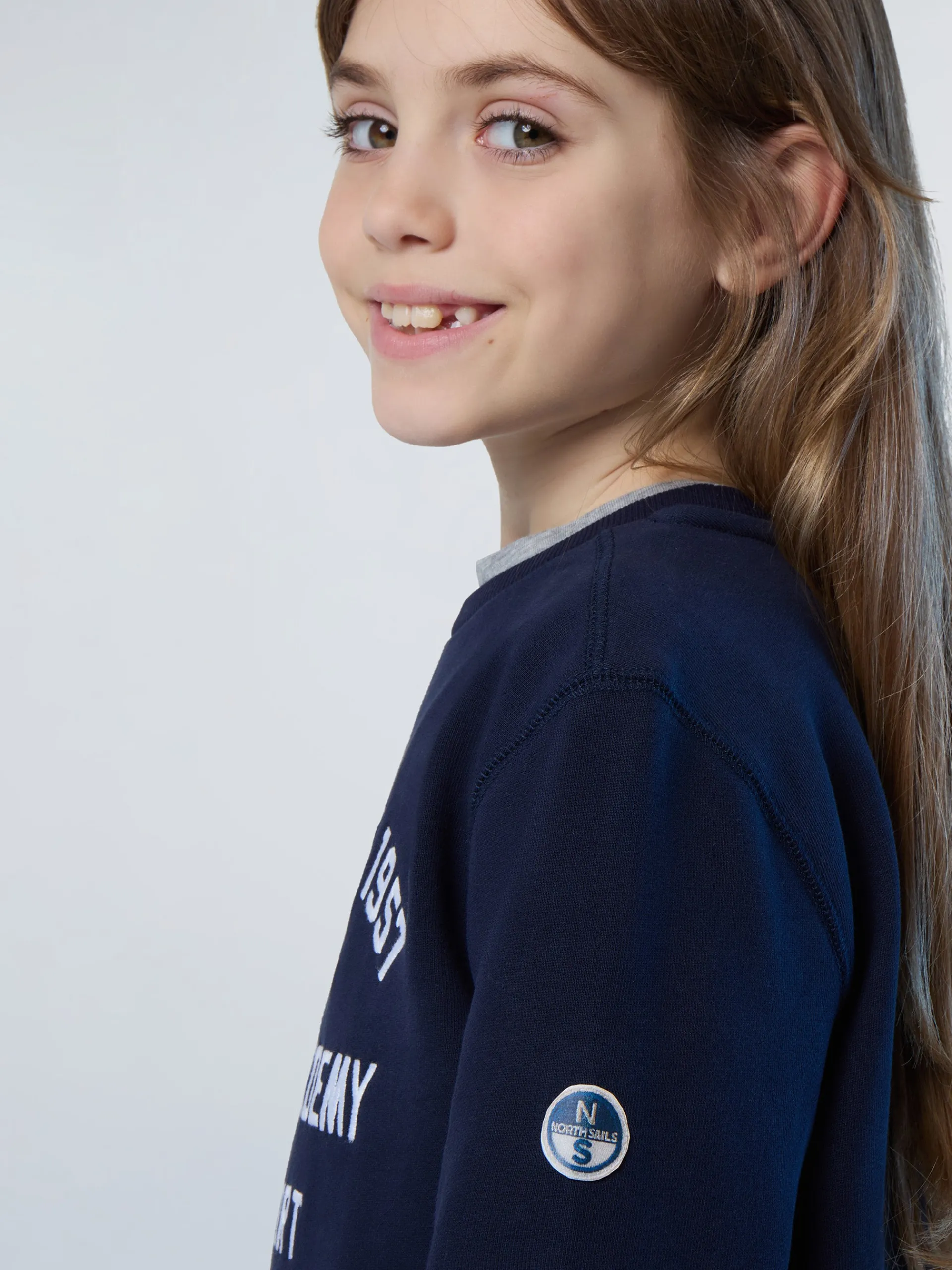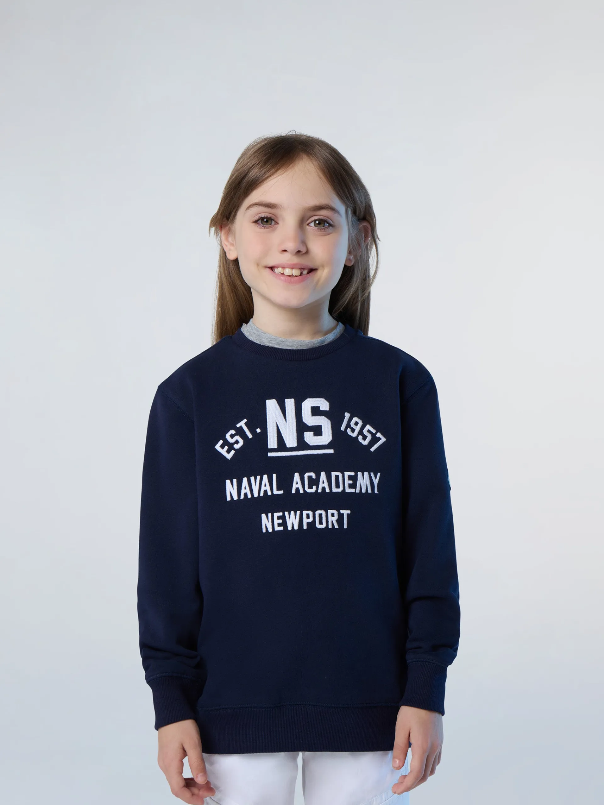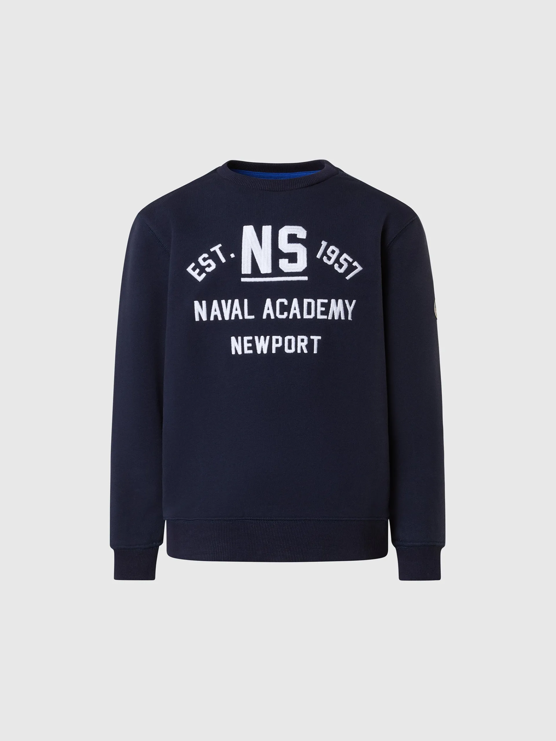 La felpa da bambino che richiama la storia North Sails legata al mondo della vela. Il modello è realizzato in cotone organico soffice sulla pelle e gentile con il pianeta perchè riduce le emissioni nocive e il consumo di acqua rispetto alle fibre tradizionali. Si caratterizza per il ricamo "Naval Academy Newport" in stile college e la classica patch applicata sulla manica.