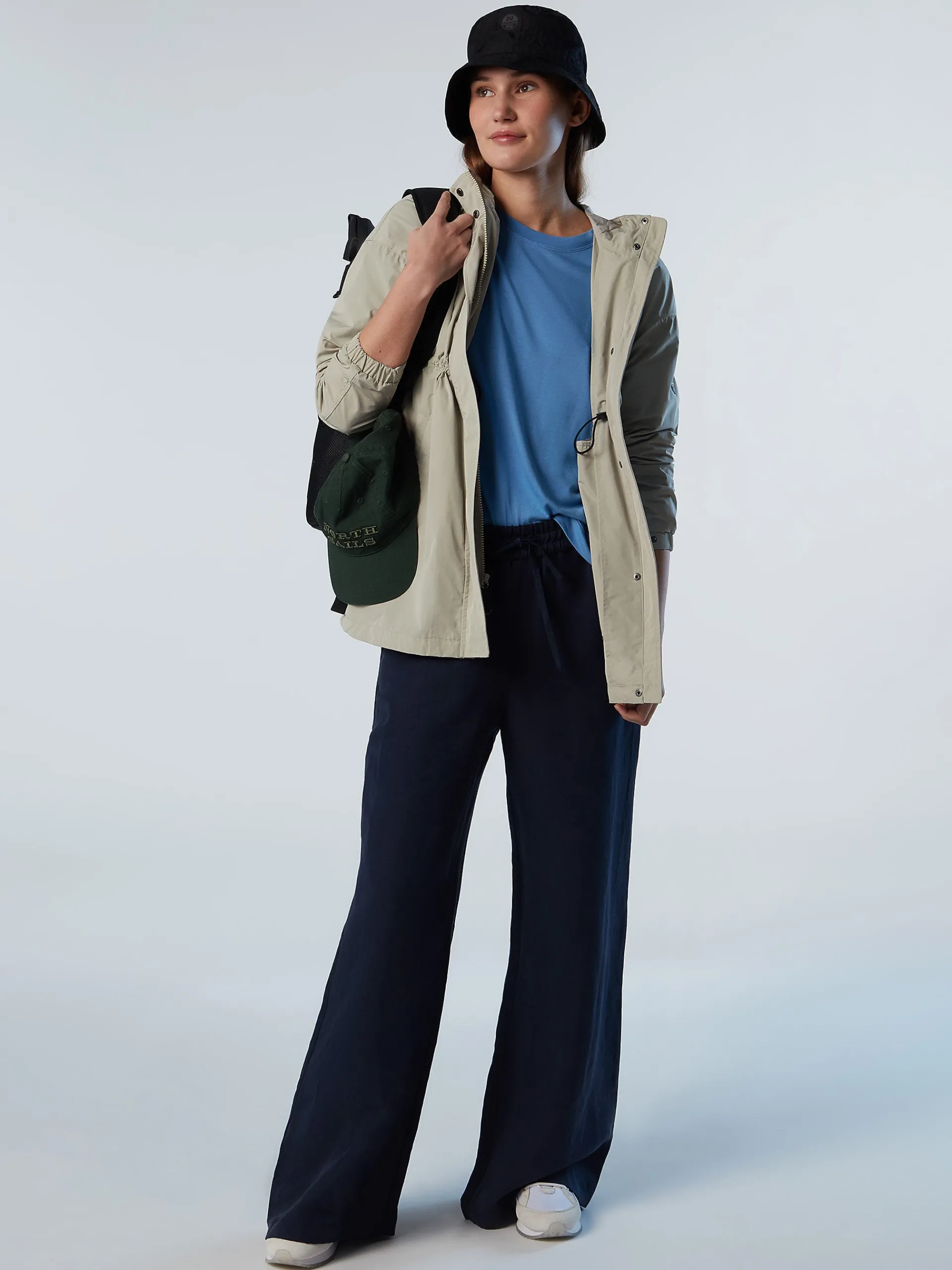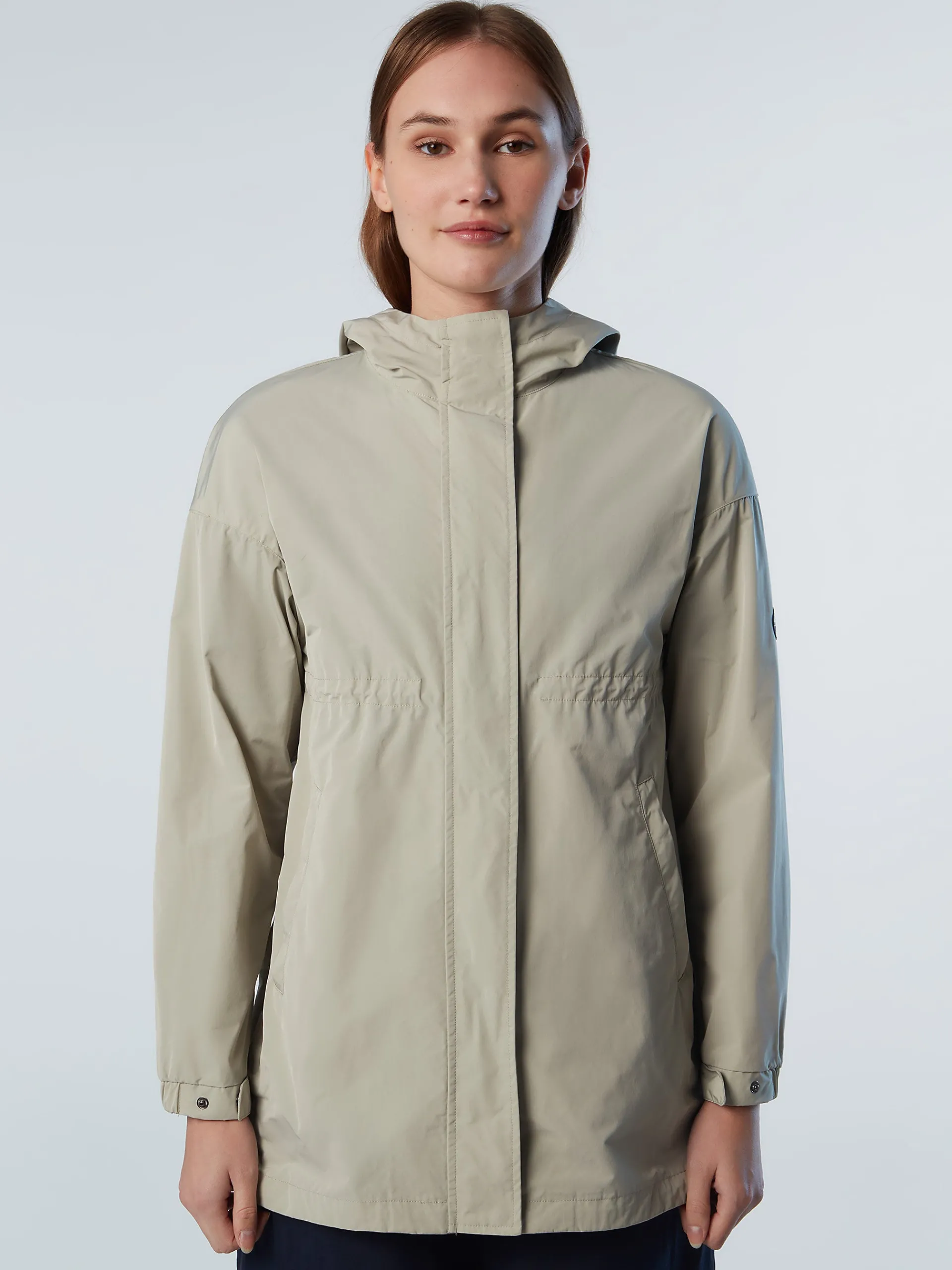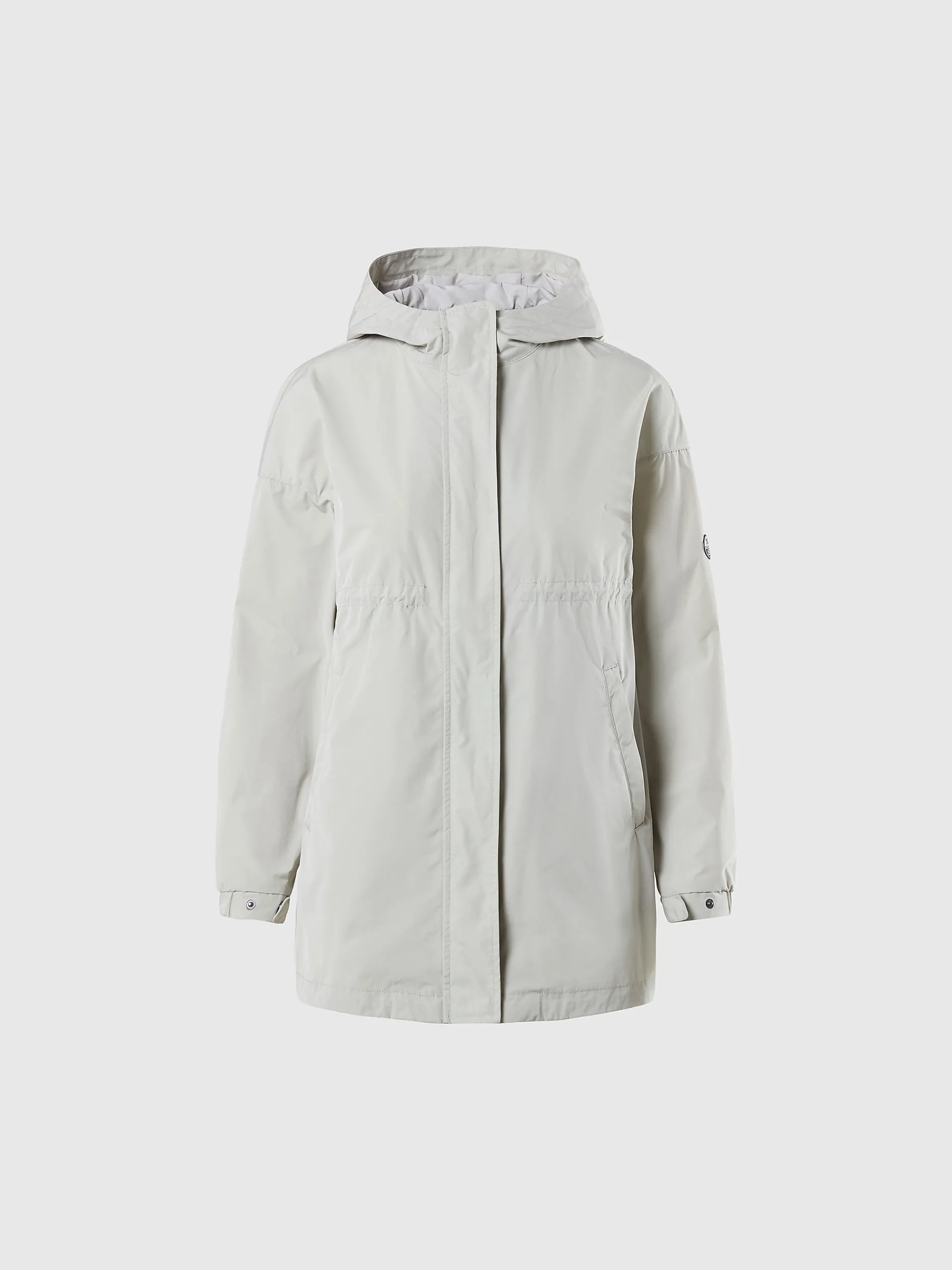 La giacca Nonuu ha lunghezza media e una silhouette pratica ma elegante, stretta in vita con coulisse regolabile per un look ultra femminile. Il modello è realizzato in tessuto memory riciclato, progettato per rispettare il Pianeta e mantenere una forma perfetta anche dopo l'uso prolungato nel tempo. Il cappuccio avvolgente e l'orlo con coulisse assicurano un'ottima protezione, mentre il logo riflettente sulla manica aggiunge un tocco distintivo.