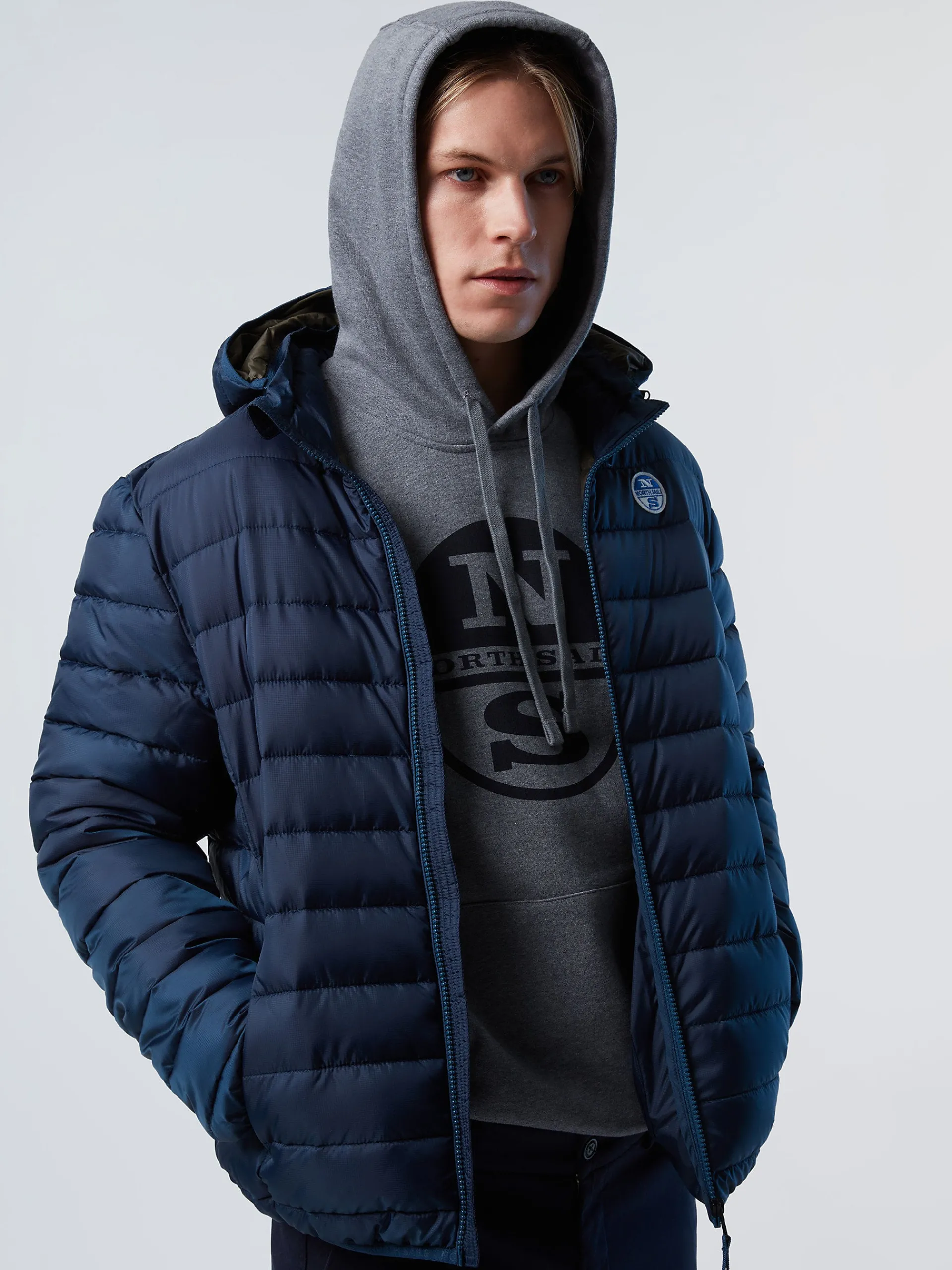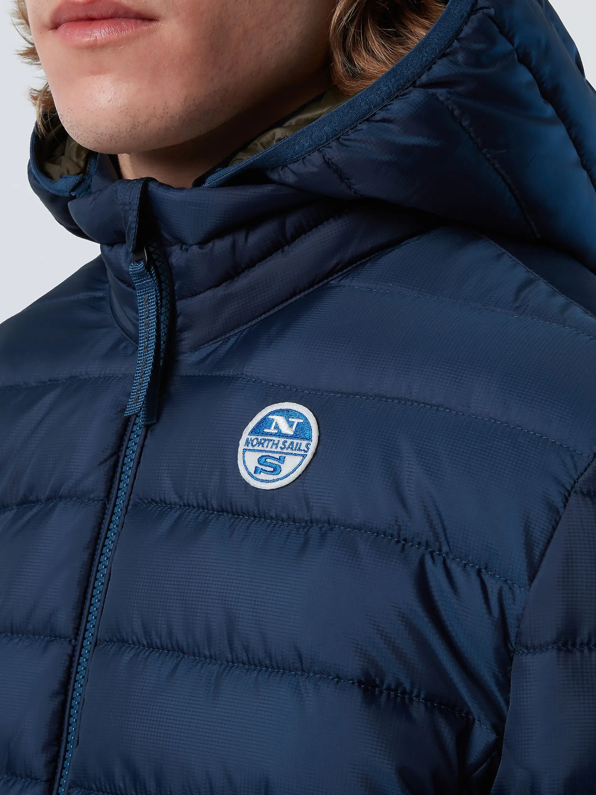 La giacca Sky è un must per chi vuole affermare il proprio stile anche durante le avventure outdoor. Il modello da uomo è realizzato in tessuto micro-ripstop riciclato con rivestimento idrorepellente e imbottitura in Repreve che riduce la quantità di plastica dispersa in mare. Si caratterizza per il cappuccio da indossare in caso di pioggia, la trapuntatura che trattiene il calore e il logo in feltro sul petto per un tocco North Sails.