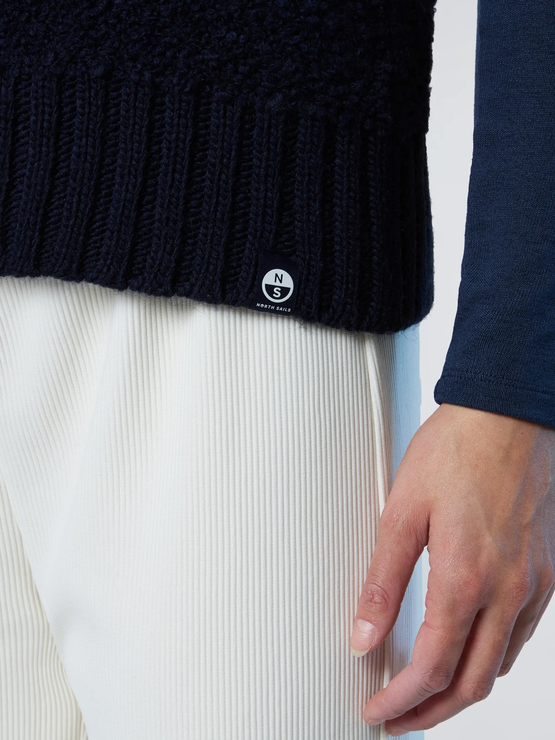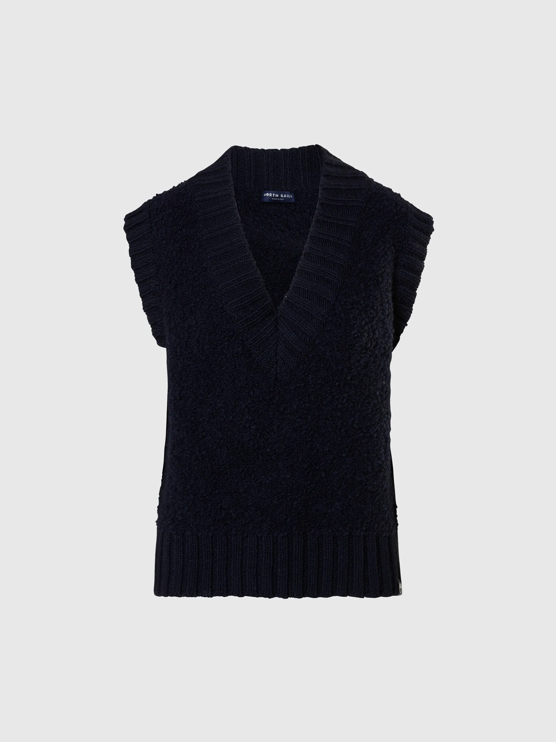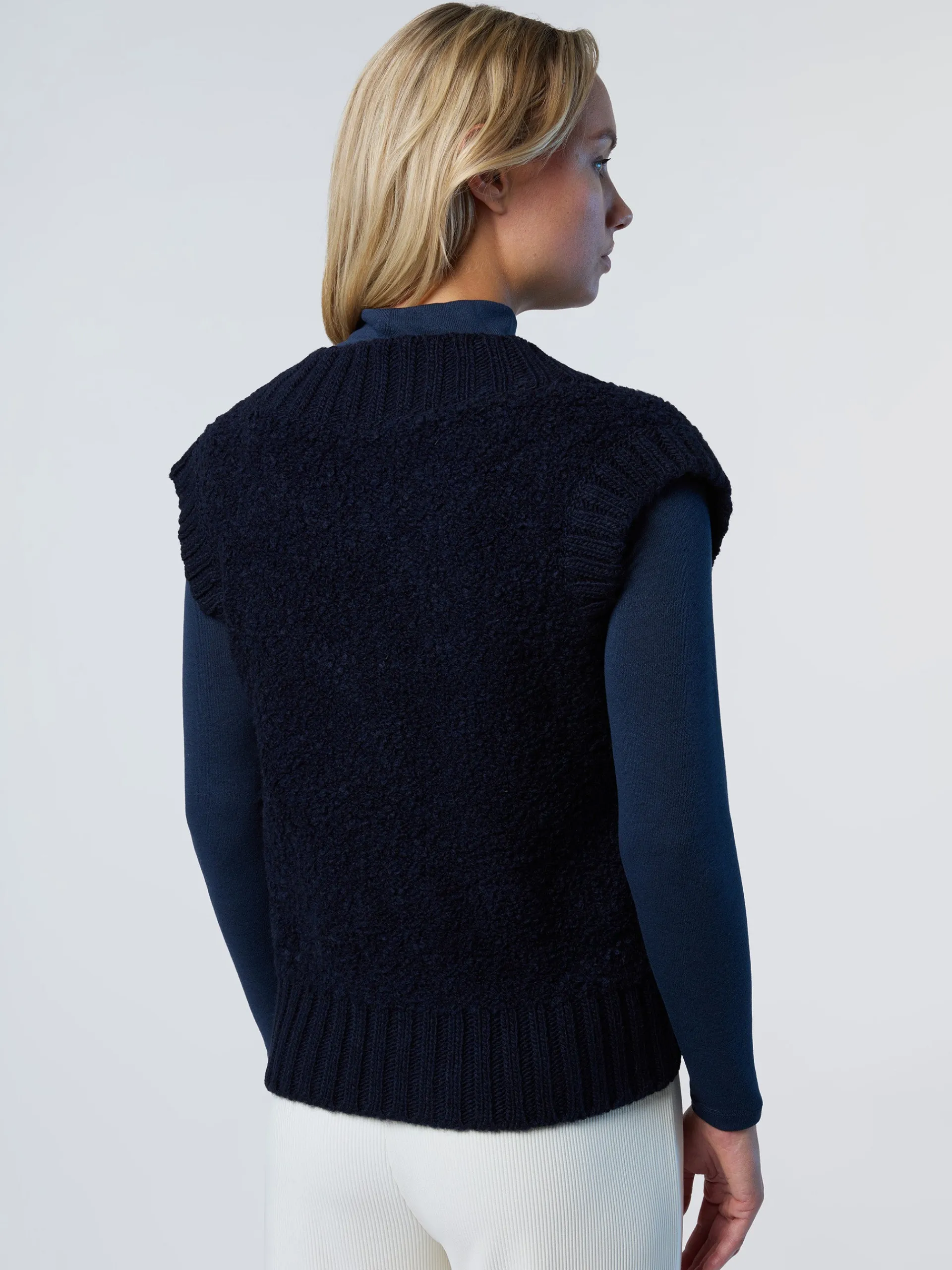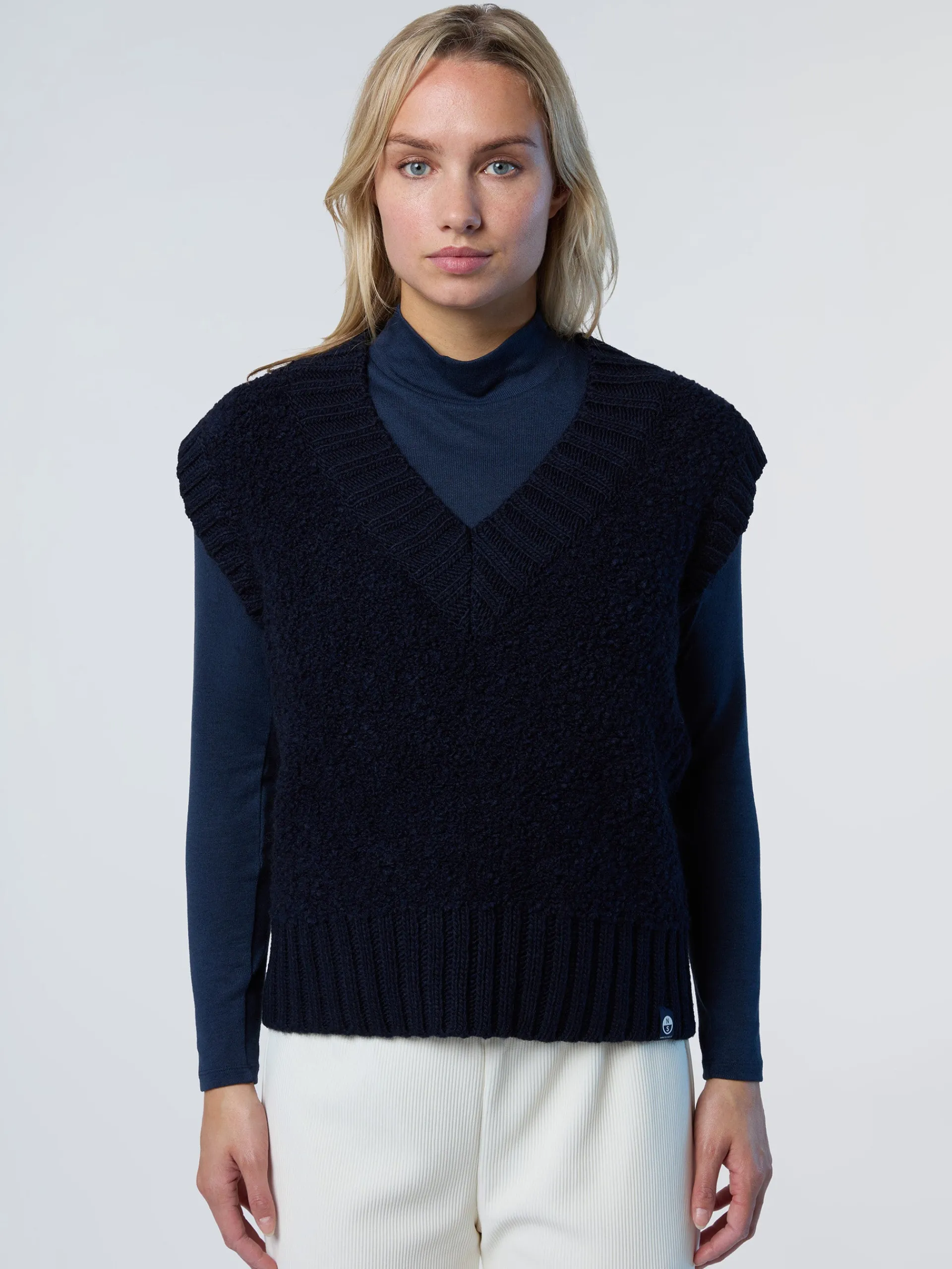 Questo gilet è perfetto per dare una nota raffinata ai look del weekend. Realizzato in bouclé di misto alpaca e fibre riciclate, il modello conferma il nostro impegno positivo per il pianeta. La sua silhouette rilassata e femminile è rifinita con un elegante scollo a V, i bordi a coste e la label North Sails al fondo.