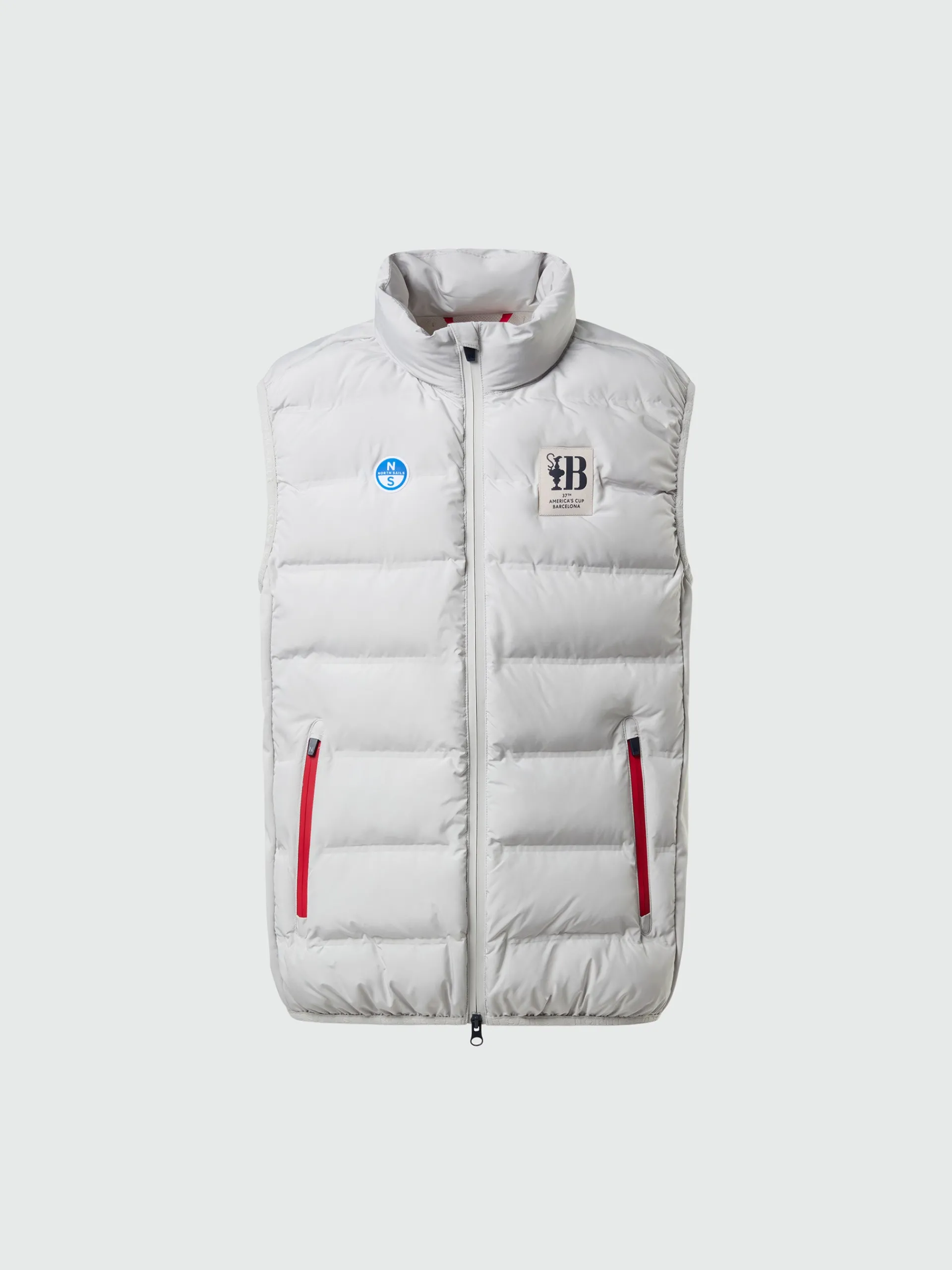 An exclusive take on a transitional layering hero: this men's quilted vest is part of the America's Cup collection, specially dedicated to the 37th edition of the historic sailing race. Made from recycled fabrics for a lighter footprint, it features a water-repellent quilted front and a breathable softshell back for ultimate between-season versatility. Edged with logo stretch binding, the design is elevated with a classic North Sails patch and the official regatta branding on the chest.