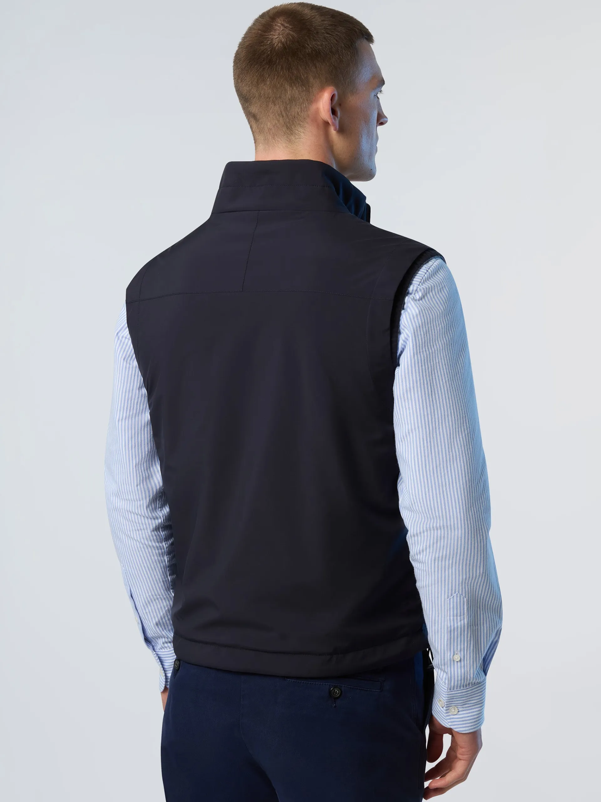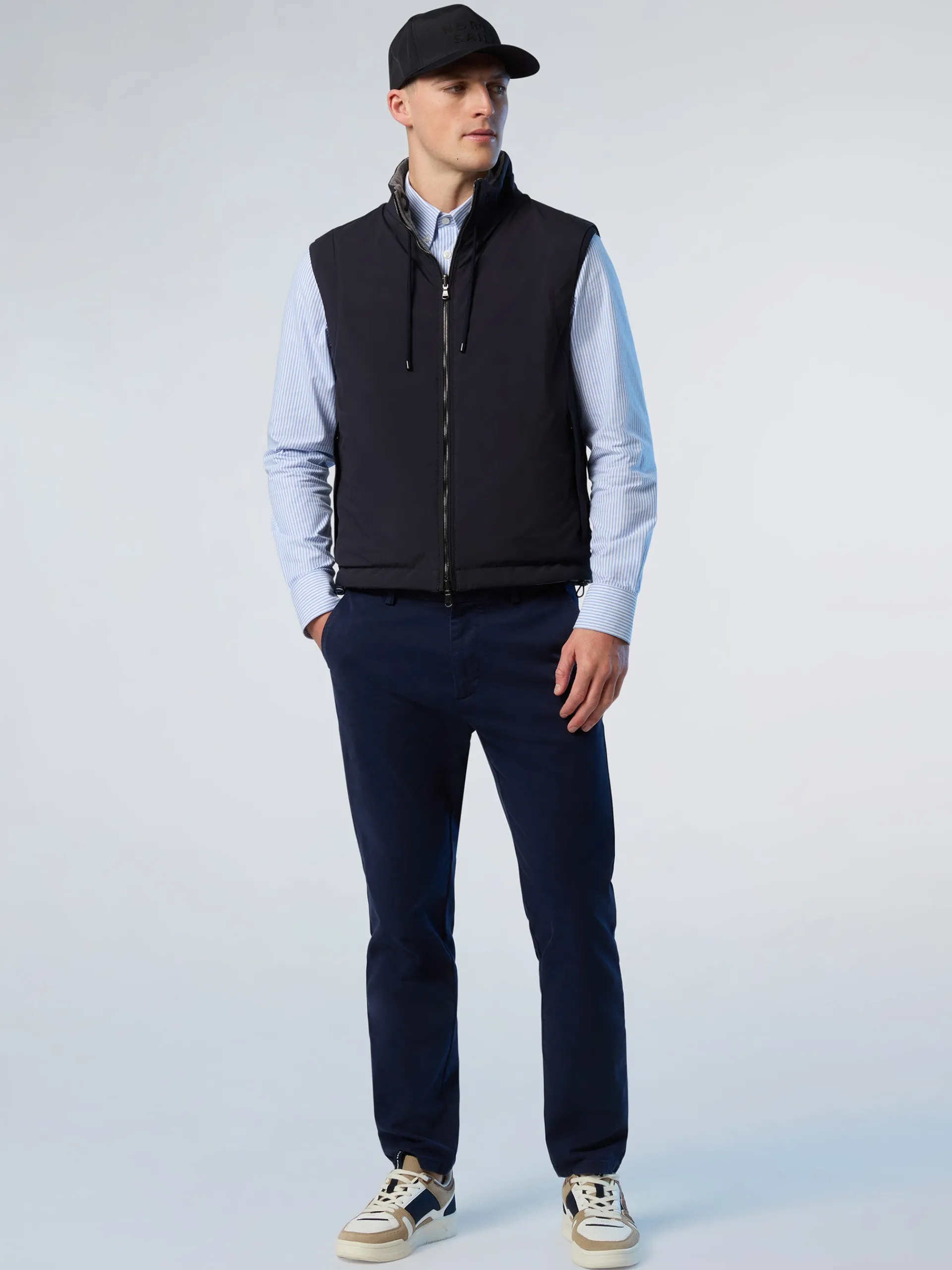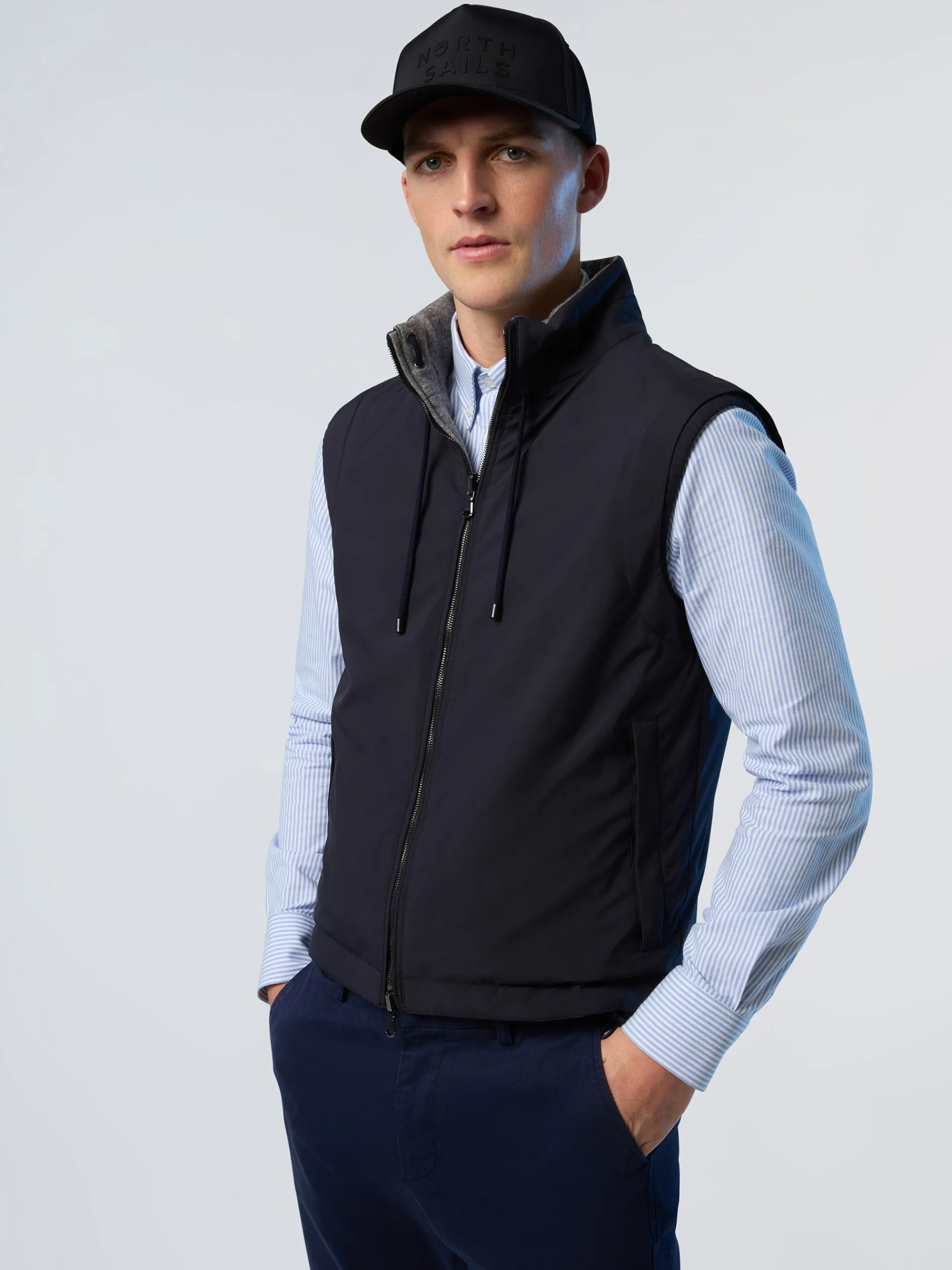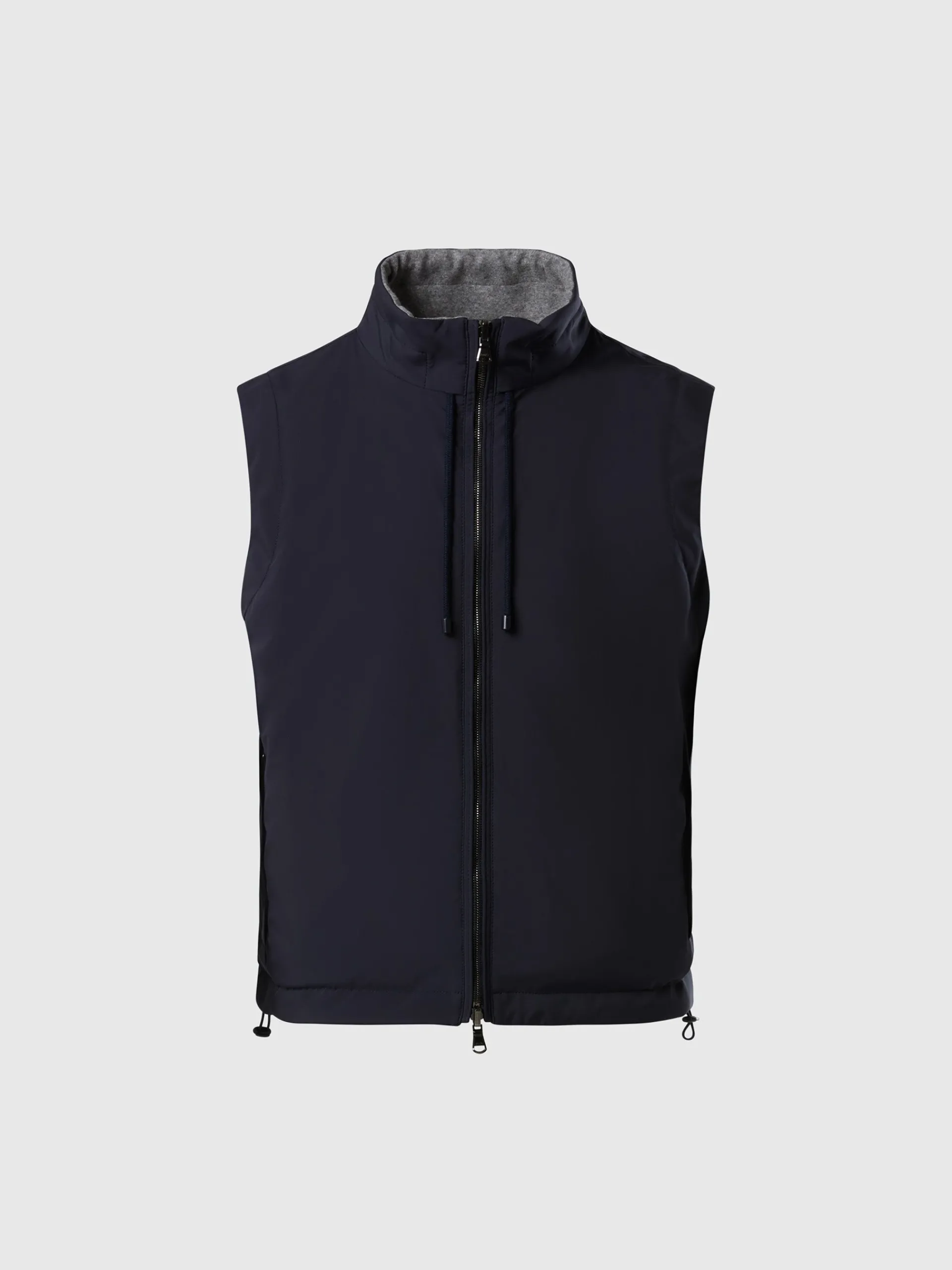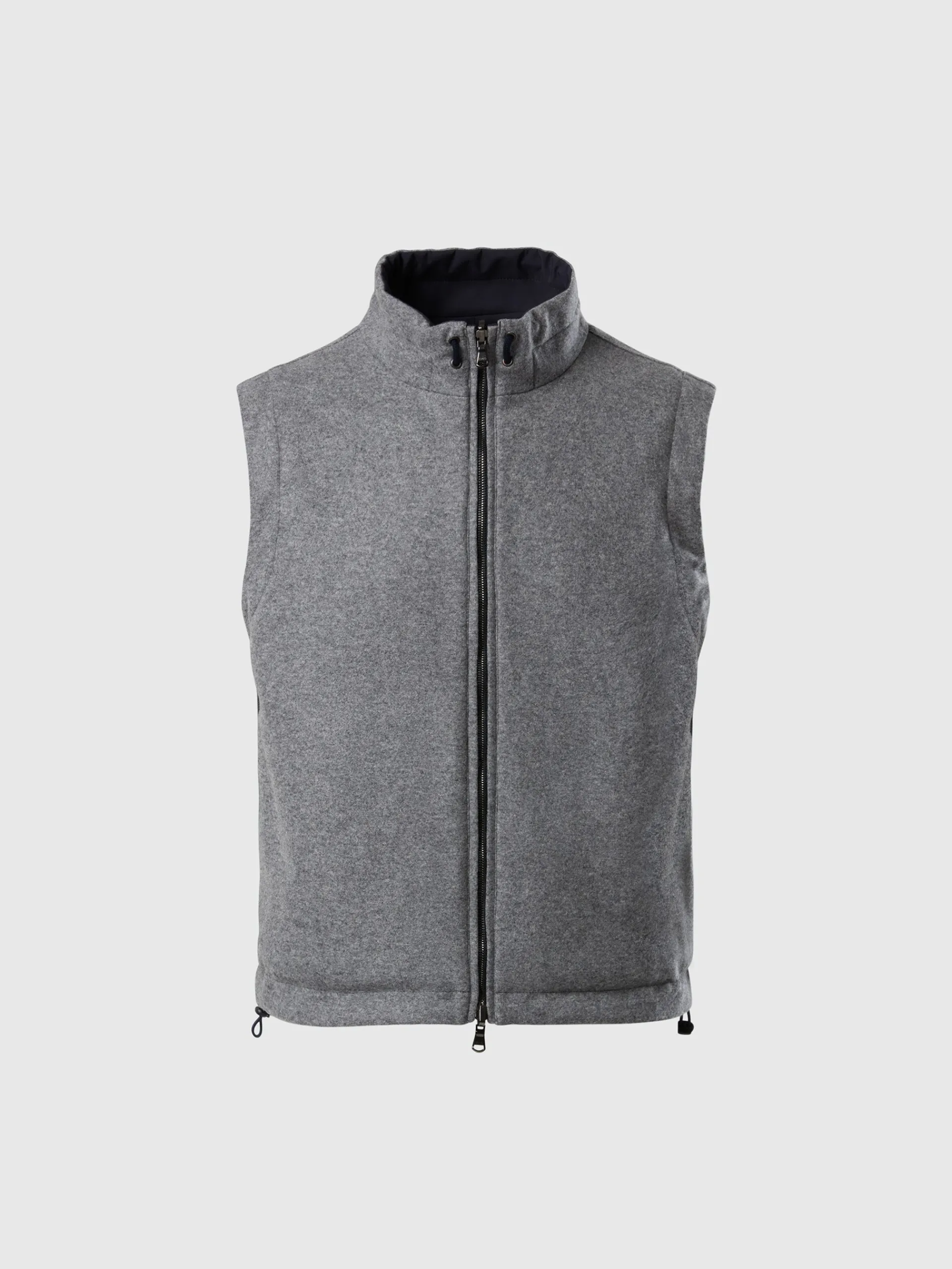 L'essenziale per il passaggio di stagione. Questo gilet reversibile è realizzato in collaborazione con SLOWEAR, il brand italiano lifestyle che promuove un consumo etico e sostenibile. Il modello combina un lato in nylon riciclato impermeabile Olmetex e un lato in lana mélange dal tocco soffice ed elegante. Presenta collo alto con coulisse e tasche sui lati.