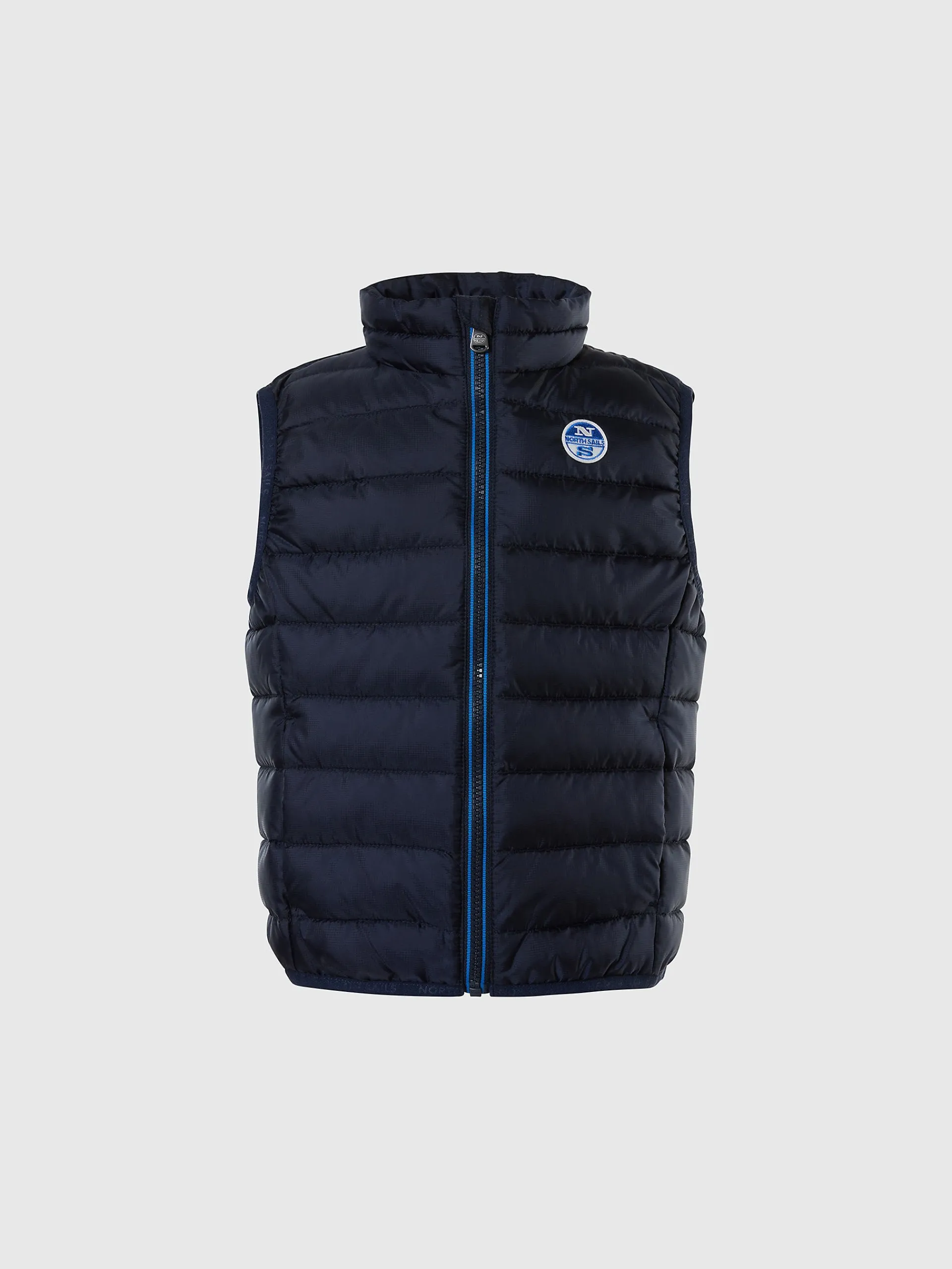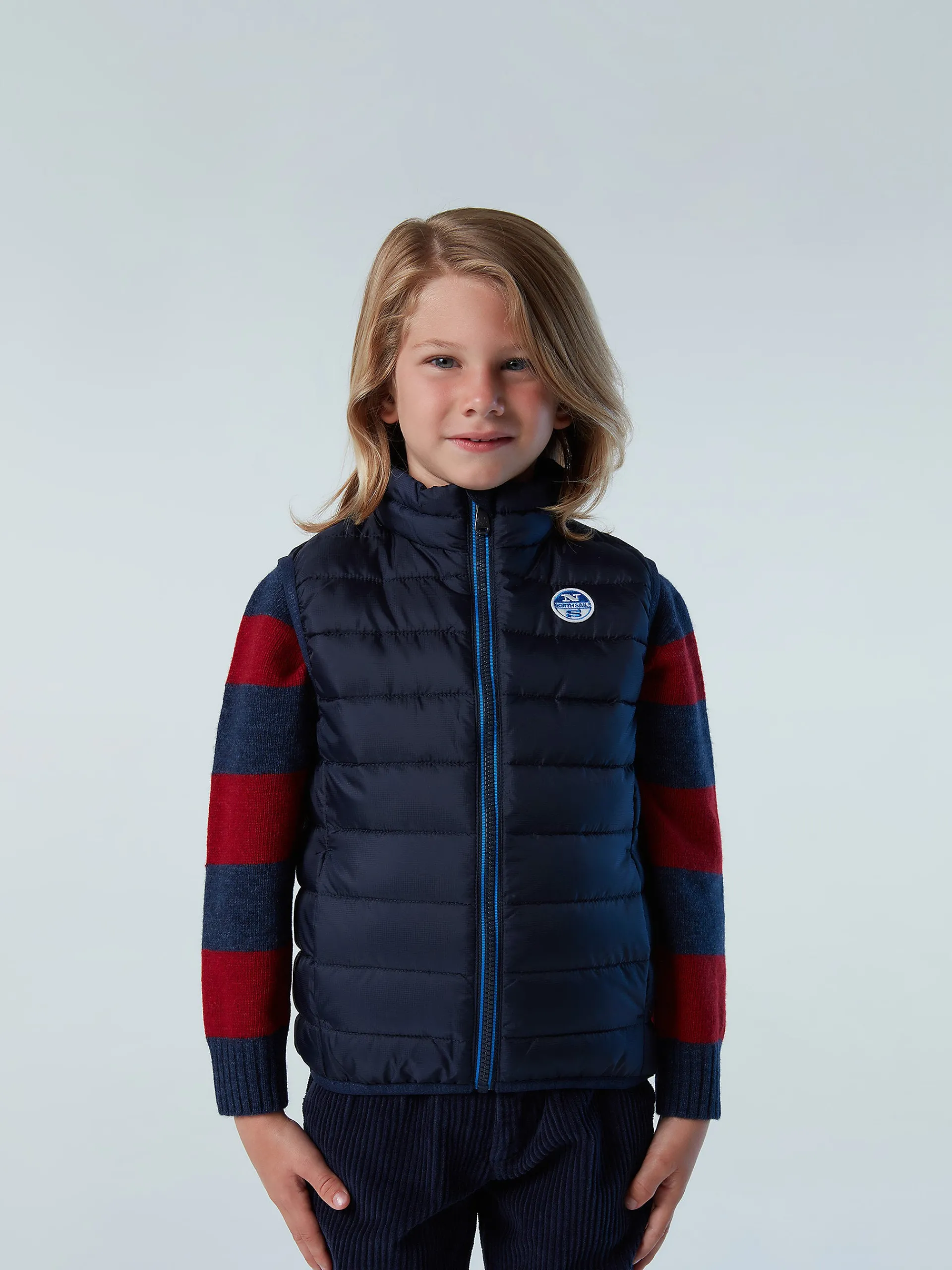 L'iconico gilet Skye da bambino è realizzato in micro-ripstop riciclato che contribuisce a ridurre la quantità di rifiuti dispersi nell'ambiente. Si caratterizza per il rivestimento idrorepellente e la trapuntatura a righe che offrono massima protezione, mentre il logo sul petto e la maxi stampa sulla fodera infondono un inconfondibile spirito North Sails al look.