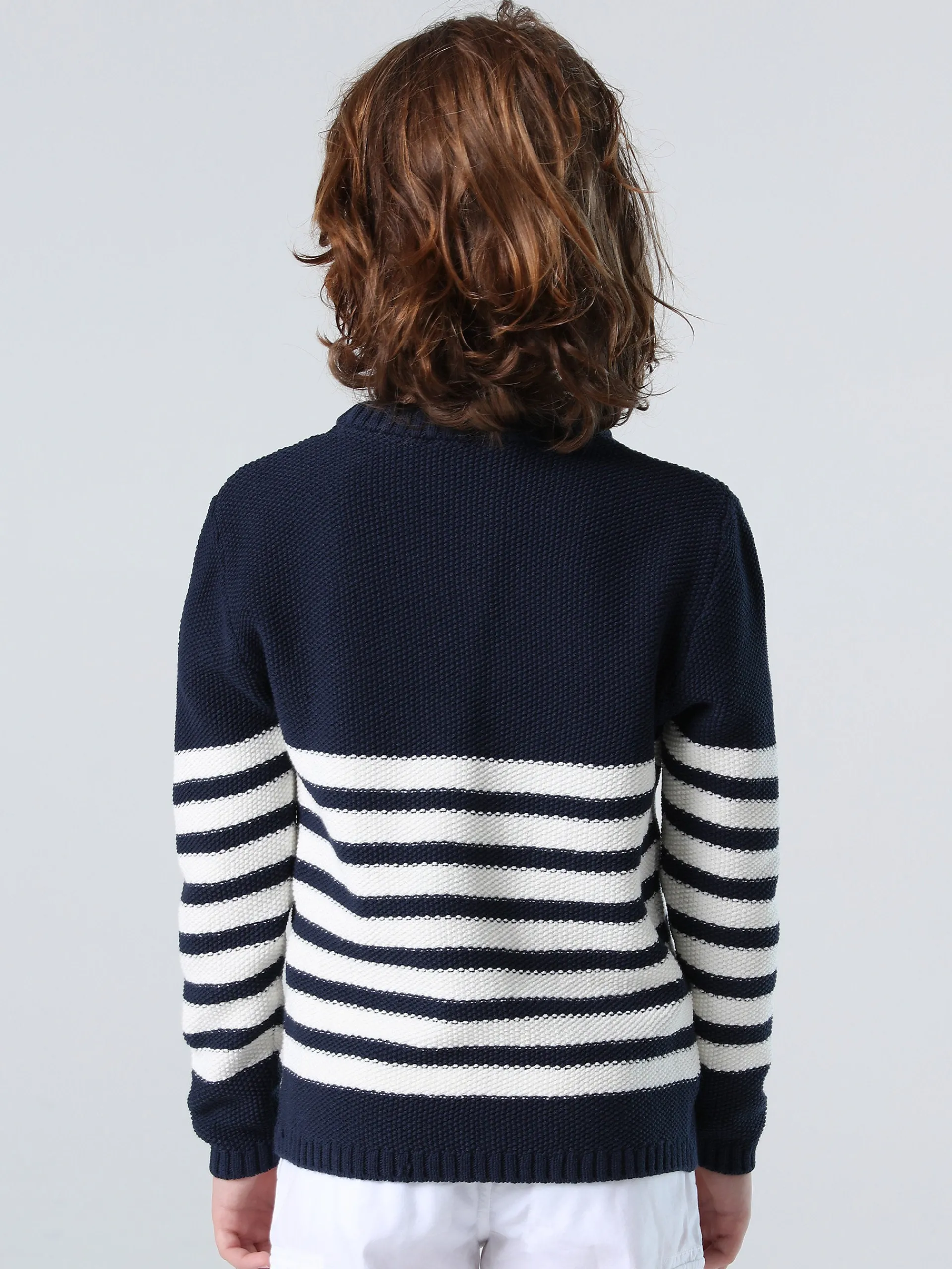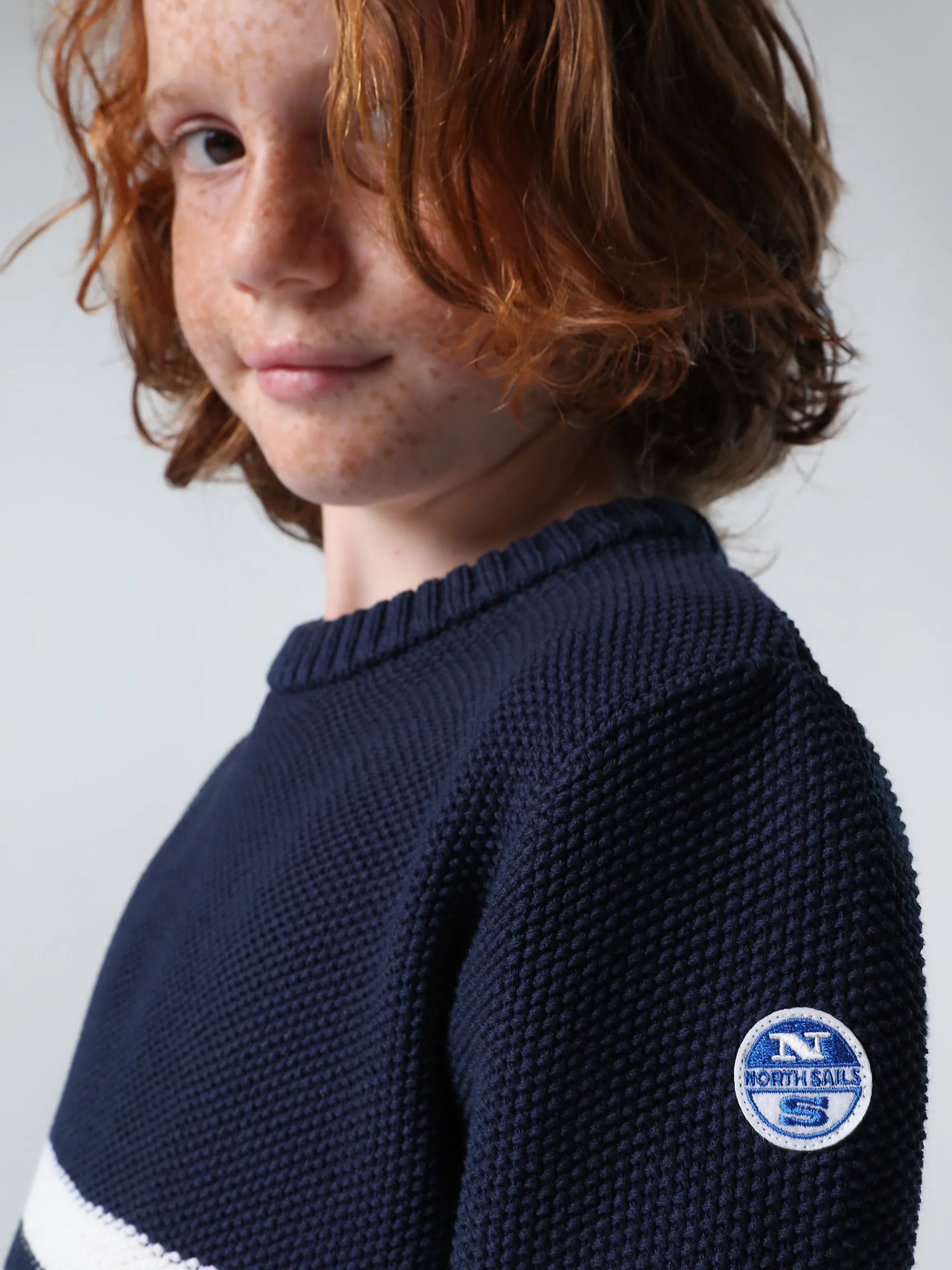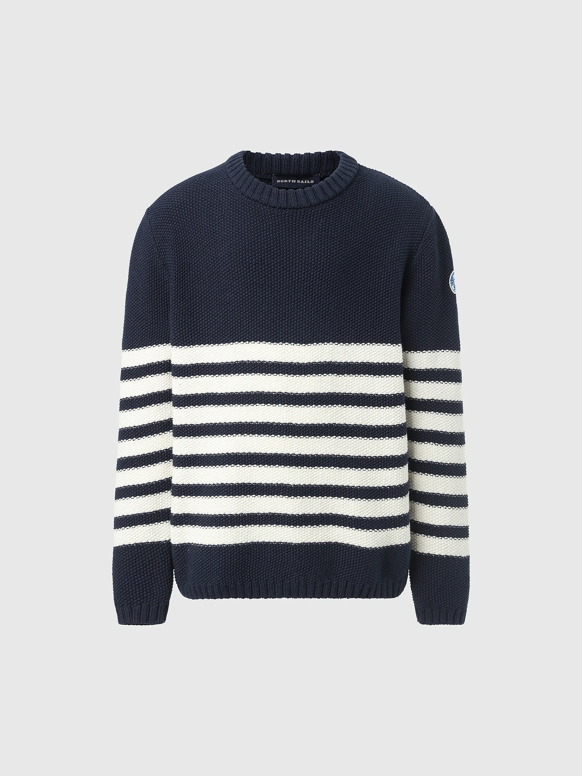 Questo maglione con iconico motivo a righe celebra il nostro heritage legato al mondo della vela. Il modello è realizzato in cotone organico, che riduce le emissioni rispetto alle fibre convenzionali, con l'aggiunta del nylon per una maggiore resistenza. Il classico logo in feltro impreziosisce la manica per un caratteristico tocco North Sails.