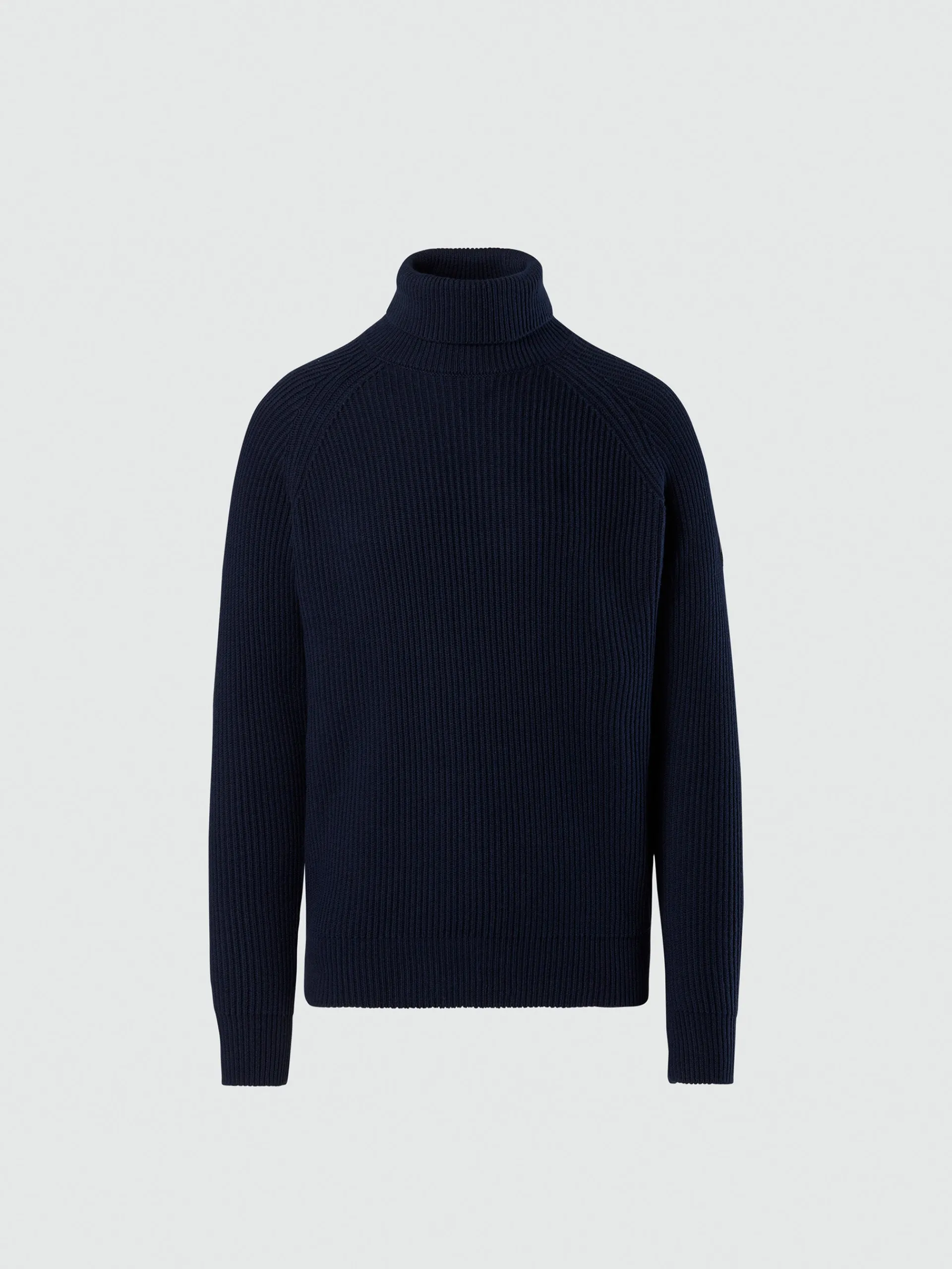Il maglione dolcevita pensato per la stagione più fredda e progettato per limitare l'impatto sul pianeta. Il modello è realizzato in un morbido filato di lana e cotone organico che contribuisce a ridurre le emissioni nocive e il consumo di acqua rispetto alle fibre tradizionali. Si caratterizza per la lavorazione a costa inglese che richiama i classici capi da marinaio e le maniche raglan per la massima libertà di movimento.