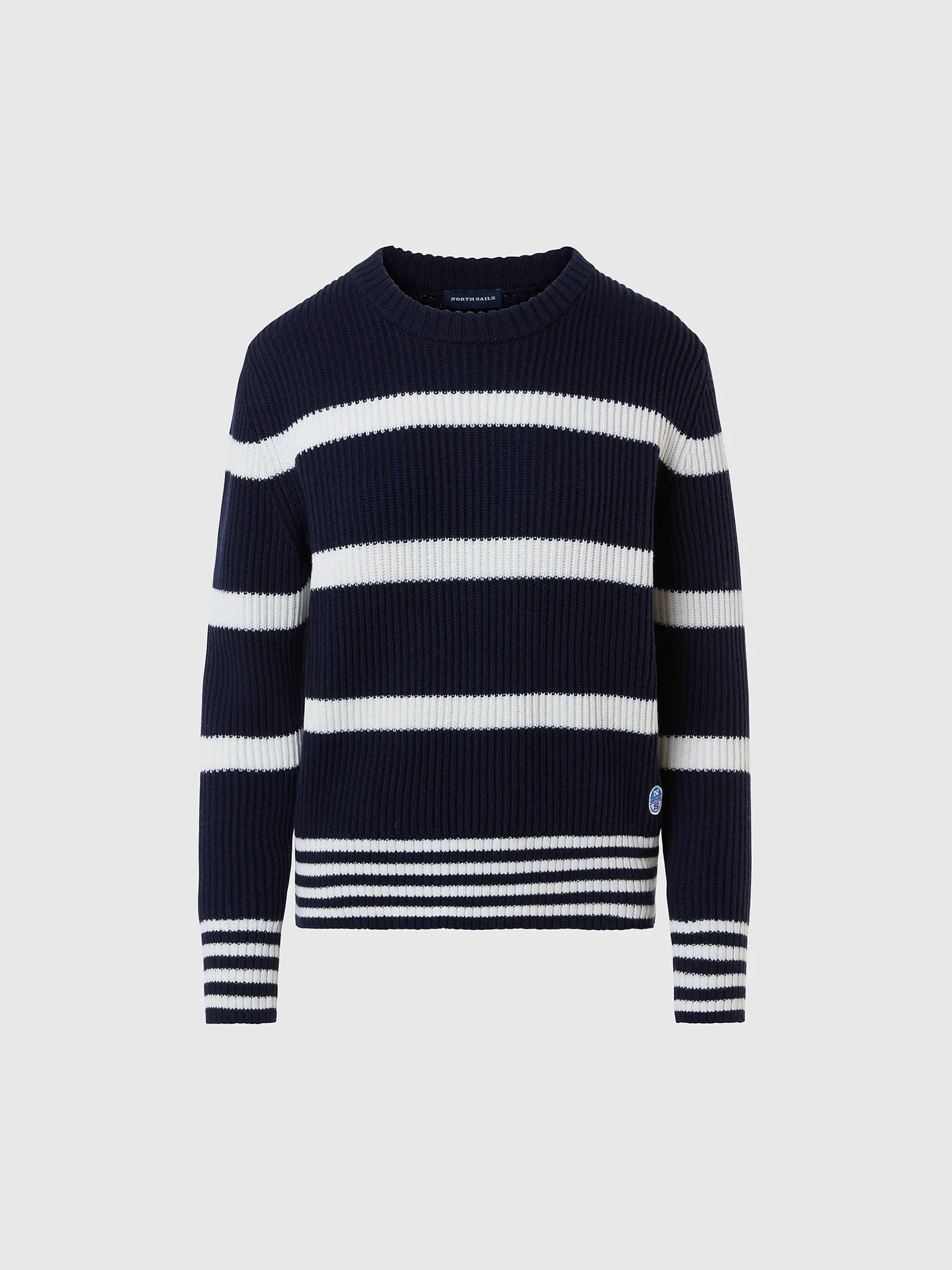 Questo maglione girocollo da donna con classiche righe nautiche richiama il nostro heritage legato al mondo della vela. Il modello è perfetto per i look leisure e quotidiani, è realizzato in misto cotone organico e lana con lavorazione a costa inglese. Bordi con motivo a righe più sottili e logo al fondo.