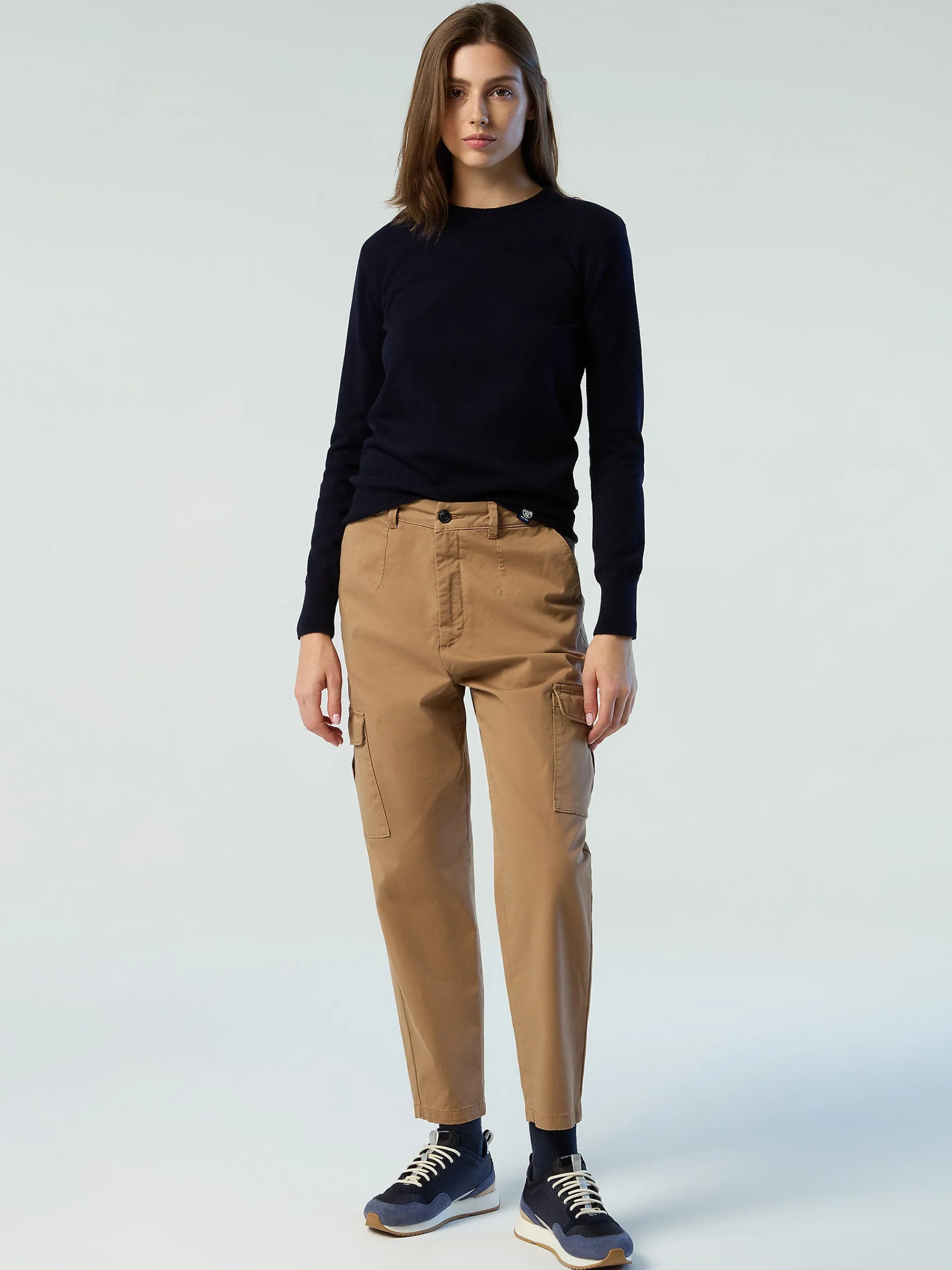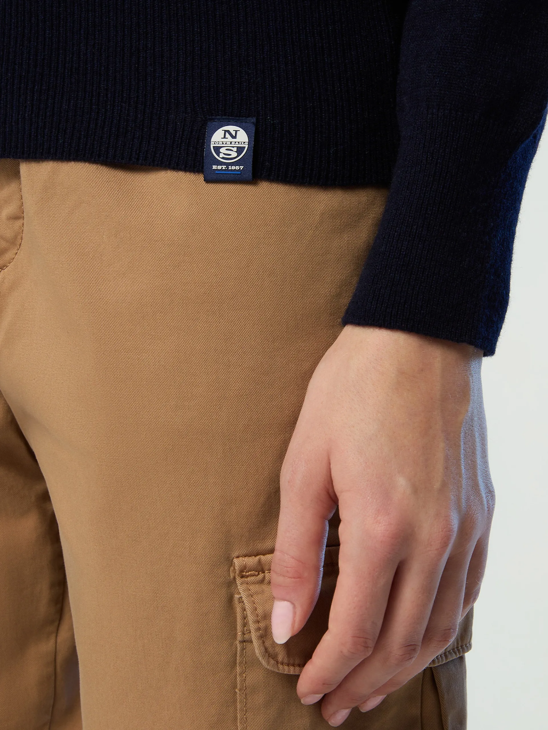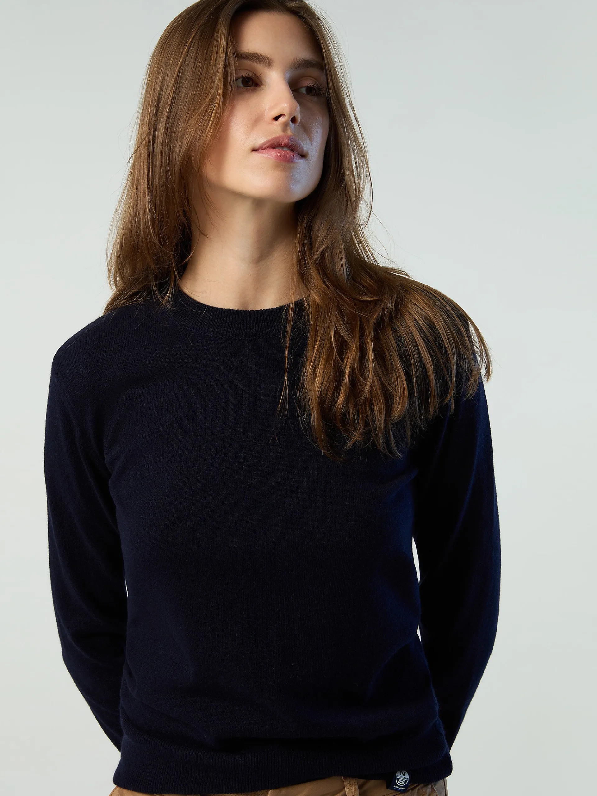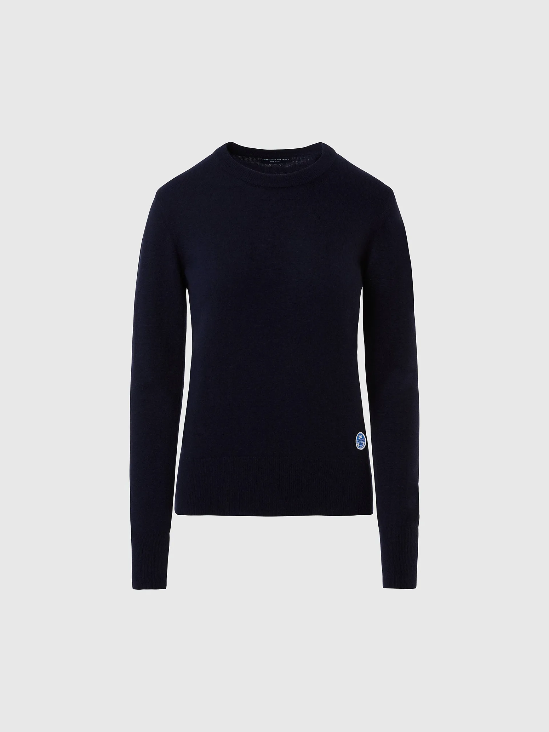 Il maglione da donna che combina design accogliente e ispirazione nautica. Il modello si caratterizza per l'intarsio a maxi righe bicolor che richiama le nostre origini legate alla vela ed è realizzato in misto cashmere riciclato, morbido sulla pelle e attento al pianeta. La sua silhouette rilassata e femminile è rifinita con bordi a costine e logo iconico al fondo.