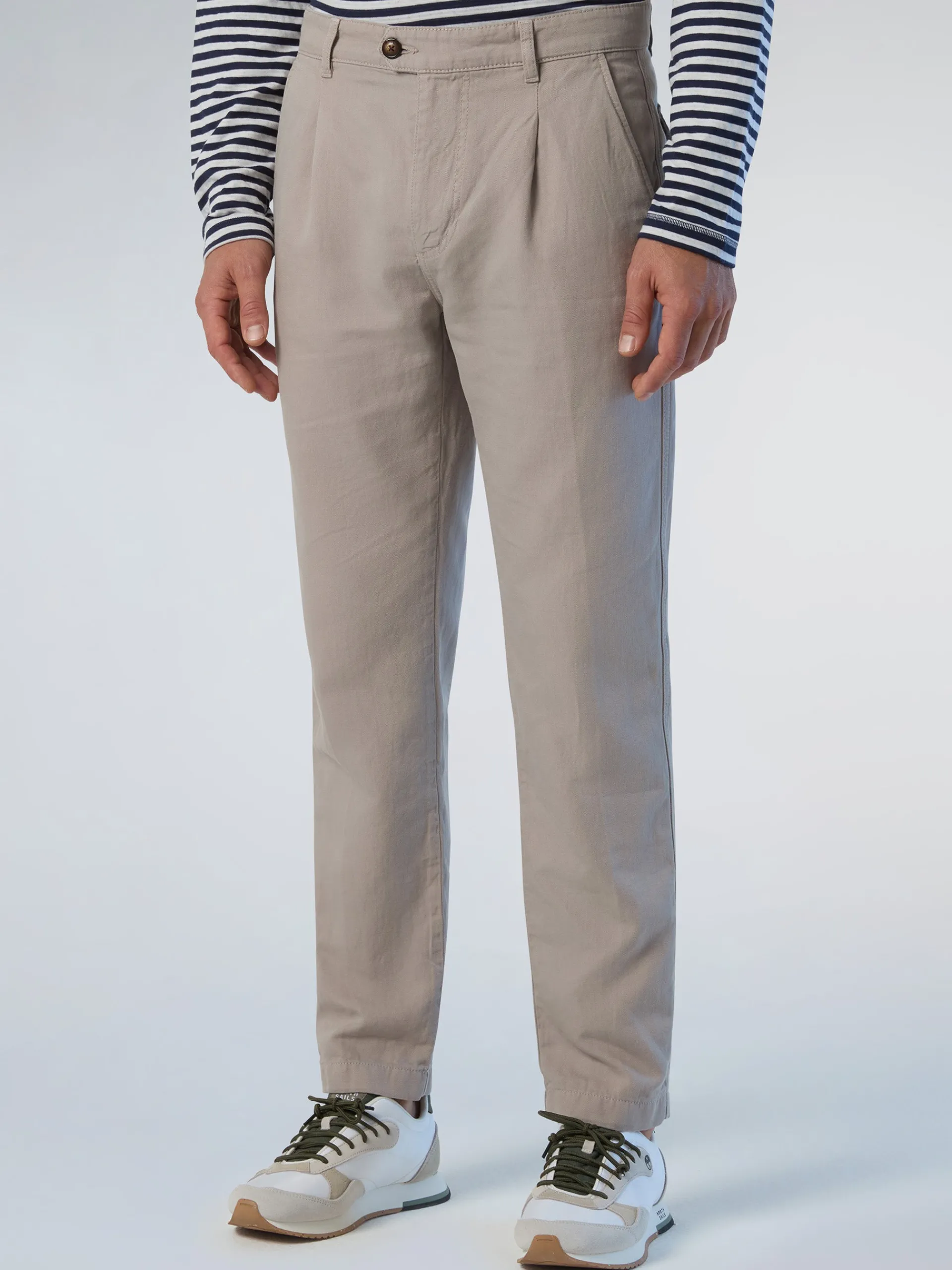 Mischief sono i pantaloni chino dall'eleganza ricercata ma funzionale. Il modello è realizzato in pregiato tessuto Panama che unisce cotone organico e lino: una texture fresca, leggera e anche attenta al pianeta. La tasca applicata sul lato e le tasche con patta sul retro aggiungono un tocco casual, mentre la patch con logo tono su tono è un elemento iconico North Sails.