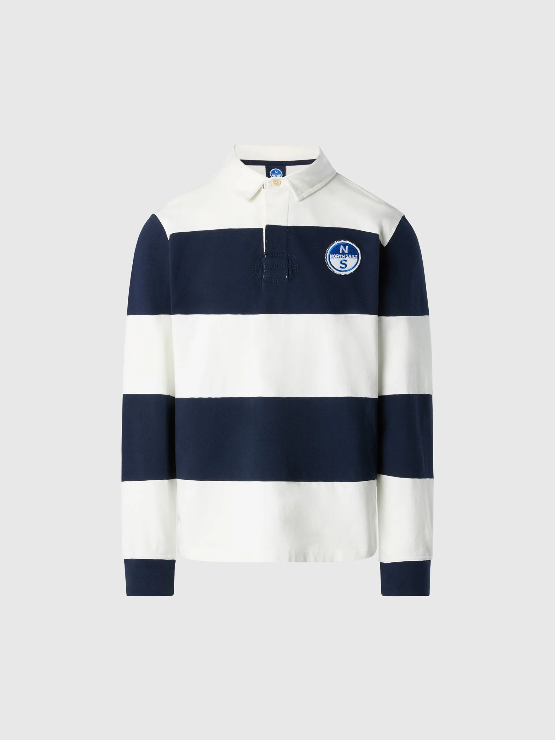 La polo a righe in stile rugby perfetta da indossare con i pantaloni chino e i jeans. Il modello è realizzato in cotone organico che riduce le emissioni e lo spreco di acqua rispetto alle fibre tradizionali. Si caratterizza per il motivo a righe color block, il colletto in twill tinta unita e la chiusura coperta. La maxi patch sul petto è il tocco iconico North Sails.